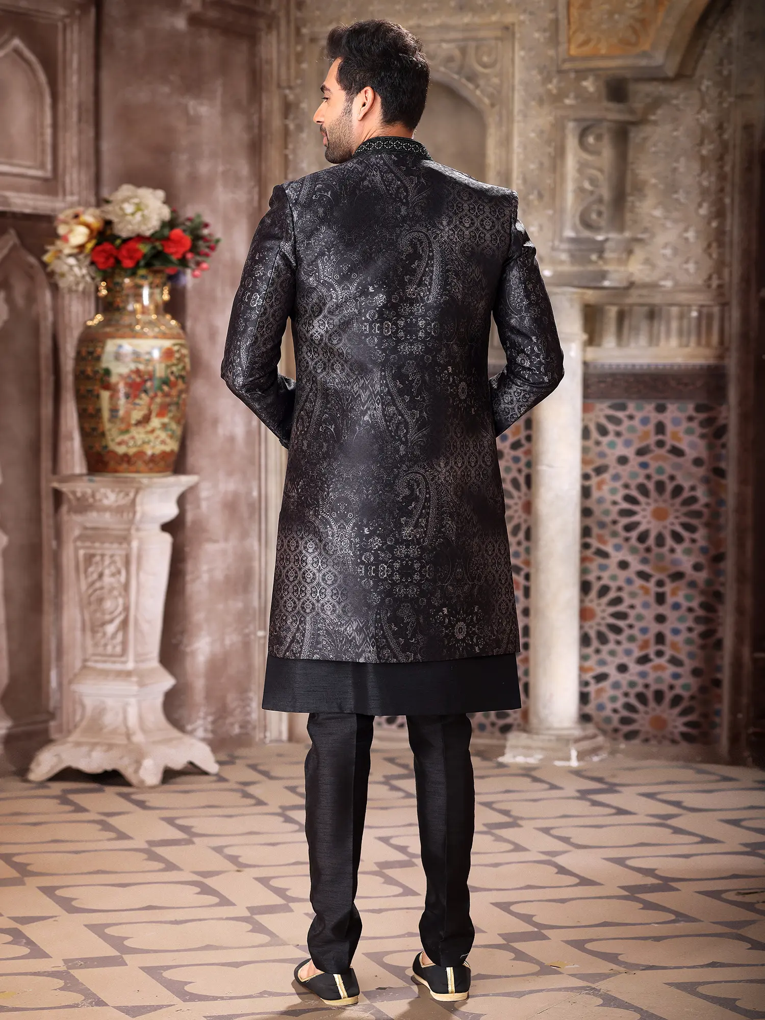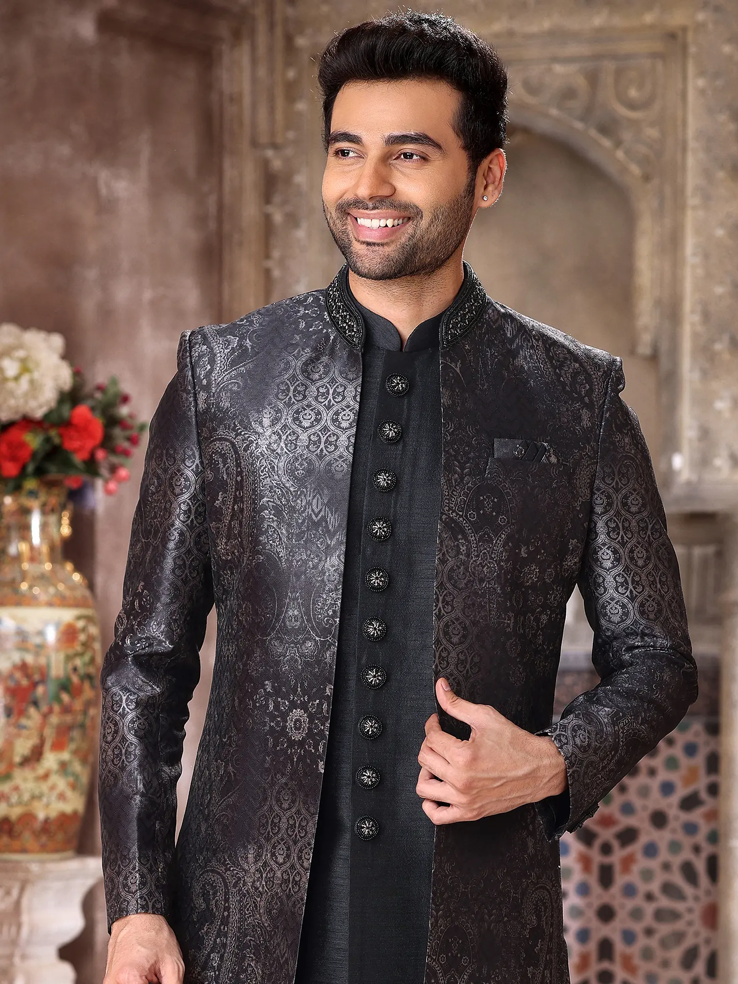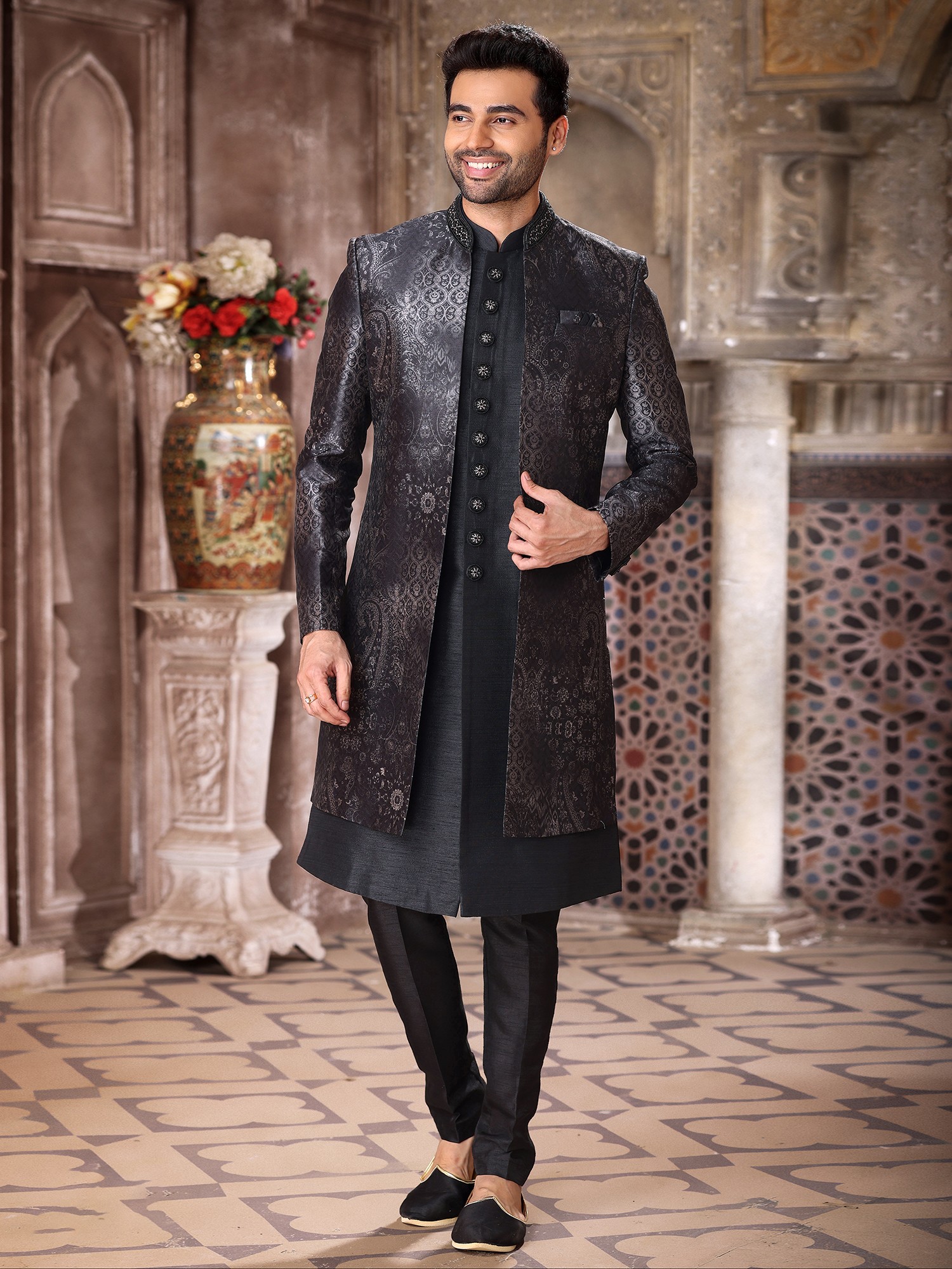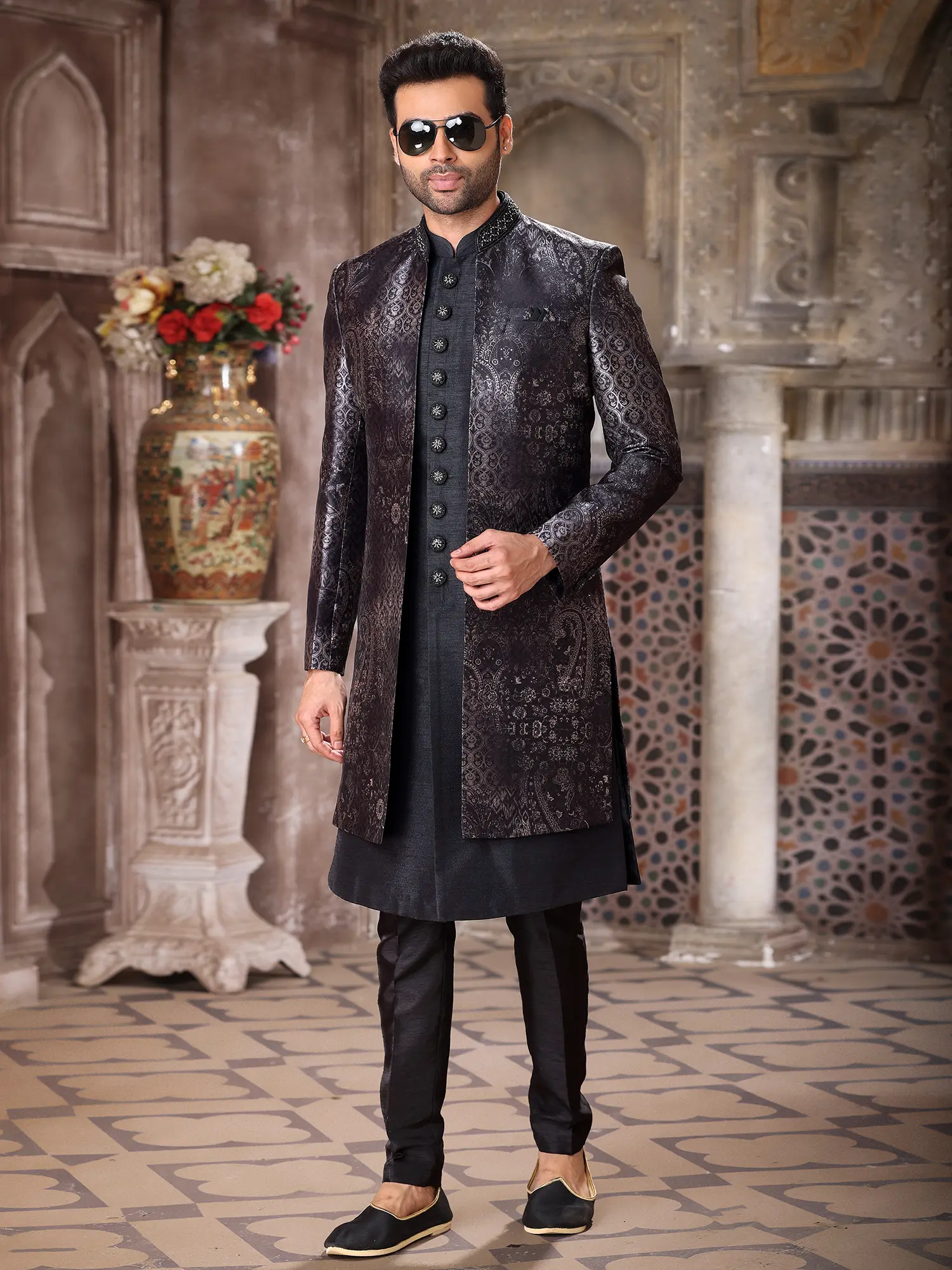 Elegant Art Silk Brocade Three Piece Indo Jacket Set With Aligarhi Pant Dazzles Grooms With Timeless Wedding Luxury