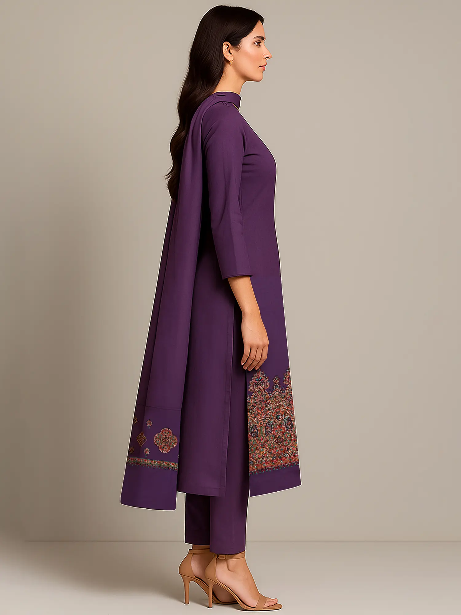 The true artistry of this set lies in its dense, multicolor thread embroidery. The neckline of the kameez is adorned with a rich tapestry of threads, creating a captivating focal point. This detailed work cascades down the hem of the kameez, forming a striking border that is both elaborate and refined. The embroidery is not just decorative; it's a work of art that showcases intricate patterns and a harmonious blend of vibrant colors, making each stitch a celebration of traditional techniques. The dupatta complements this, featuring a complementary embroidered border that echoes the richness of the kameez.