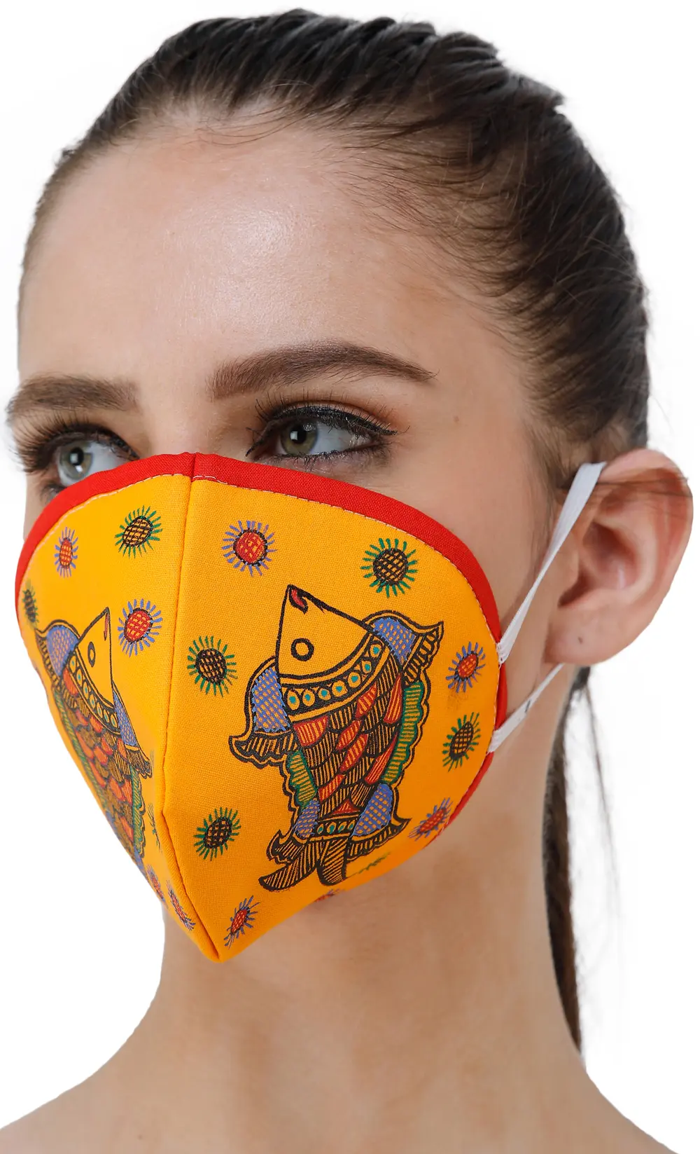 Three Ply Cotton Fashion Mask with Hand-Painted Madhubani Motifs (Big-Fishes)
