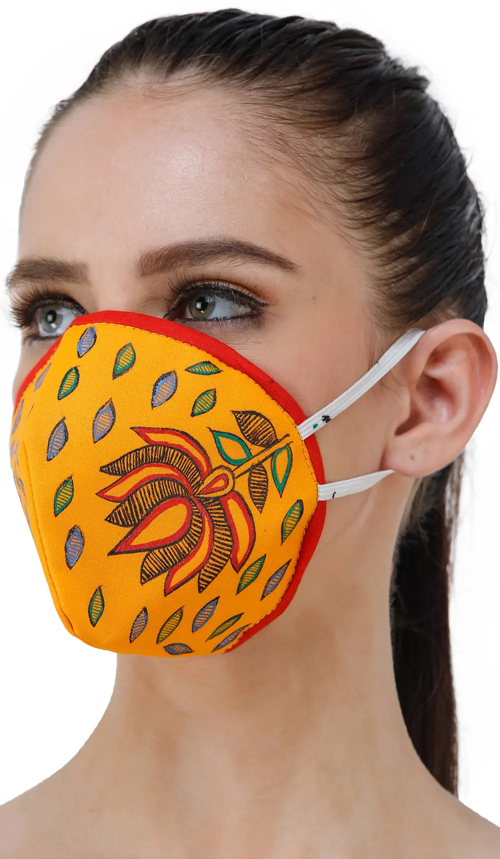 Three Ply Cotton Fashion Mask with Hand-Painted Madhubani Motifs (Ornated-Flowers)