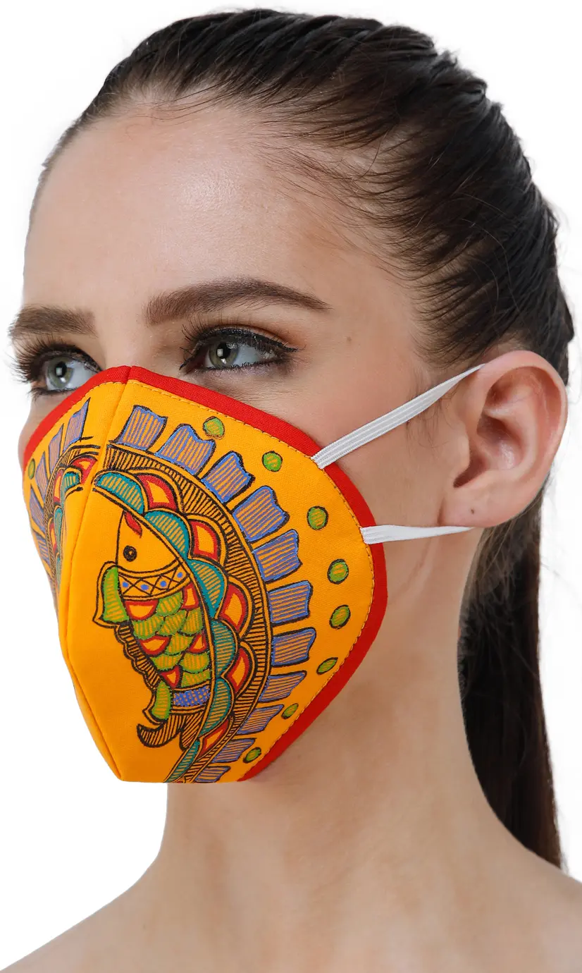 Three Ply Cotton Fashion Mask with Hand-Painted Madhubani Motifs (Ornated-Fish)