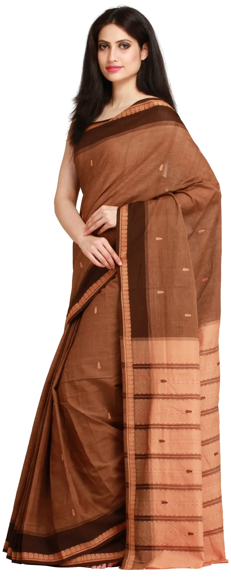 Embrace the understated elegance of traditional Indian textiles with this exquisite cotton saree, originating from the vibrant weaving centers of Bangalore. The rich, thrush-brown hue of the fabric evokes the grounding warmth of nature, making it a versatile and sophisticated choice for any occasion. Crafted from pure cotton, this saree promises breathability and comfort, ensuring you feel as good as you look. Its natural fibers drape beautifully, creating a graceful silhouette that is both classic and contemporary.