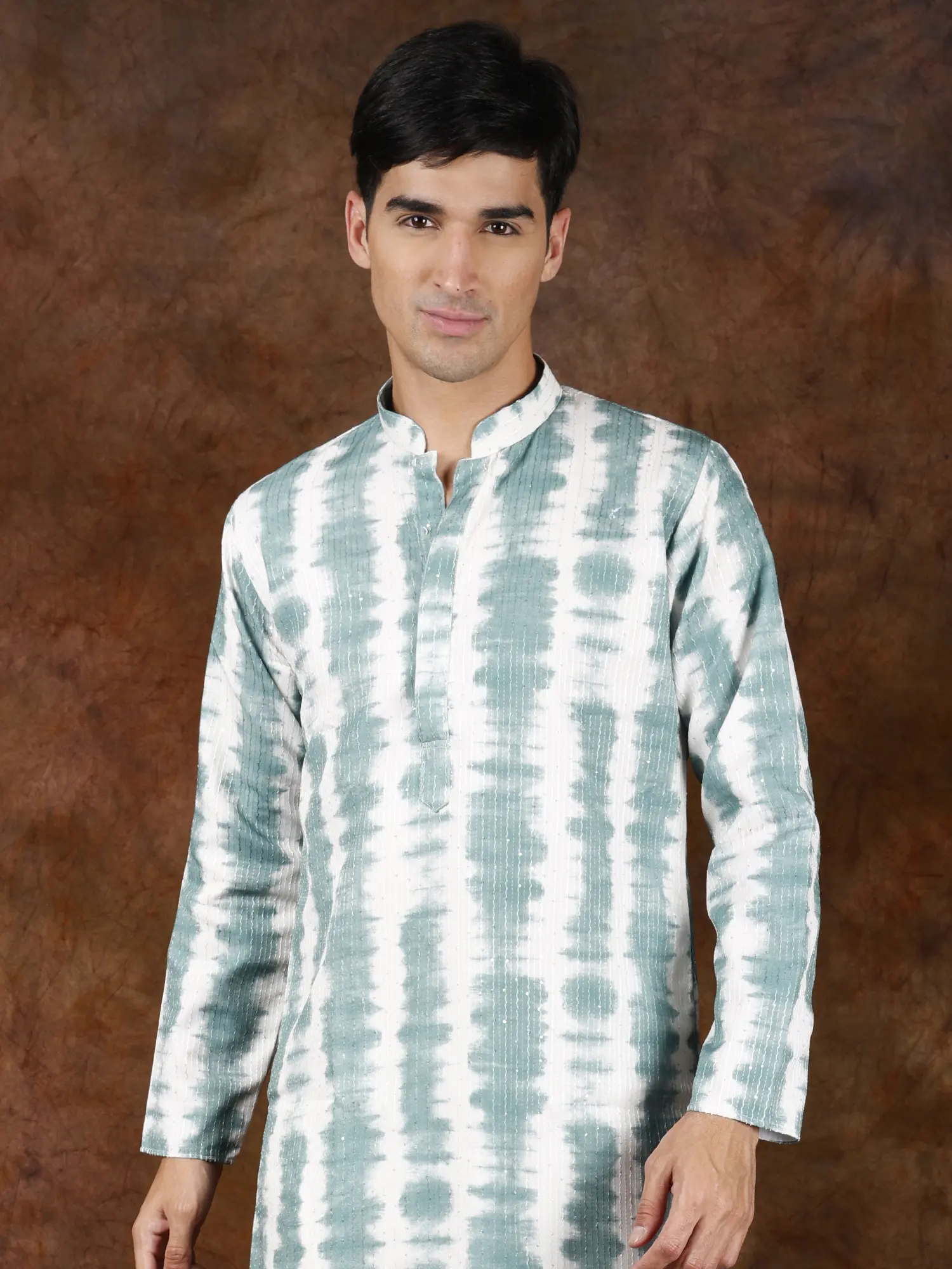 Discover a fresh take on traditional Indian menswear with this striking kurta pajama set. The classic silhouette is elevated by a contemporary tie-dye print, featuring a dynamic pattern of earthy green and crisp white stripes that evoke a sense of relaxed sophistication. This distinctive design ensures you'll stand out from the crowd while staying true to timeless fashion.
