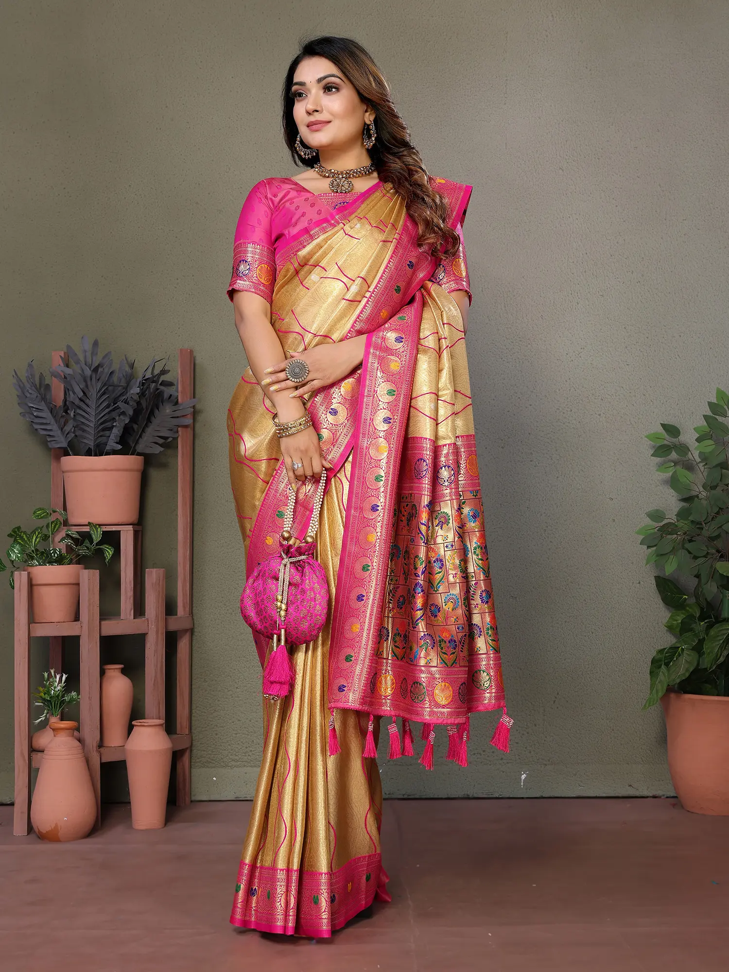 Stunning Floral Broad Border Weaving Work Soft Lichi Silk Saree With Contrast Tassel Pallu