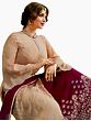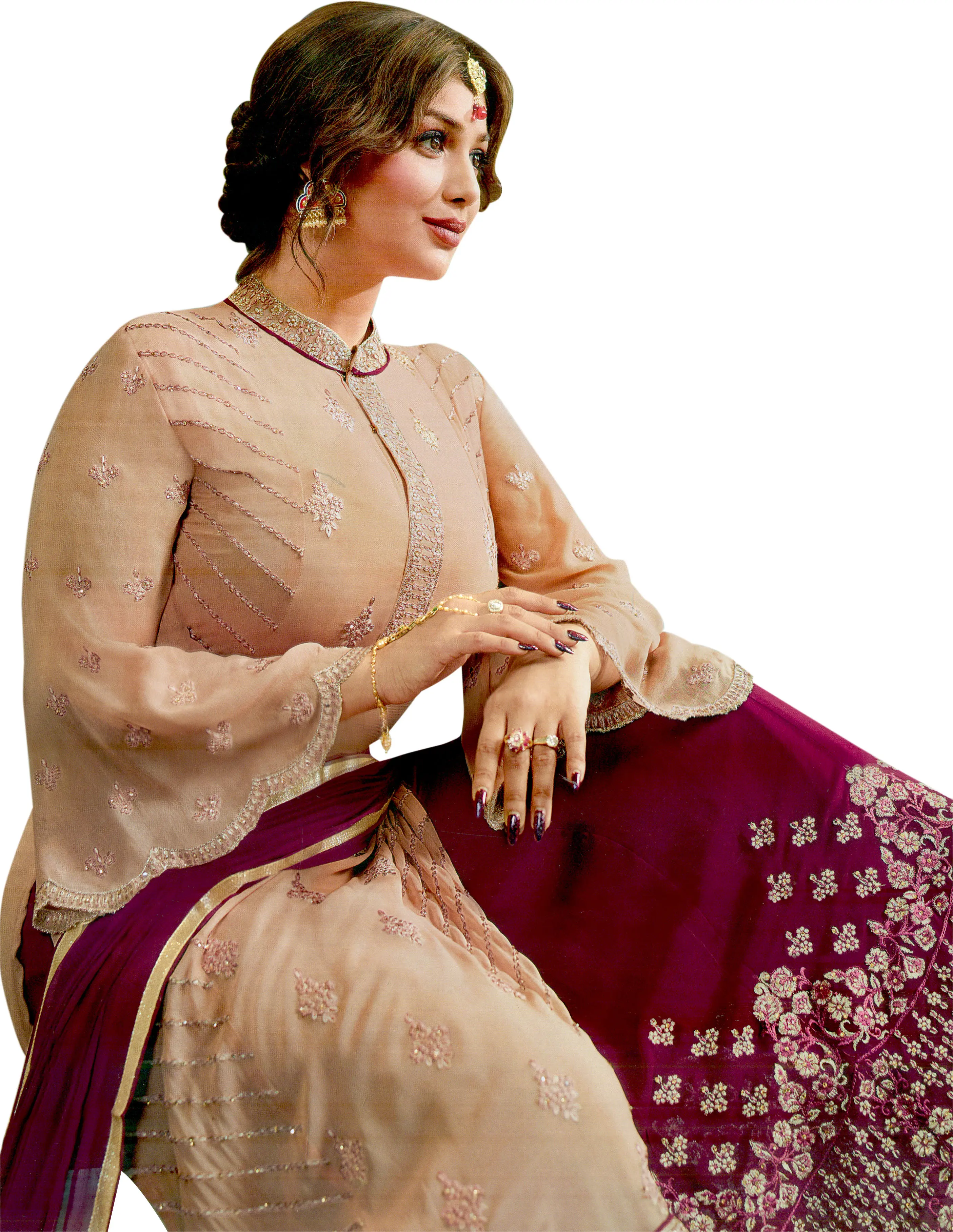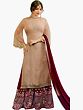 The accompanying skirt is a vision in rich maroon, a striking contrast to the subtle almond of the kameez. This lower garment is lavishly adorned with dense Zari embroidery, creating a captivating tapestry of floral designs and intricate patterns. The juxtaposition of the sheer georgette kameez with the richly textured skirt creates a dynamic visual appeal, making this ensemble perfect for celebratory occasions. A coordinating dupatta, in a deep maroon hue, complements the outfit. Its sheer georgette fabric allows for graceful draping, and it is edged with a Zari border that mirrors the embellishments on the kameez and skirt, tying the entire look together seamlessly.