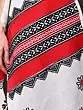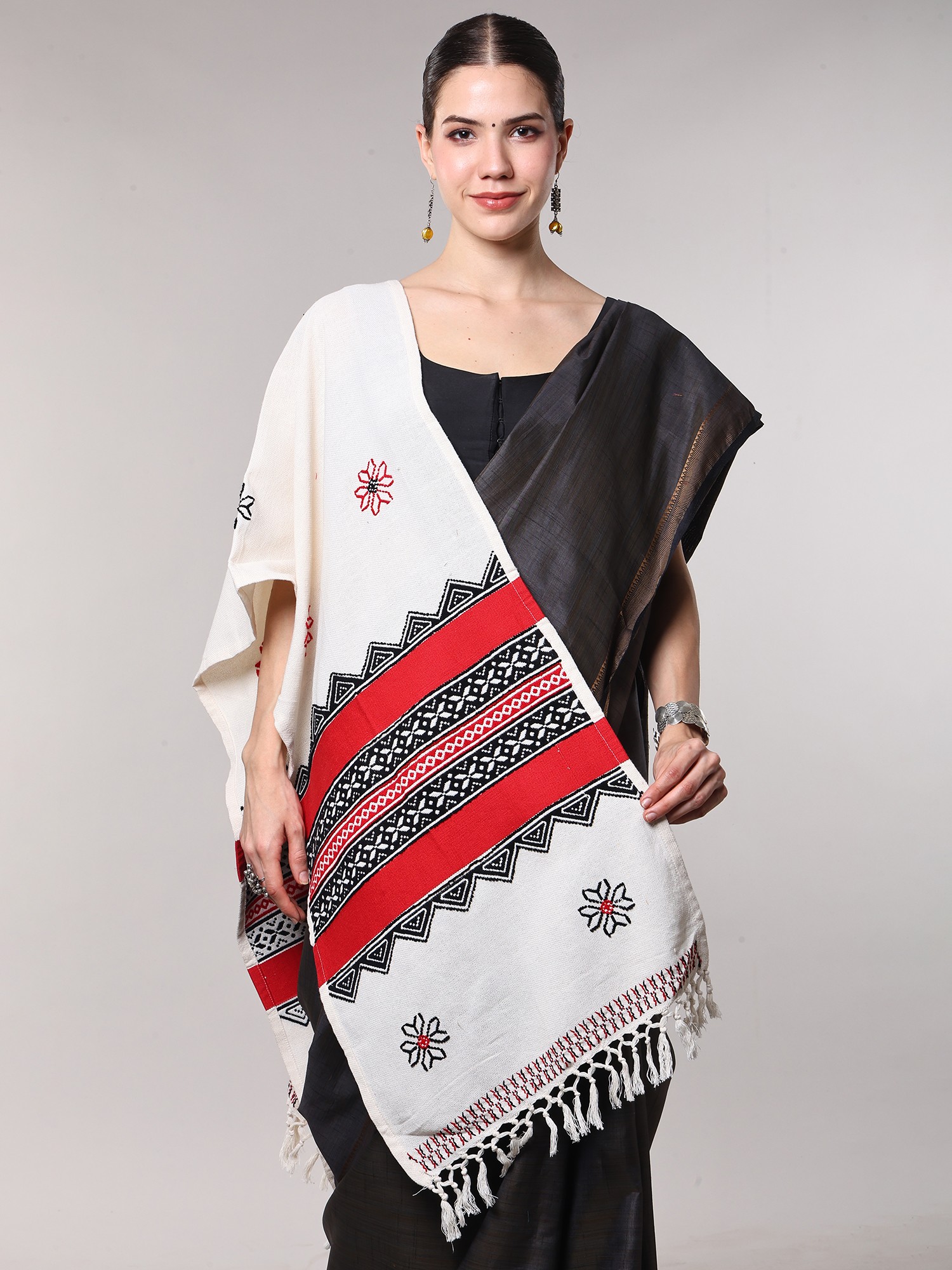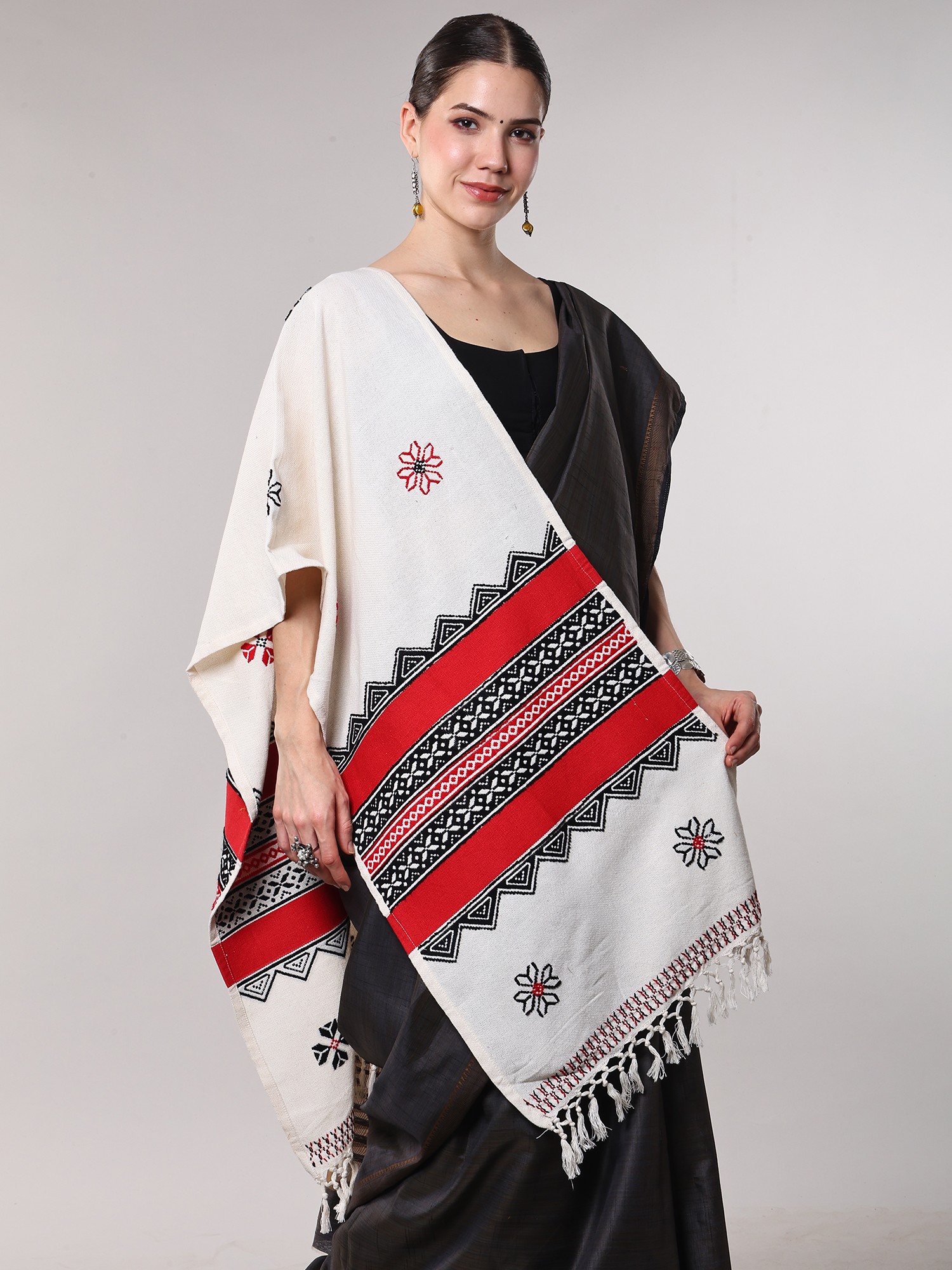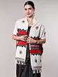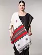 The traditional colors of Toda weave- white, red, and black, give the scarf a beautiful appeal, elevated by the geometrical and ethnic motifs.