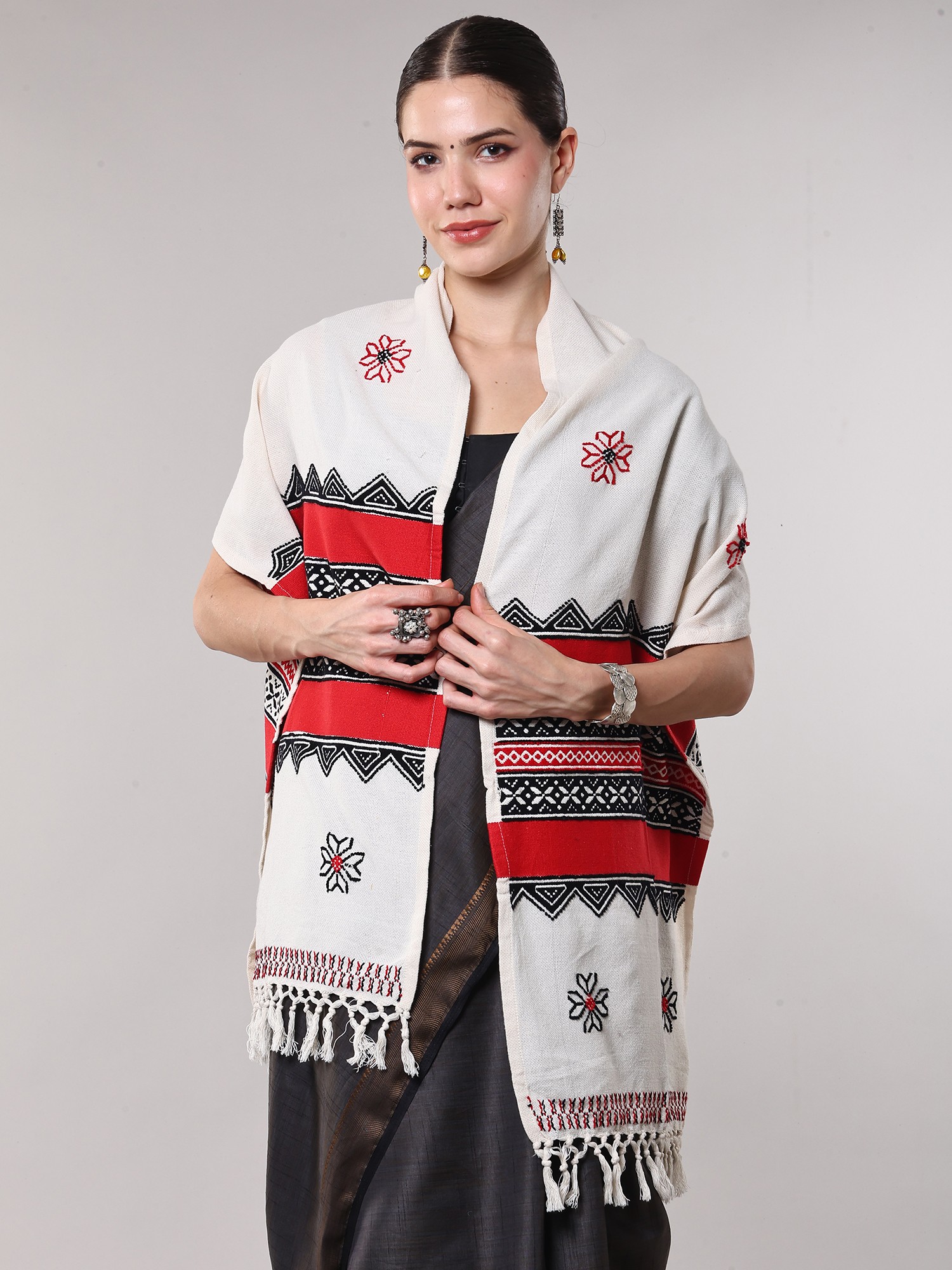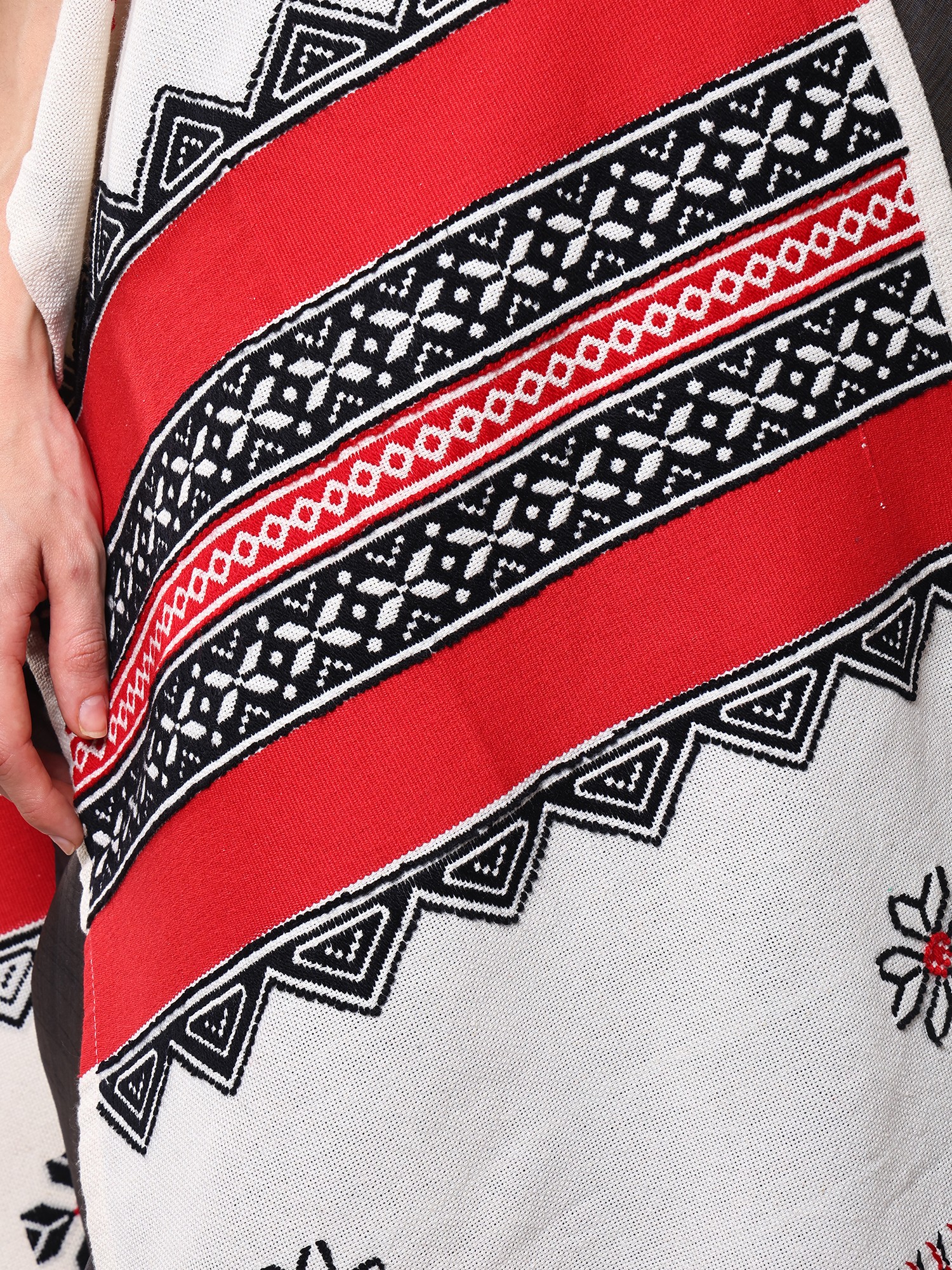 The beauty of this scarf lies in its detailed hand embroidery. Bold bands of rich red are interspersed with geometric patterns in black and white, creating a visually captivating design. At the heart of the scarf, you'll find the distinctive Toda motifs – stylized representations that hold deep meaning within their culture. These motifs, often inspired by nature and the community's way of life, are rendered with precision and care, showcasing the skill of the artisans. The delicate fringe at each end adds a final touch of traditional charm, swaying gently with your movement.