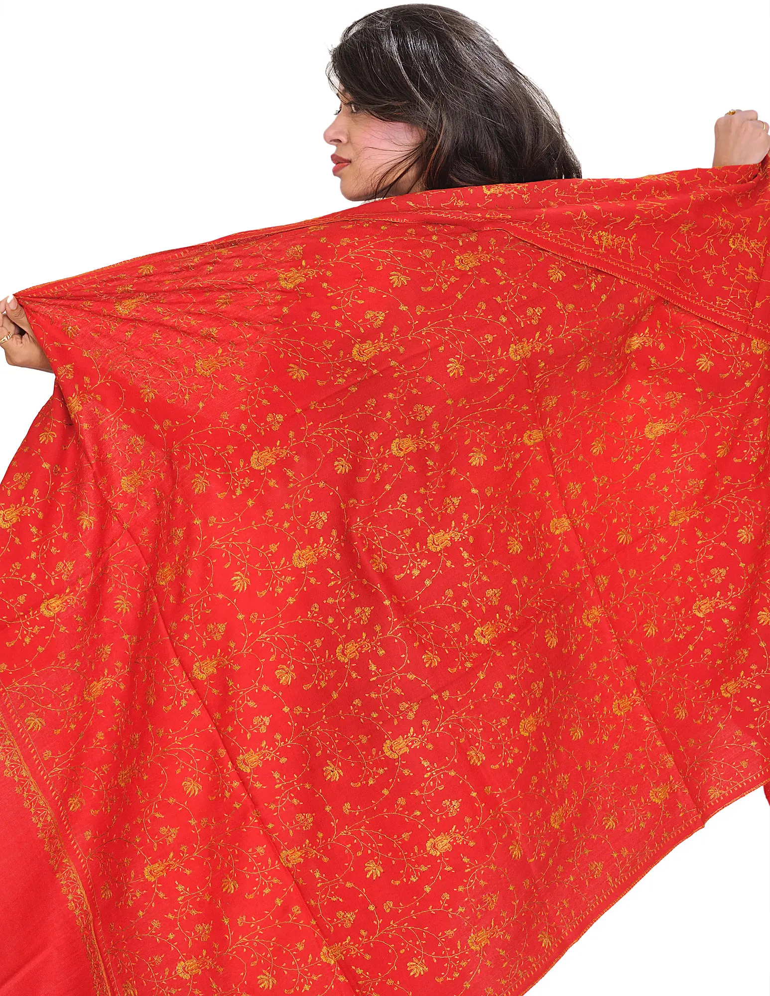 Cobblestone-Colored Plain Pure Pashmina Shawl from Kashmir with Sozni Embroidered Maple Leaves on Border