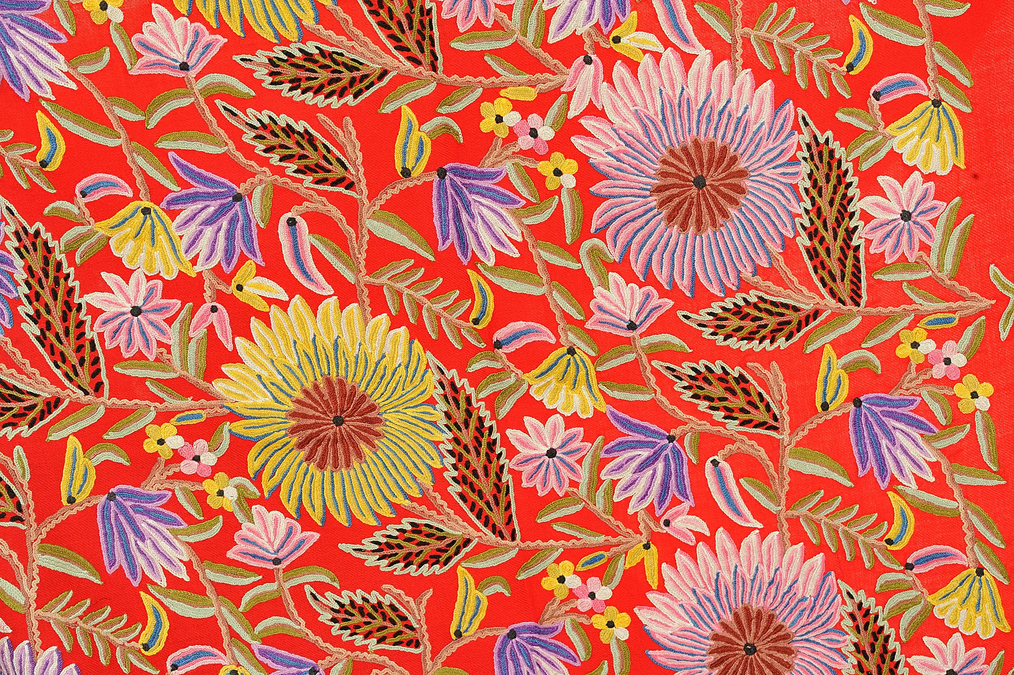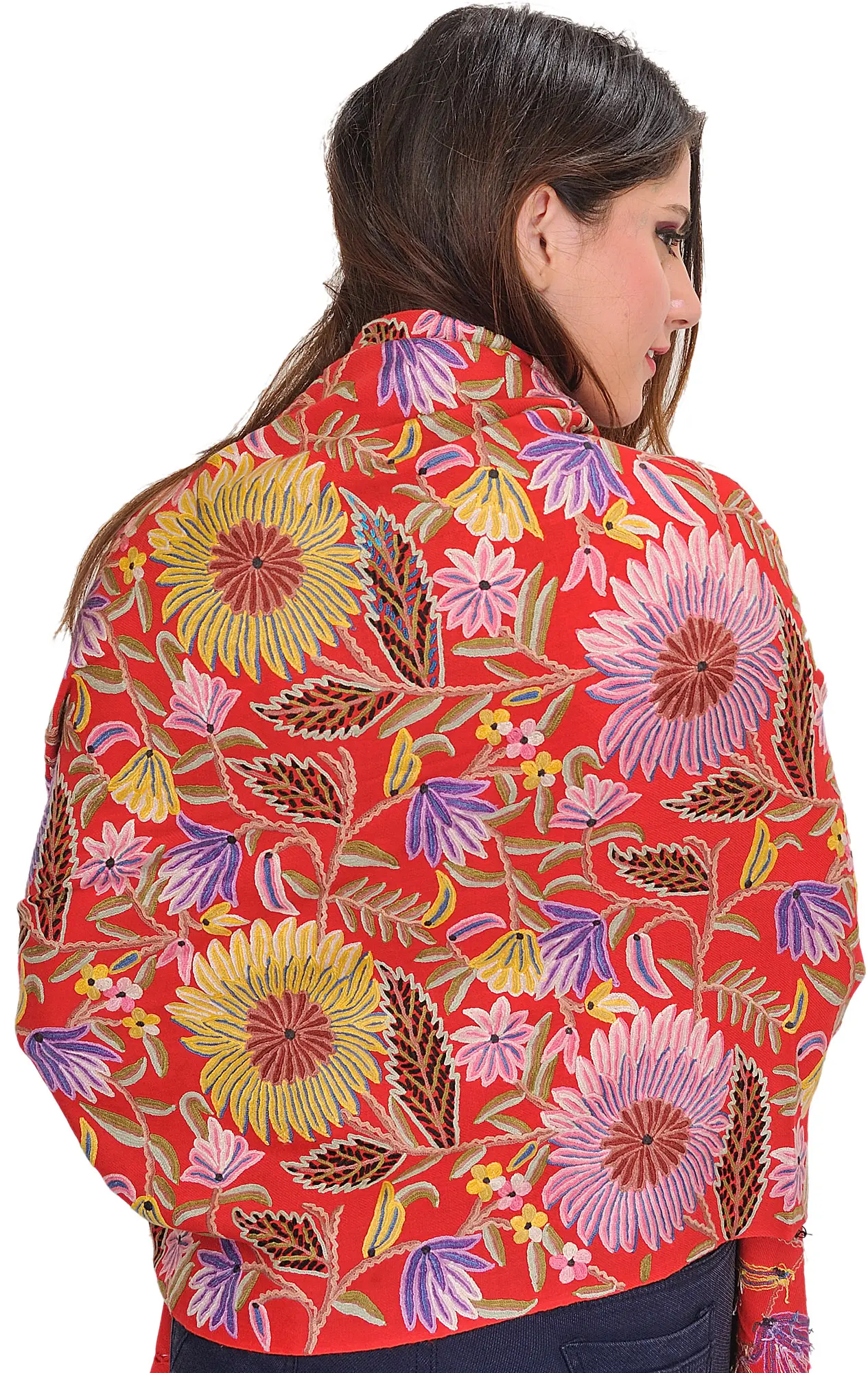 Discover the artistry and warmth of Kashmir with this exquisite tomato-red stole, a testament to traditional craftsmanship. Woven from the finest pure wool, this stole offers unparalleled softness and a luxurious feel against your skin, making it a cherished addition to any wardrobe. The vibrant tomato-red hue serves as a captivating canvas for the intricate Aari hand embroidery that adorns its entirety.