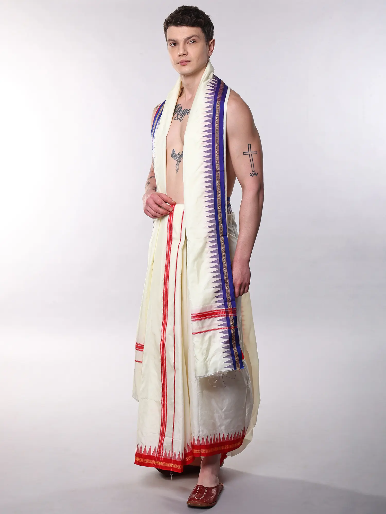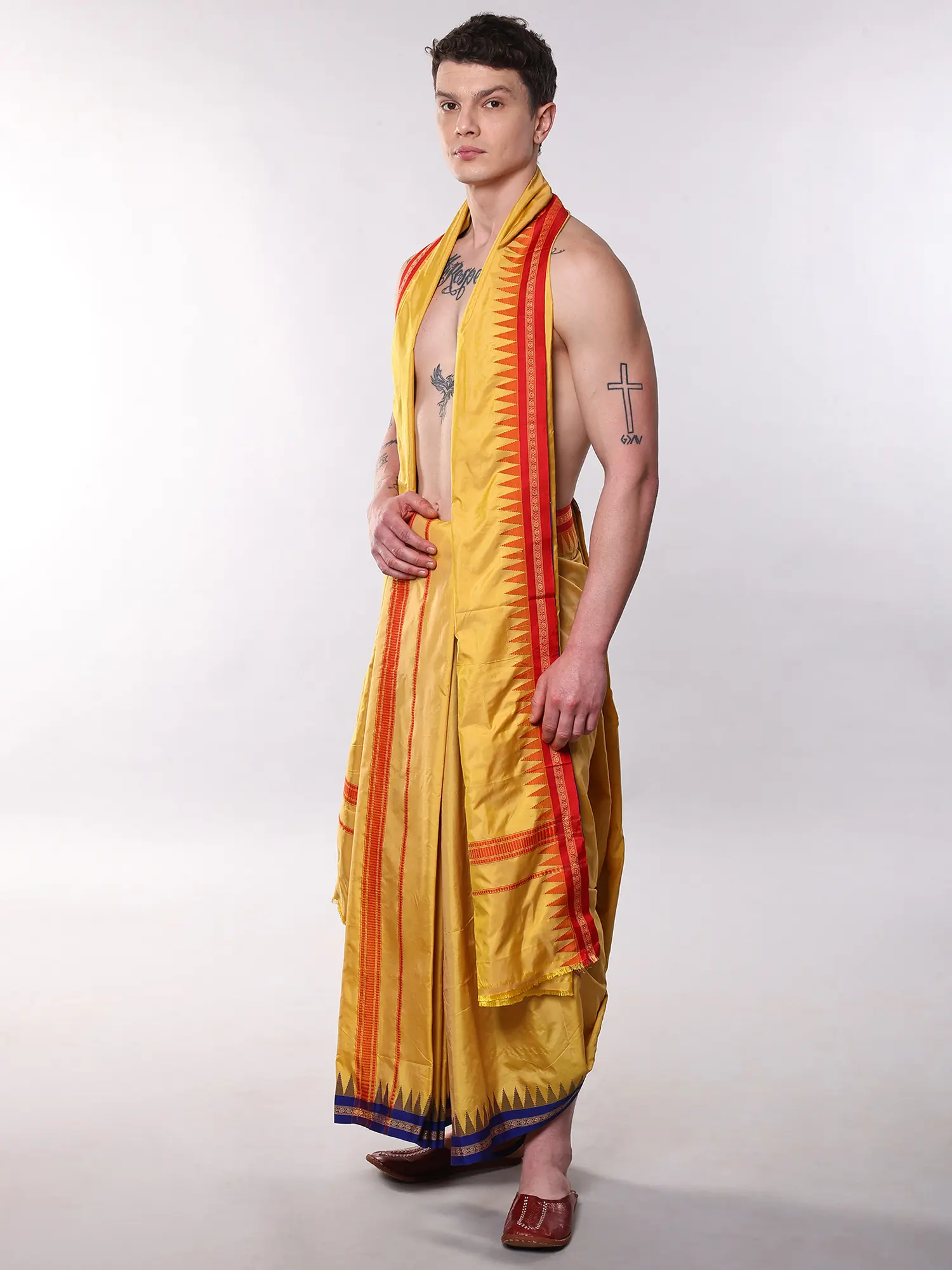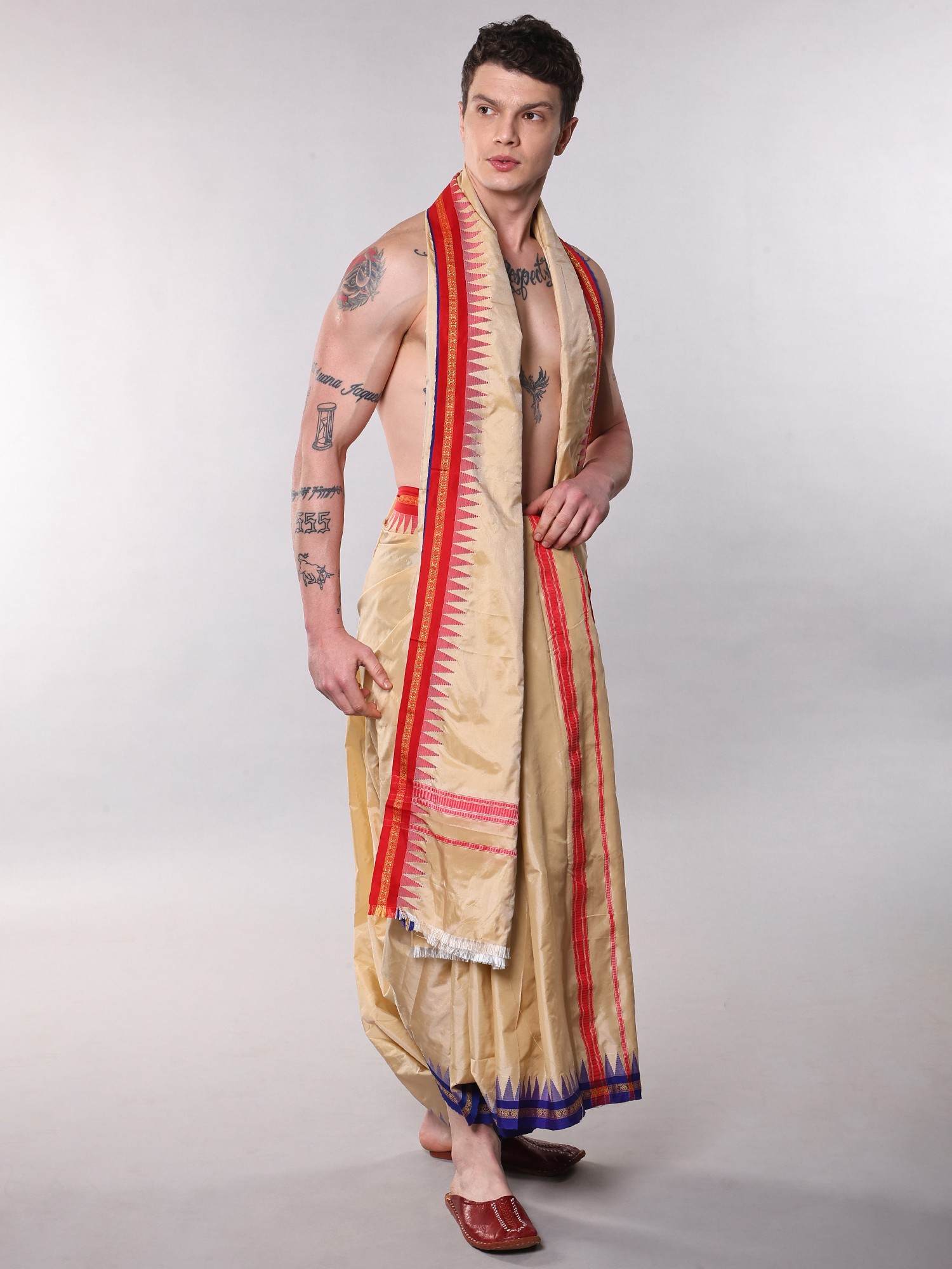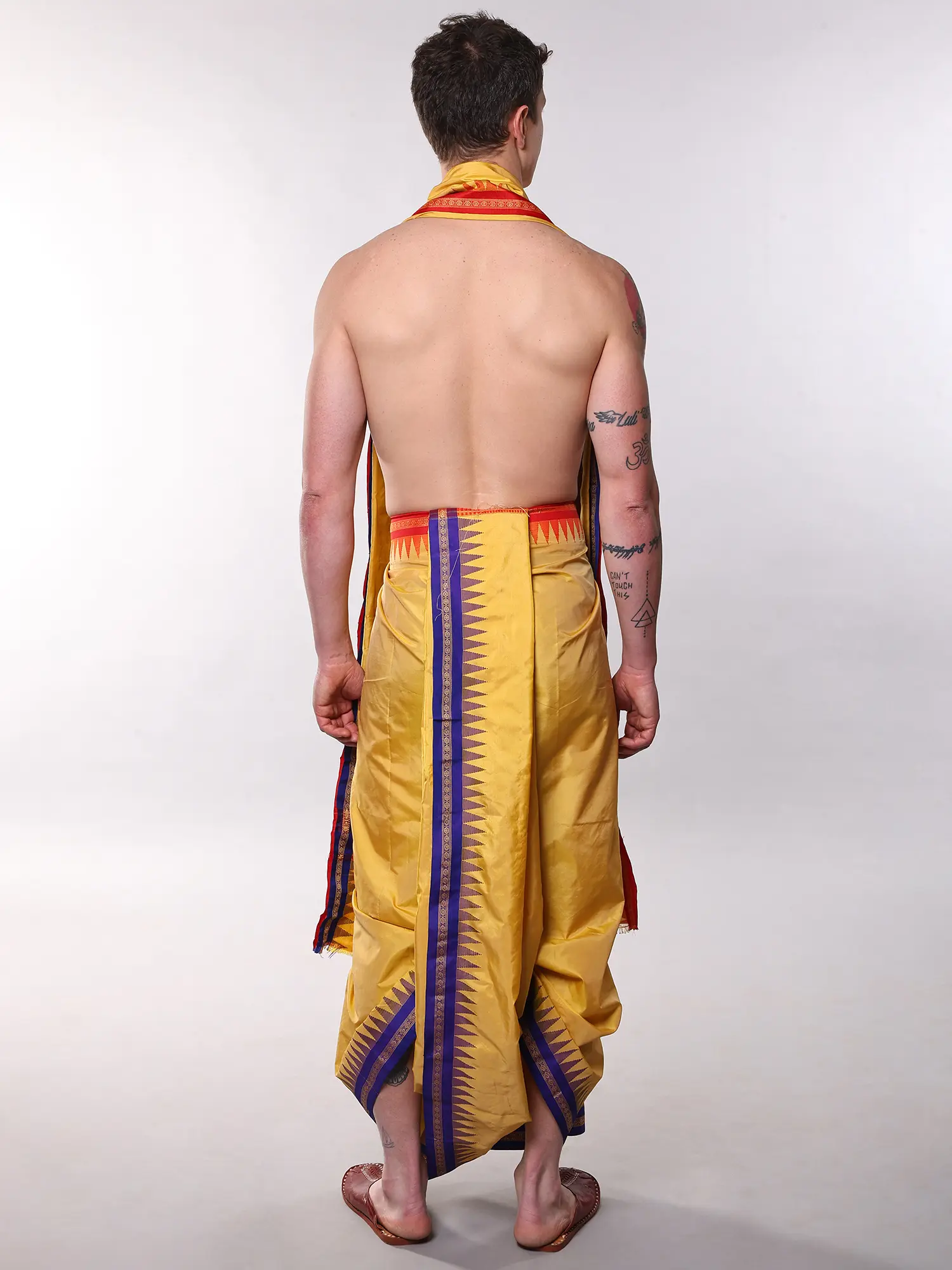Traditional Art Silk Dhoti and Angavastram Ensemble with Temple Border