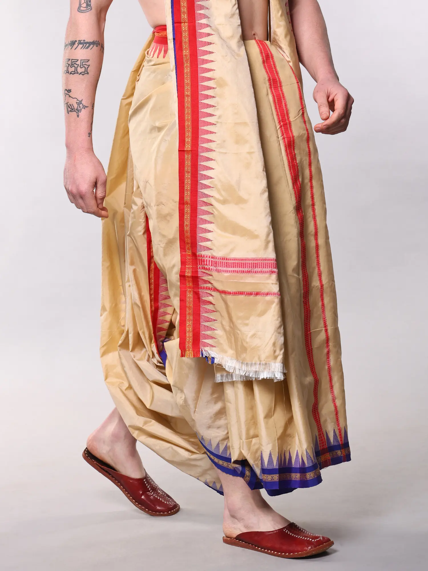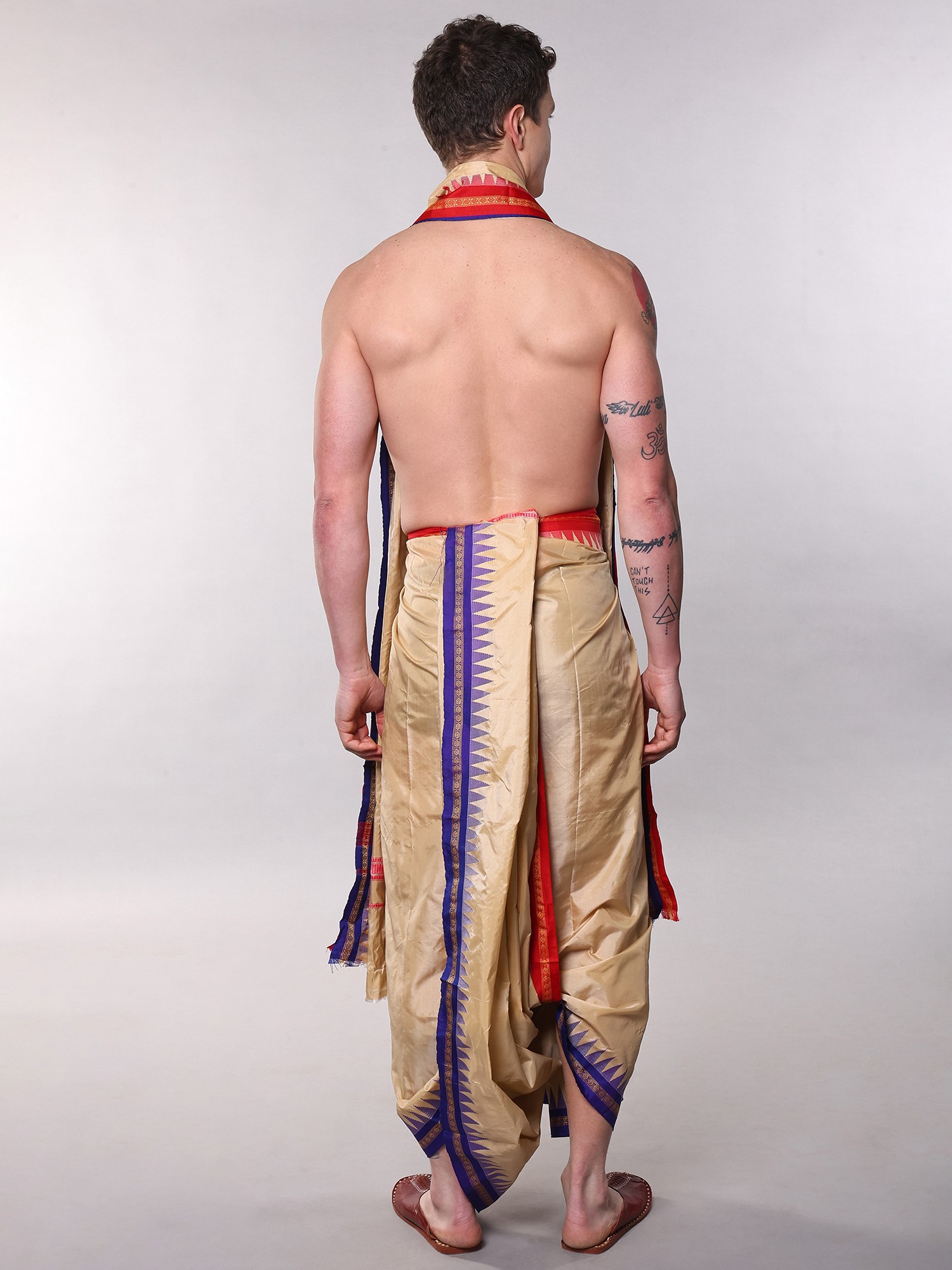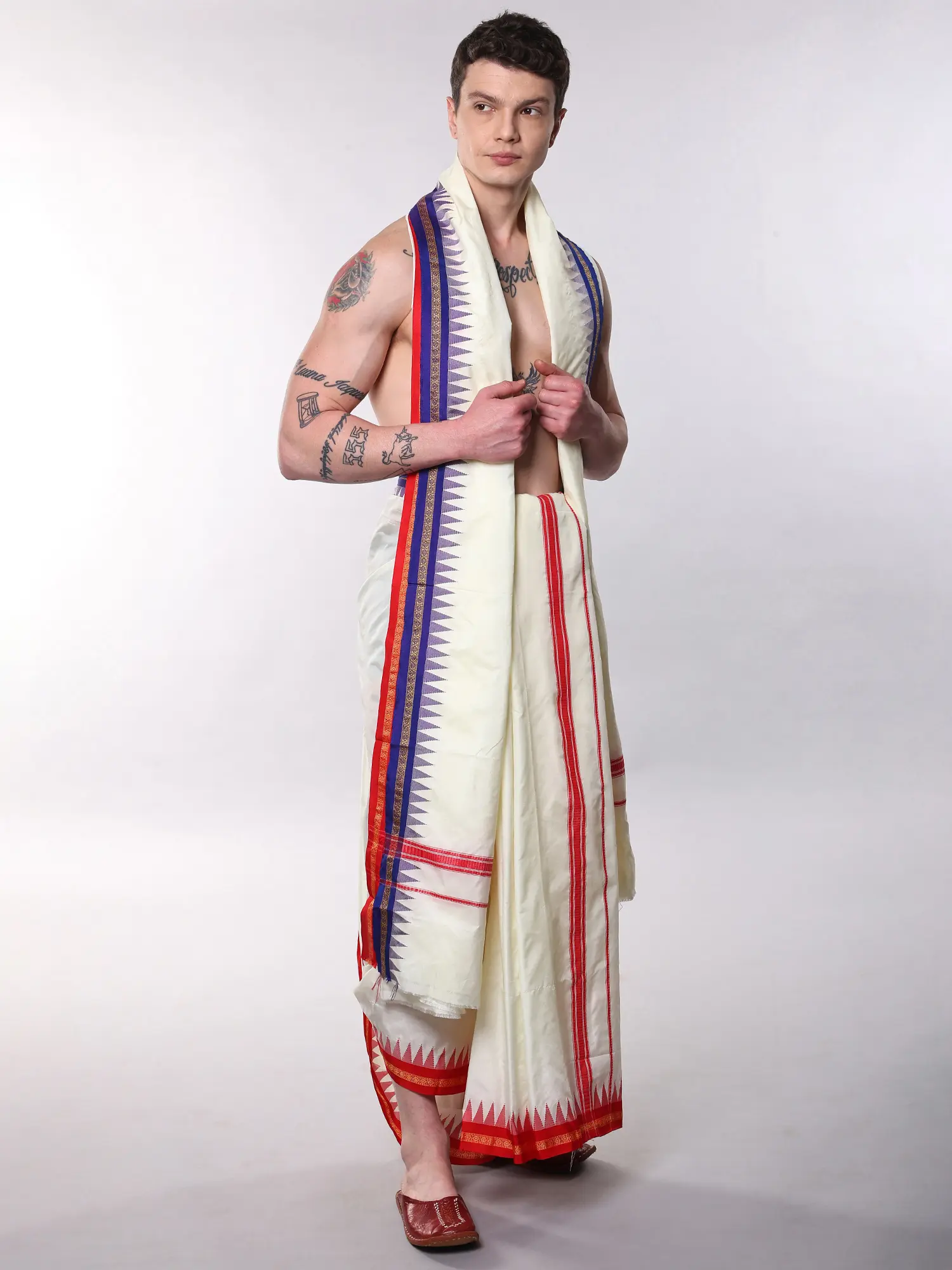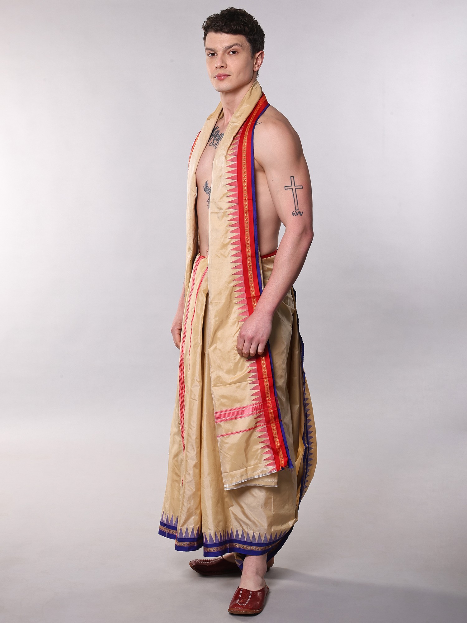 Traditional Art Silk Dhoti and Angavastram Ensemble with Temple Border
