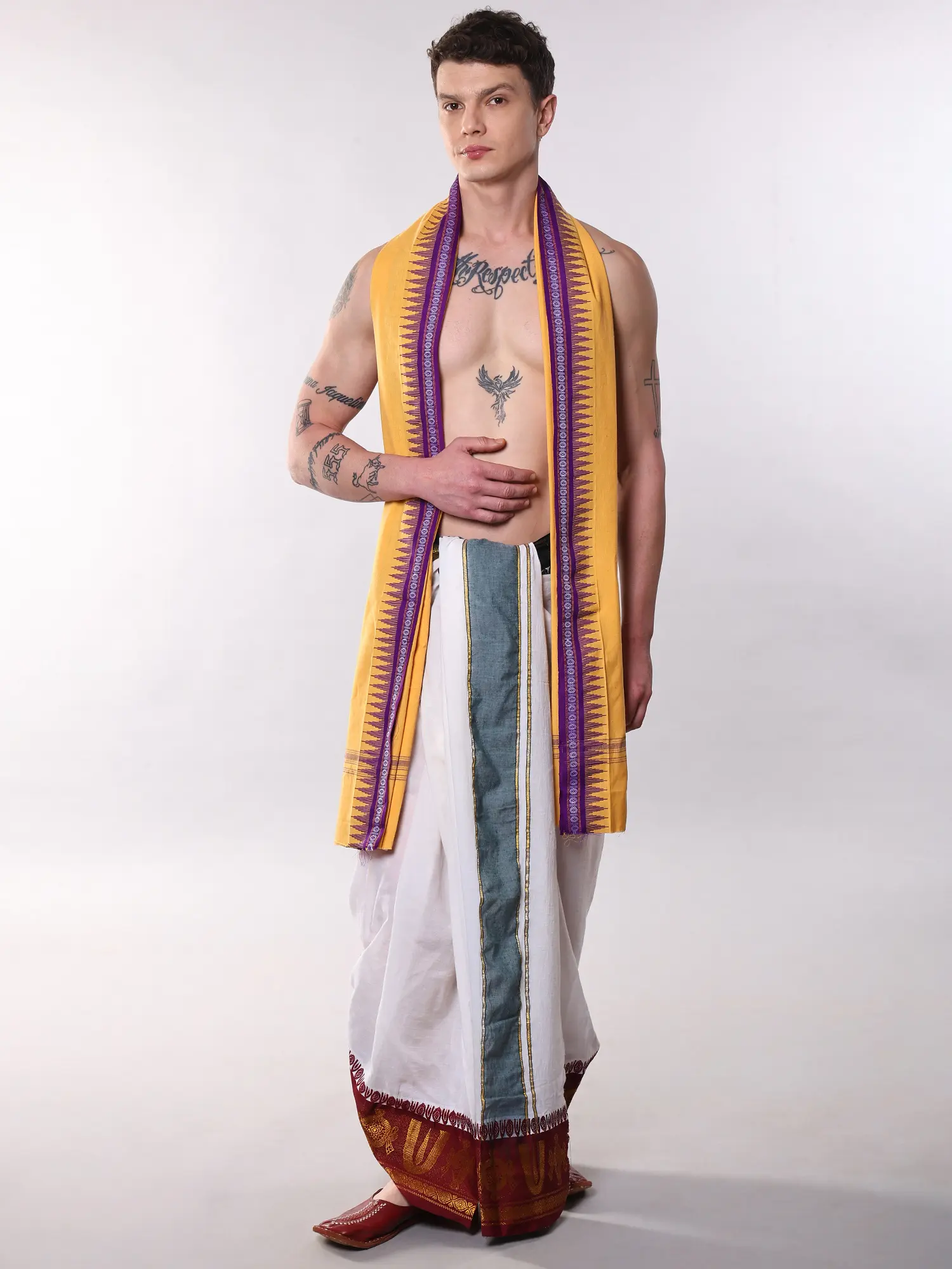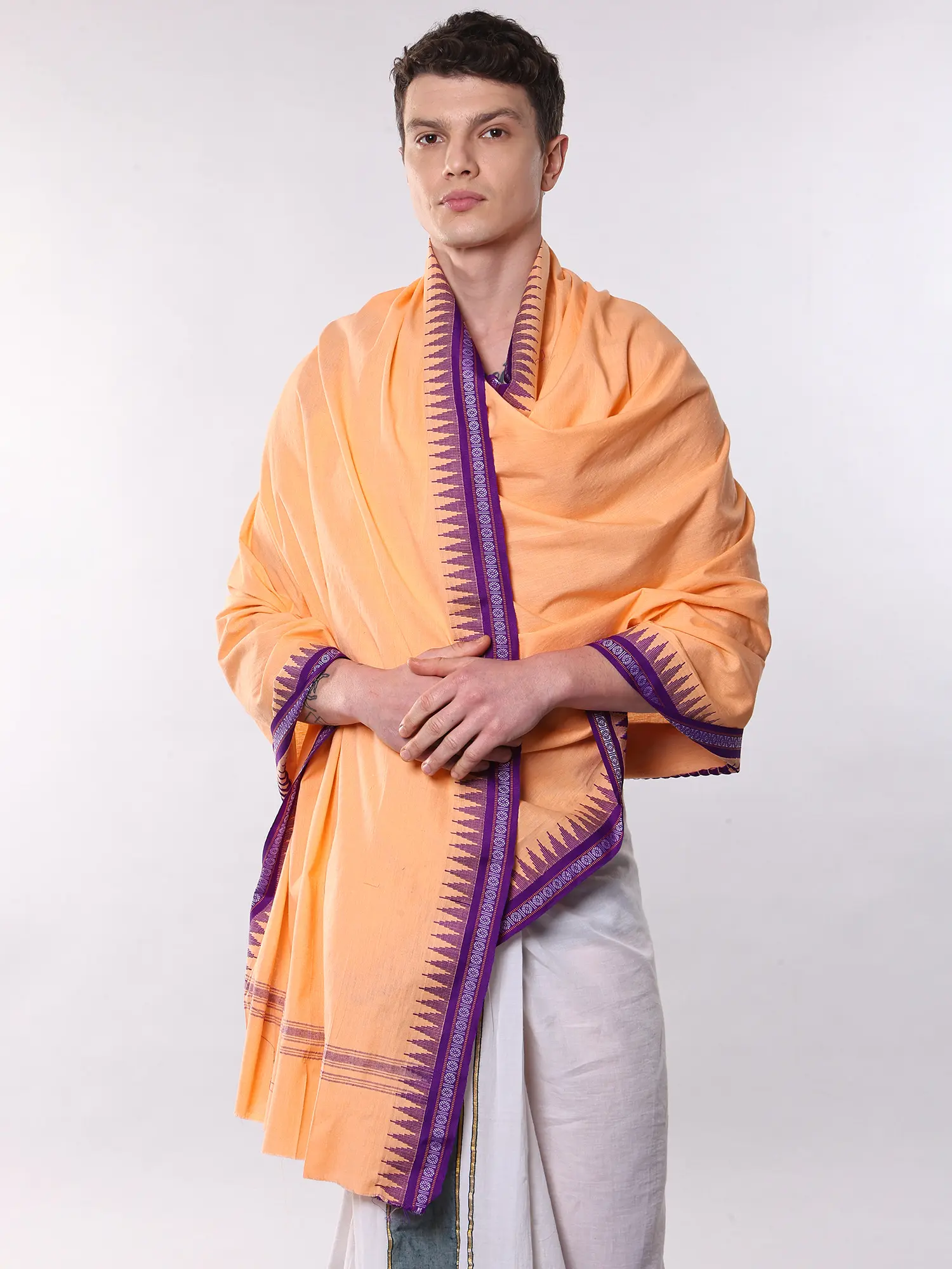 Imagine yourself draped in this exquisite piece during quiet contemplation, religious rituals, or festive celebrations. It drapes effortlessly over traditional attire, lending an air of sophistication and reverence, whether you are attending a temple service or enjoying a family gathering. You can also consider it as a distinguished accent to more contemporary ensembles, adding a unique cultural touch.