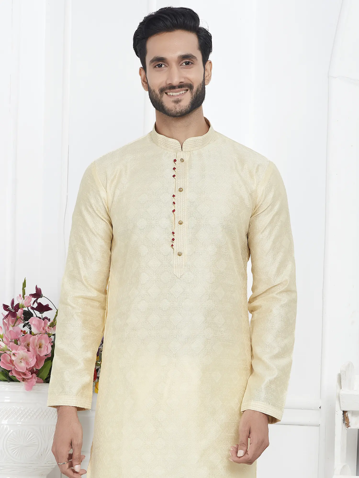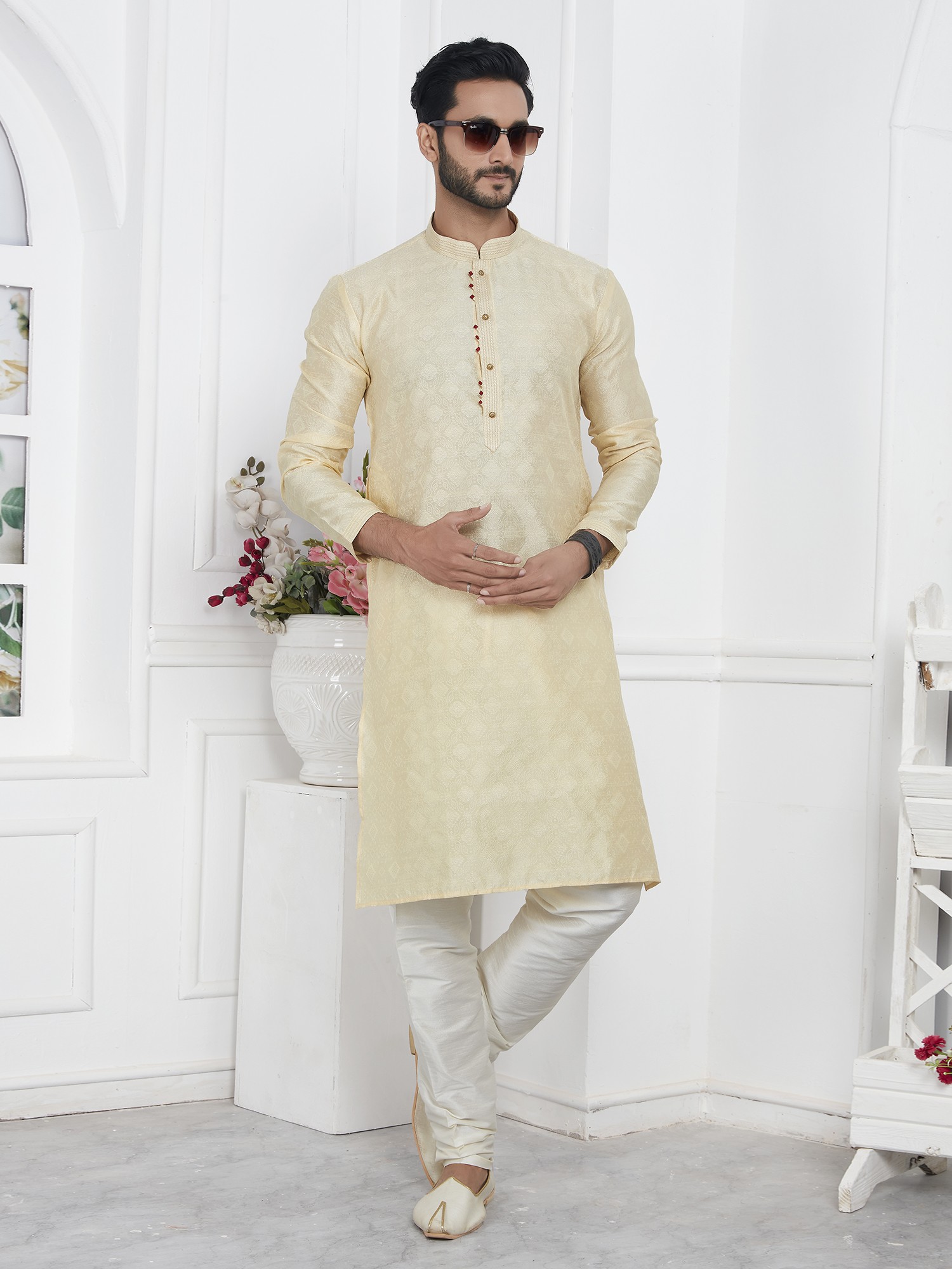 Attractive Straight Jacquard Silk Brocade Mandarin Collar Kurta Pajama Set