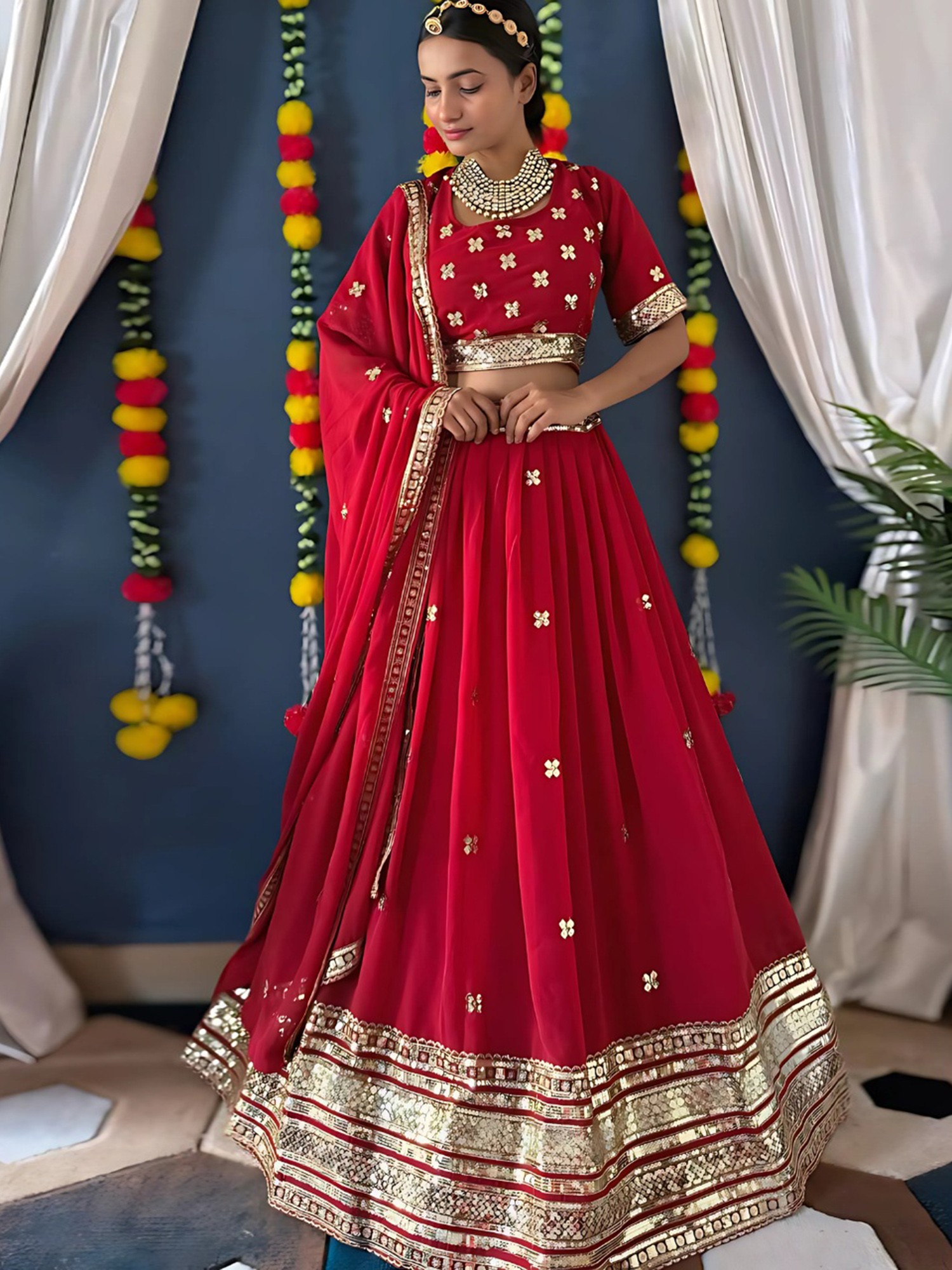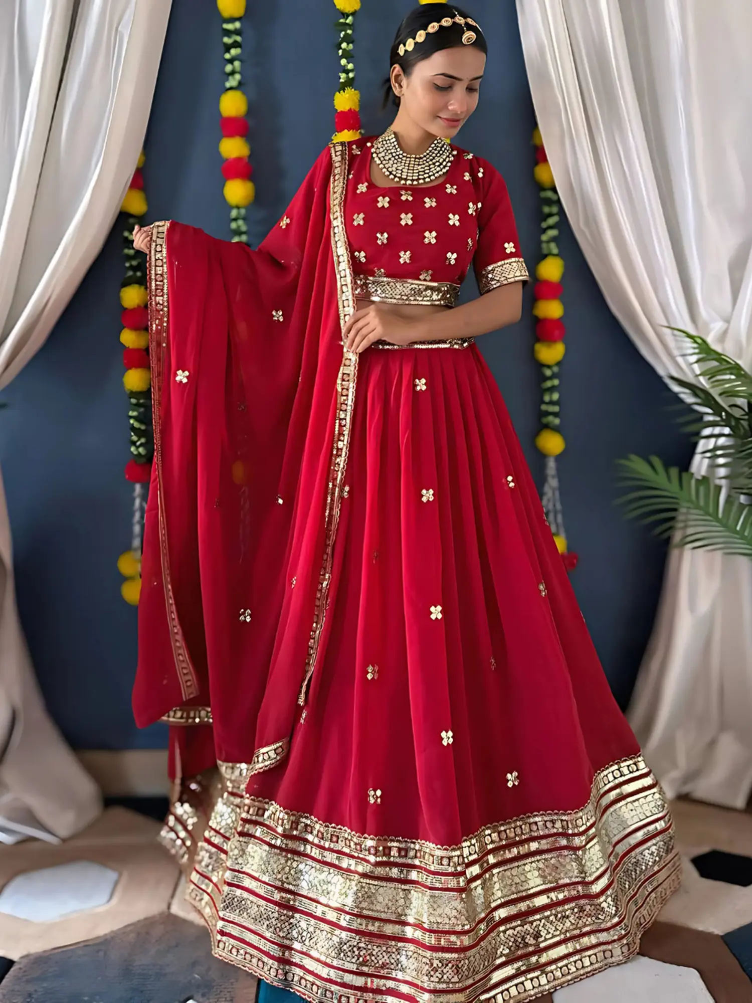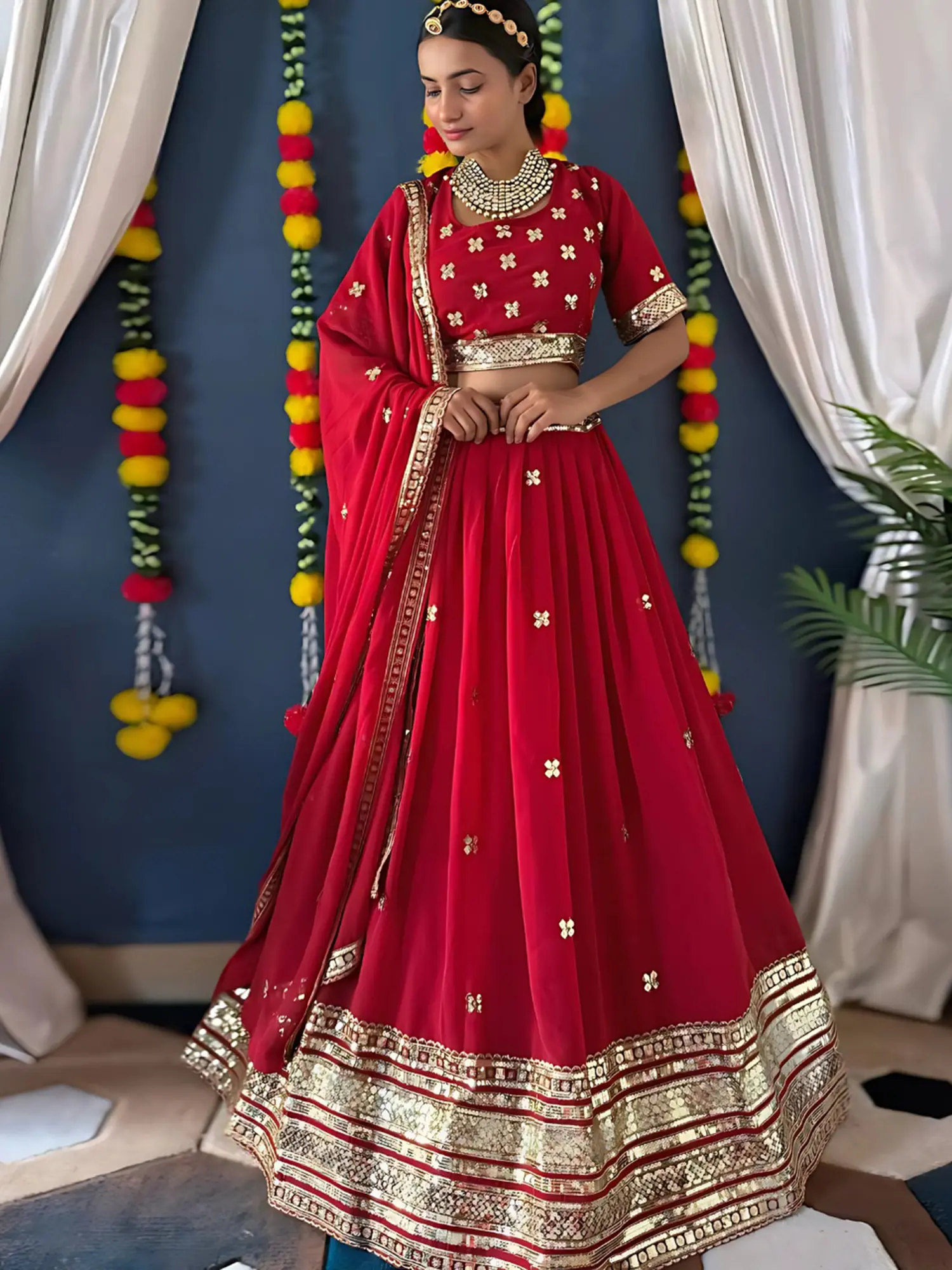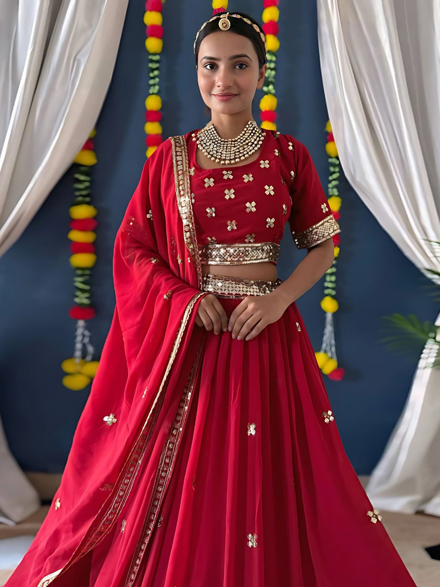Embrace the spirit of celebration with this exquisite red faux georgette lehenga choli, a perfect ensemble for any festive occasion. The rich, vibrant hue of red symbolizes joy, passion, and auspicious beginnings, making it an ideal choice for weddings, festivals, and grand gatherings. Crafted from a lightweight and flowing faux georgette fabric, this lehenga choli offers both comfort and an elegant drape, allowing you to move with grace and confidence throughout your event. The beauty of this outfit lies in its intricate detailing. The lehenga itself is adorned with delicate, scattered sequins that catch the light with every movement, adding a subtle yet captivating shimmer. Complementing the sequins are meticulously embroidered motifs, adding depth and texture to the fabric. These embellishments are thoughtfully placed to enhance the natural flow of the georgette, creating a harmonious blend of traditional craftsmanship and contemporary design.