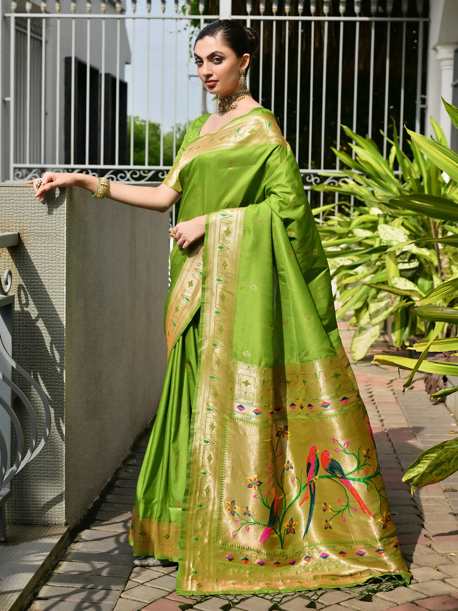 Traditional Green Paithani Silk Saree with Bird Motifs and Gold Zari