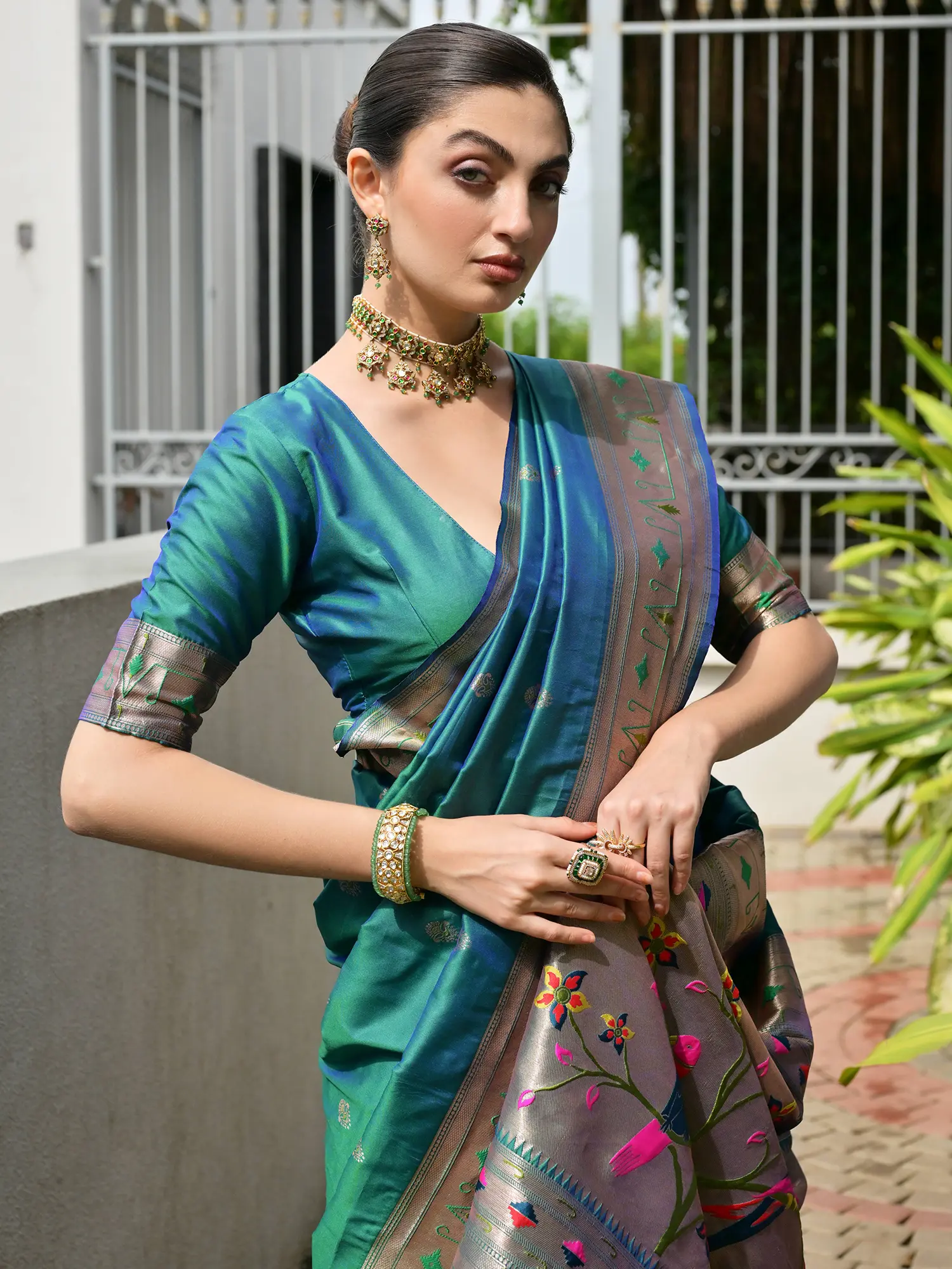 Features a vibrant green pure silk Paithani weave for a luxurious drape.