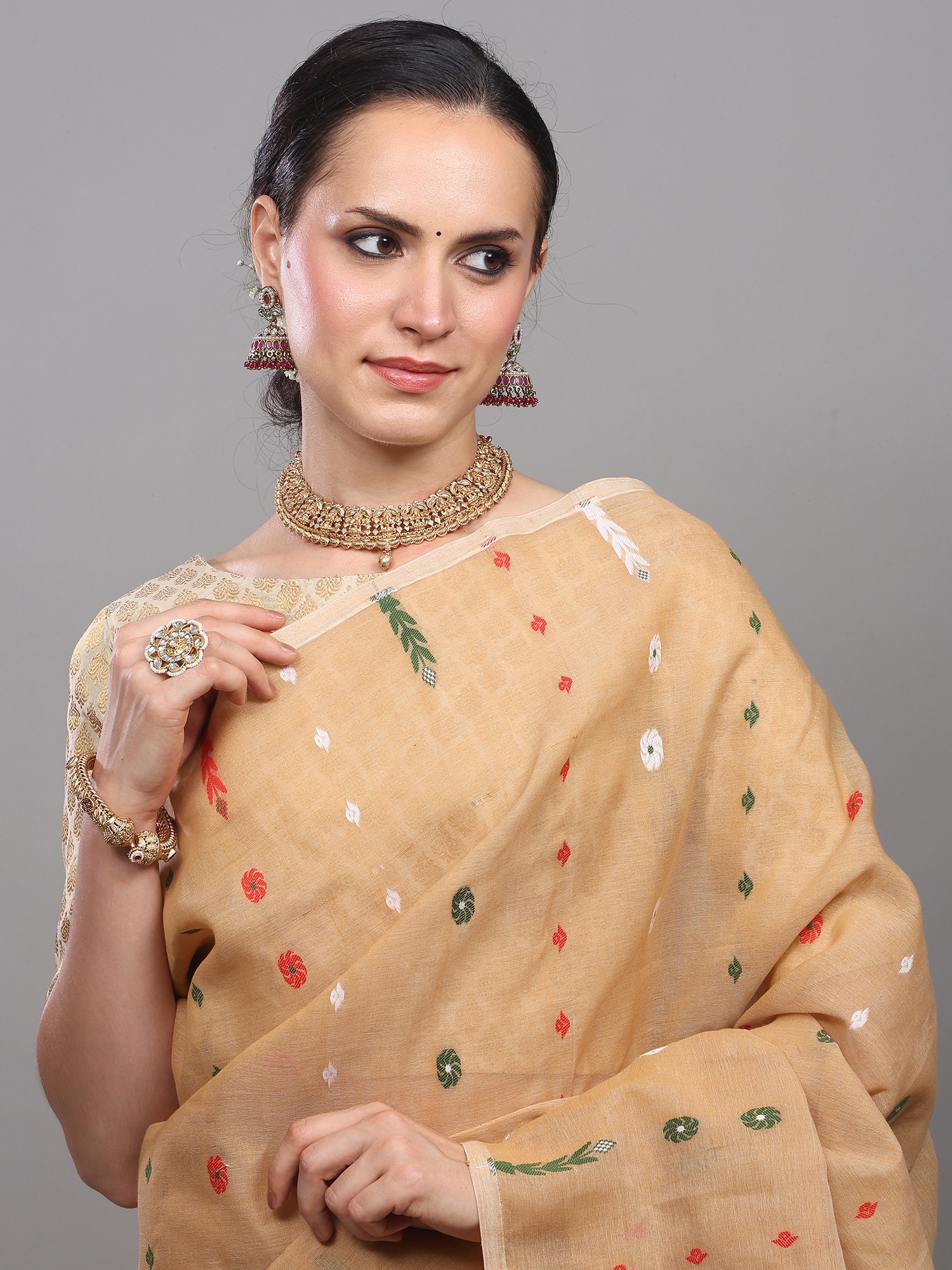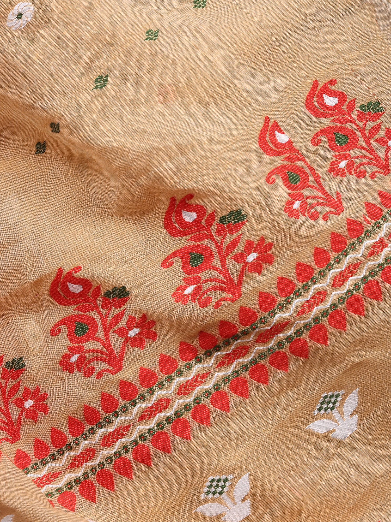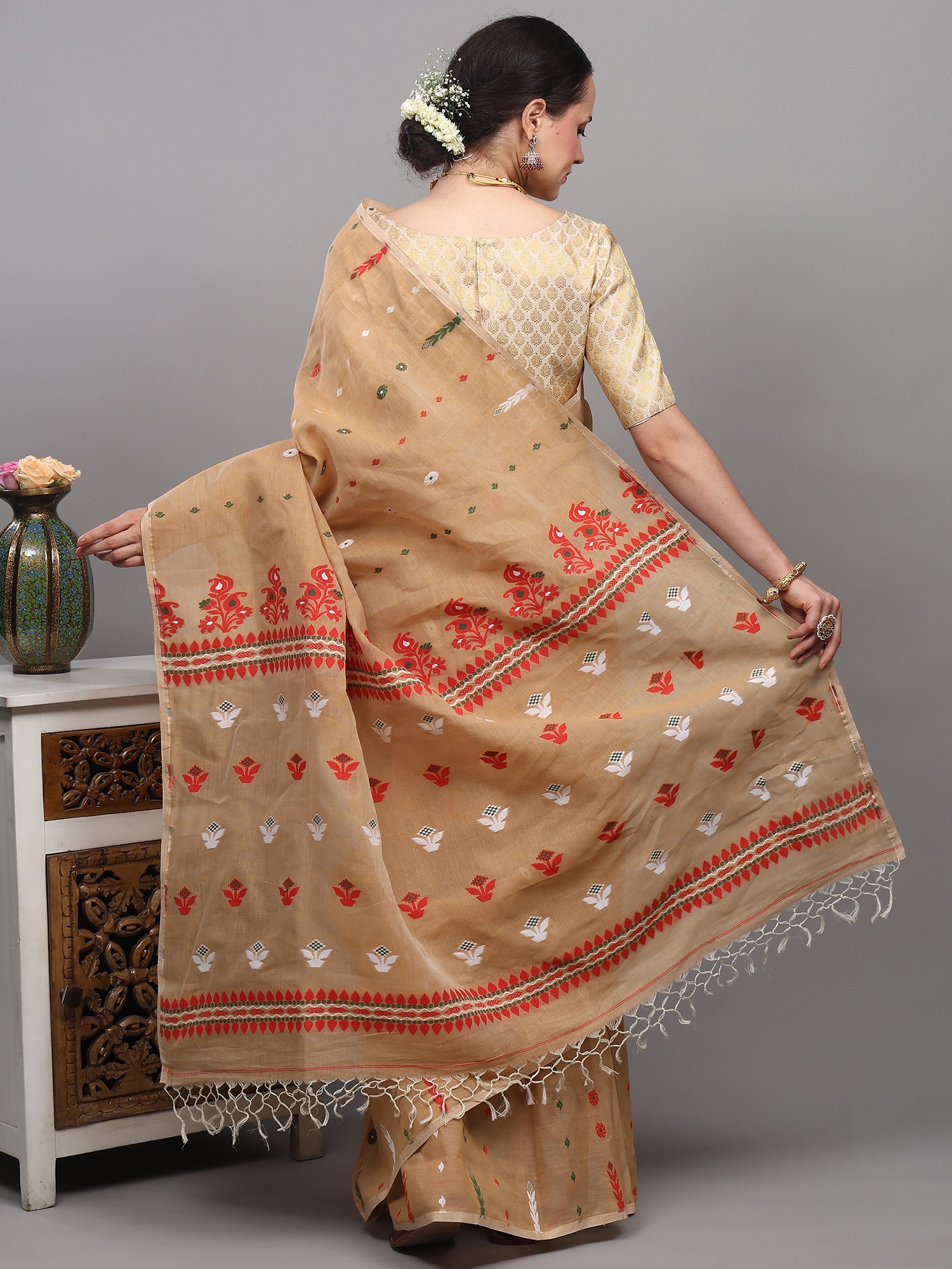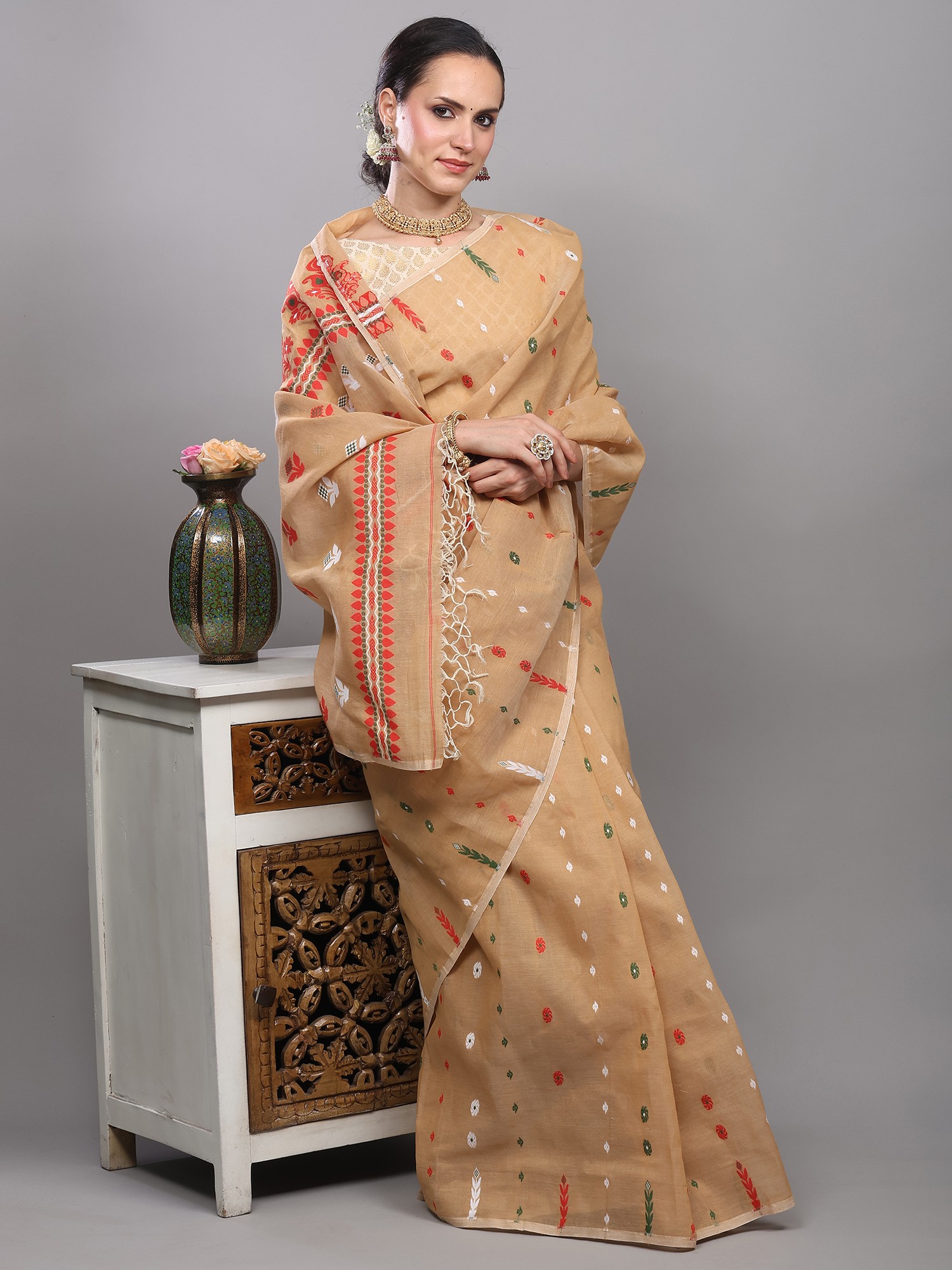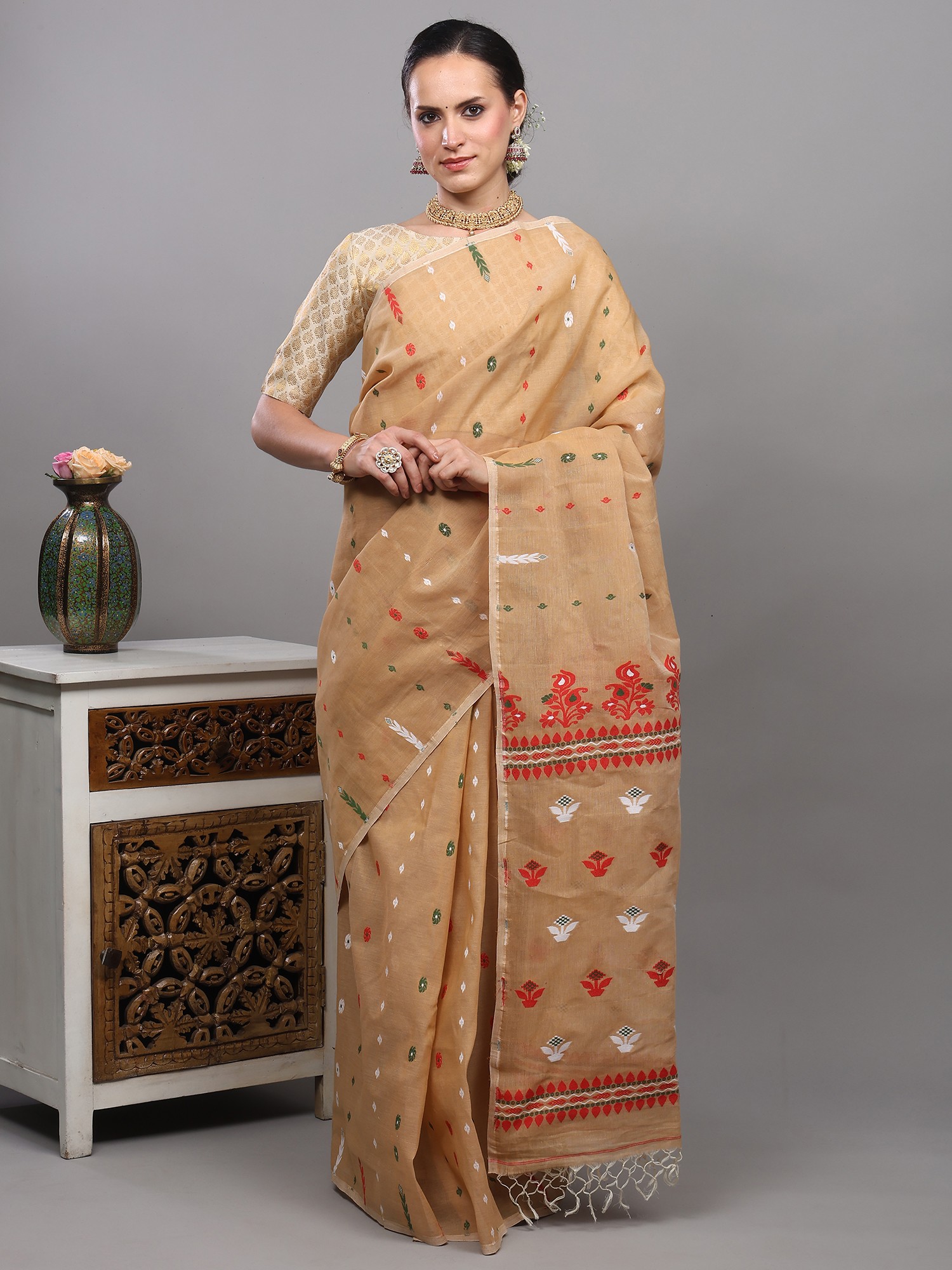 Cannoli-Cream Pure Cotton Dhakai Jamdani Handloom Saree from Bengal
