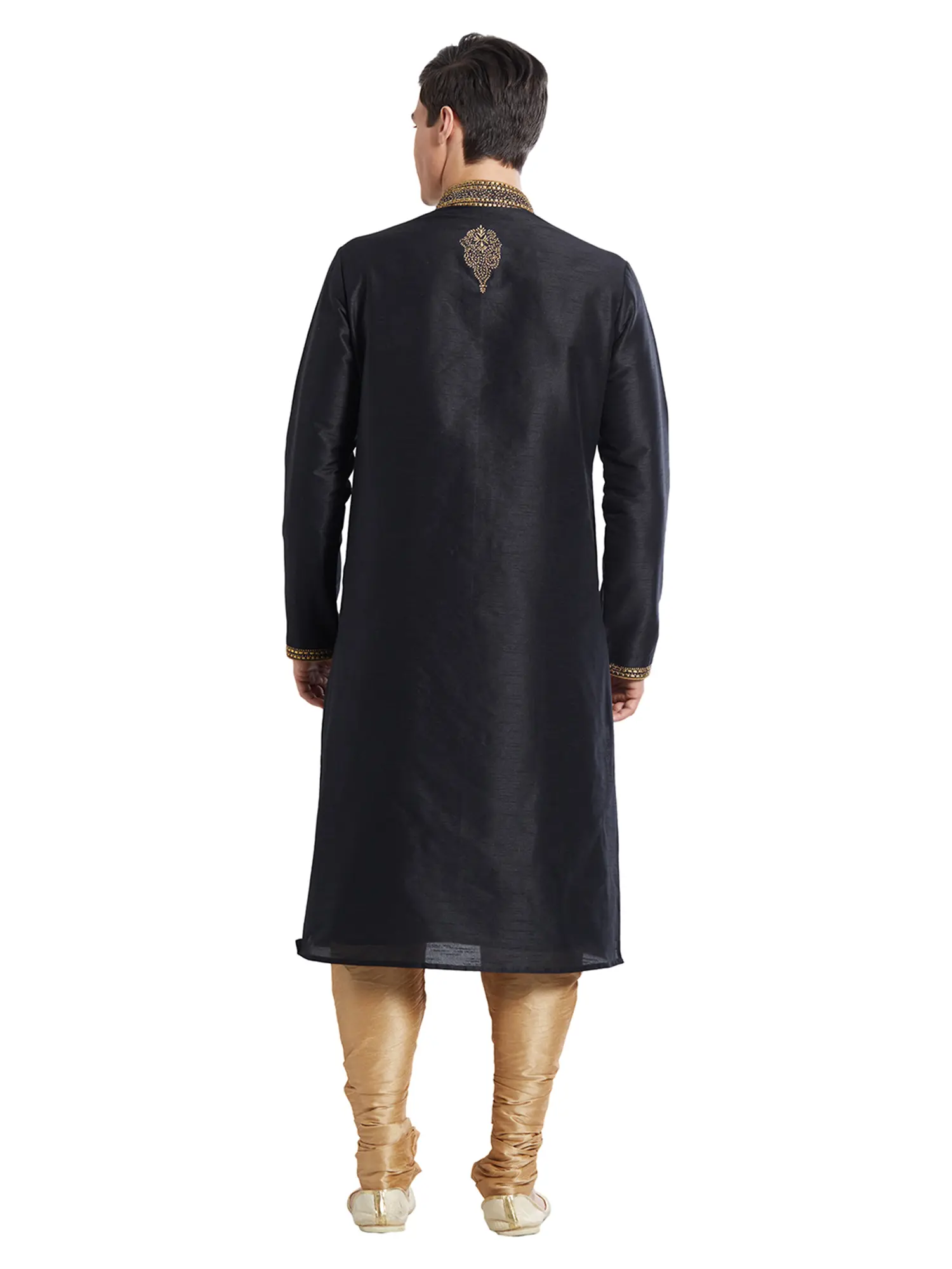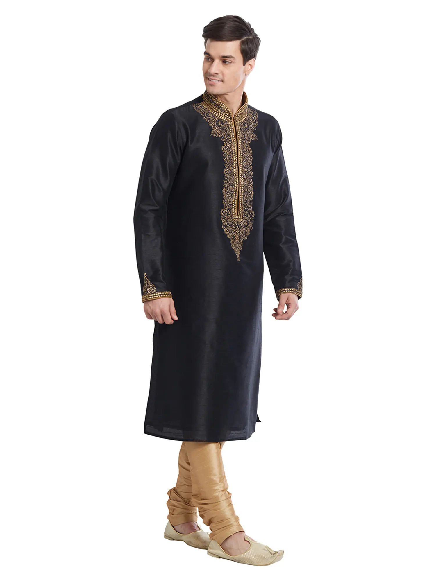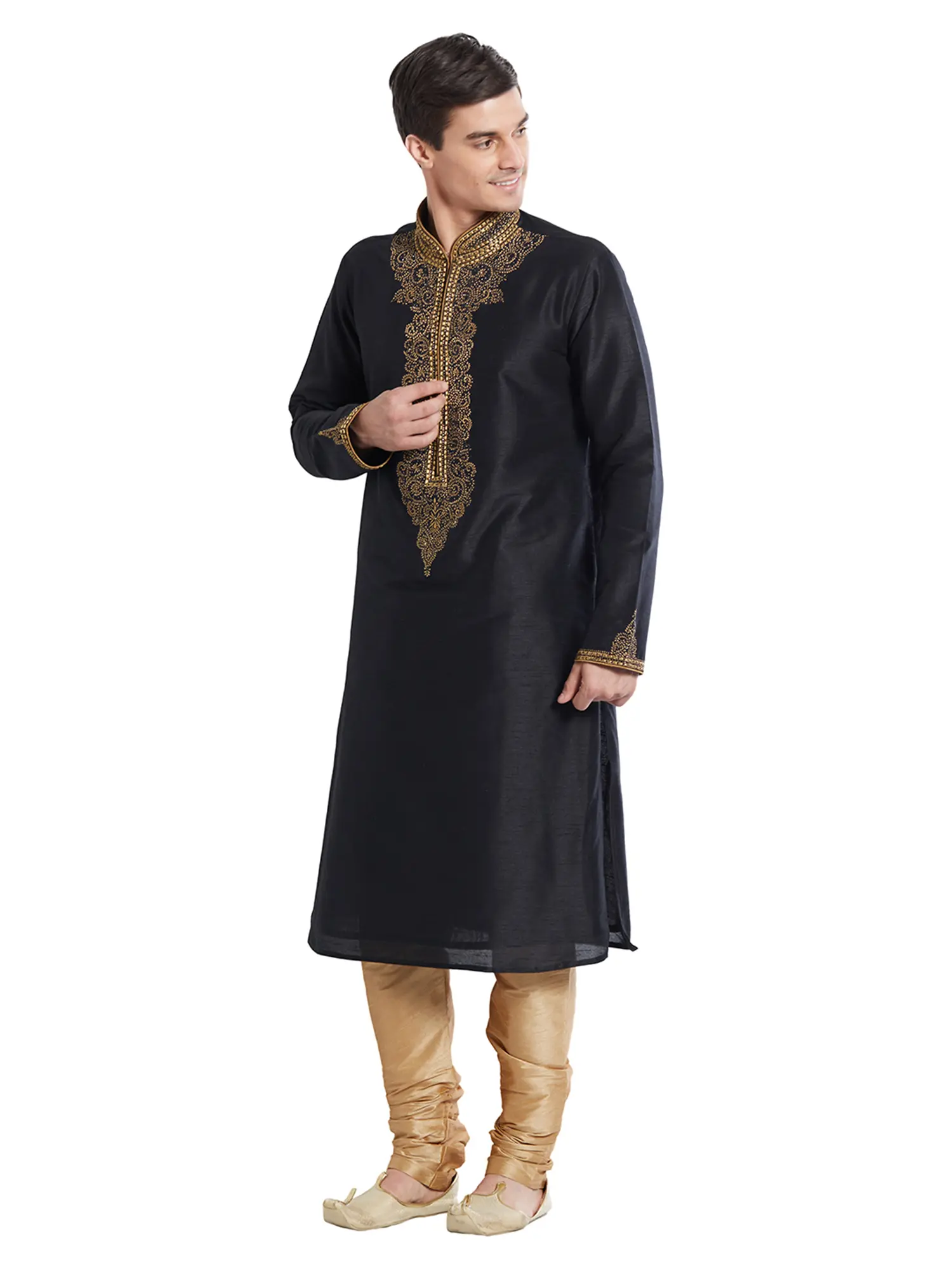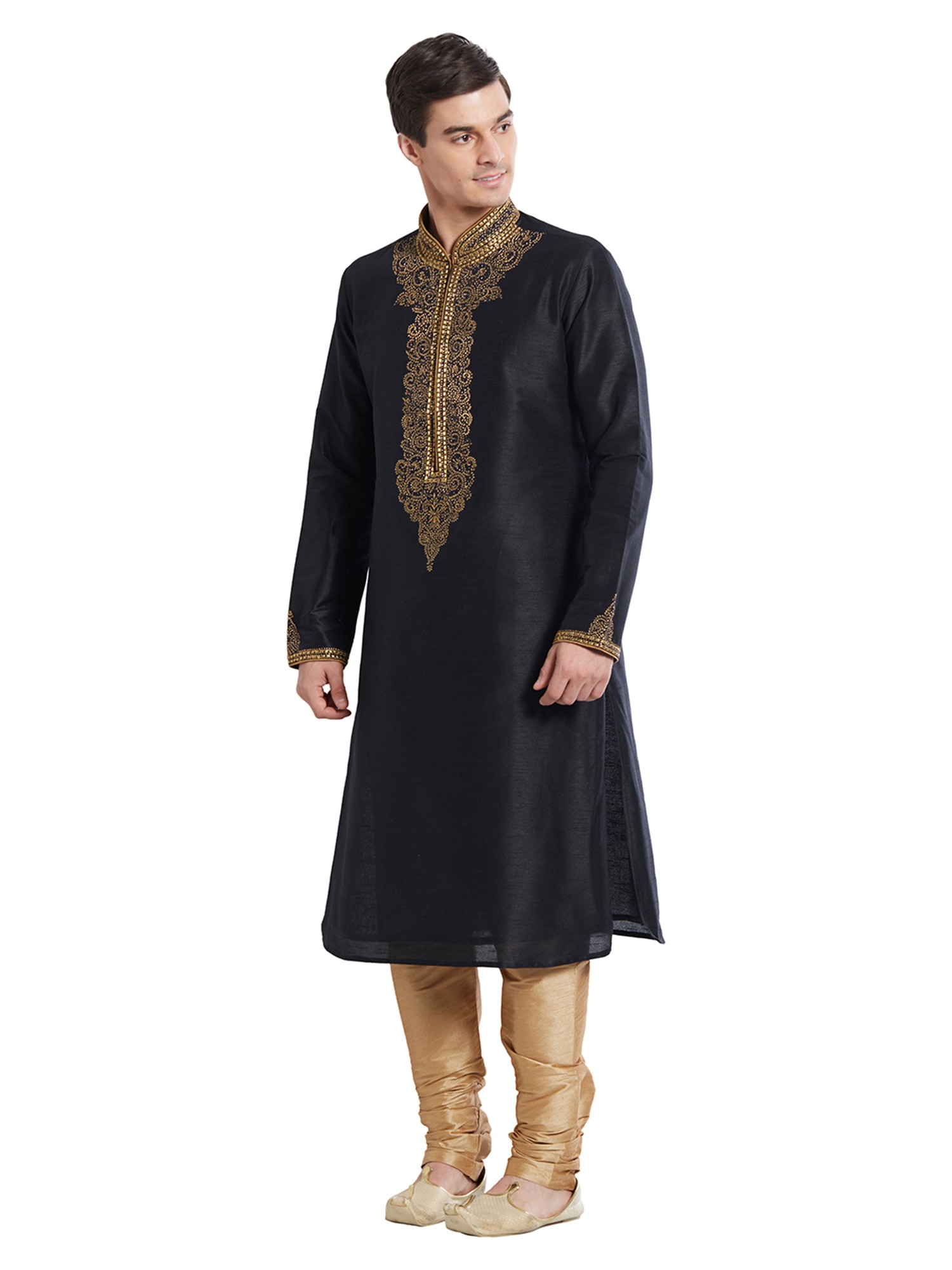 Features an art silk kurta with rich gold embroidery on the neckline and cuffs.