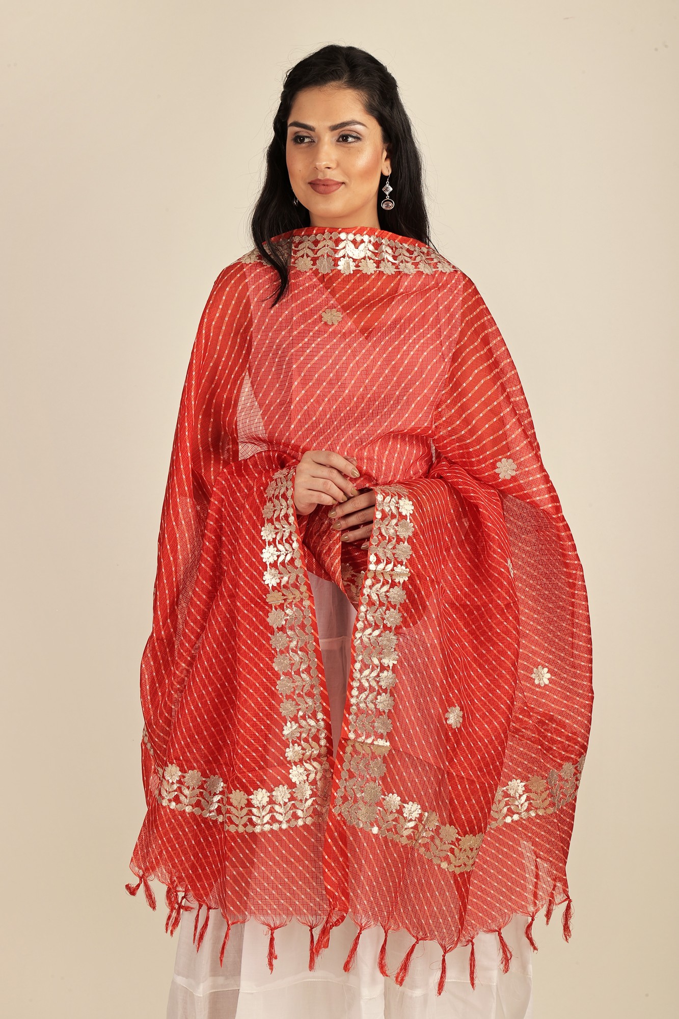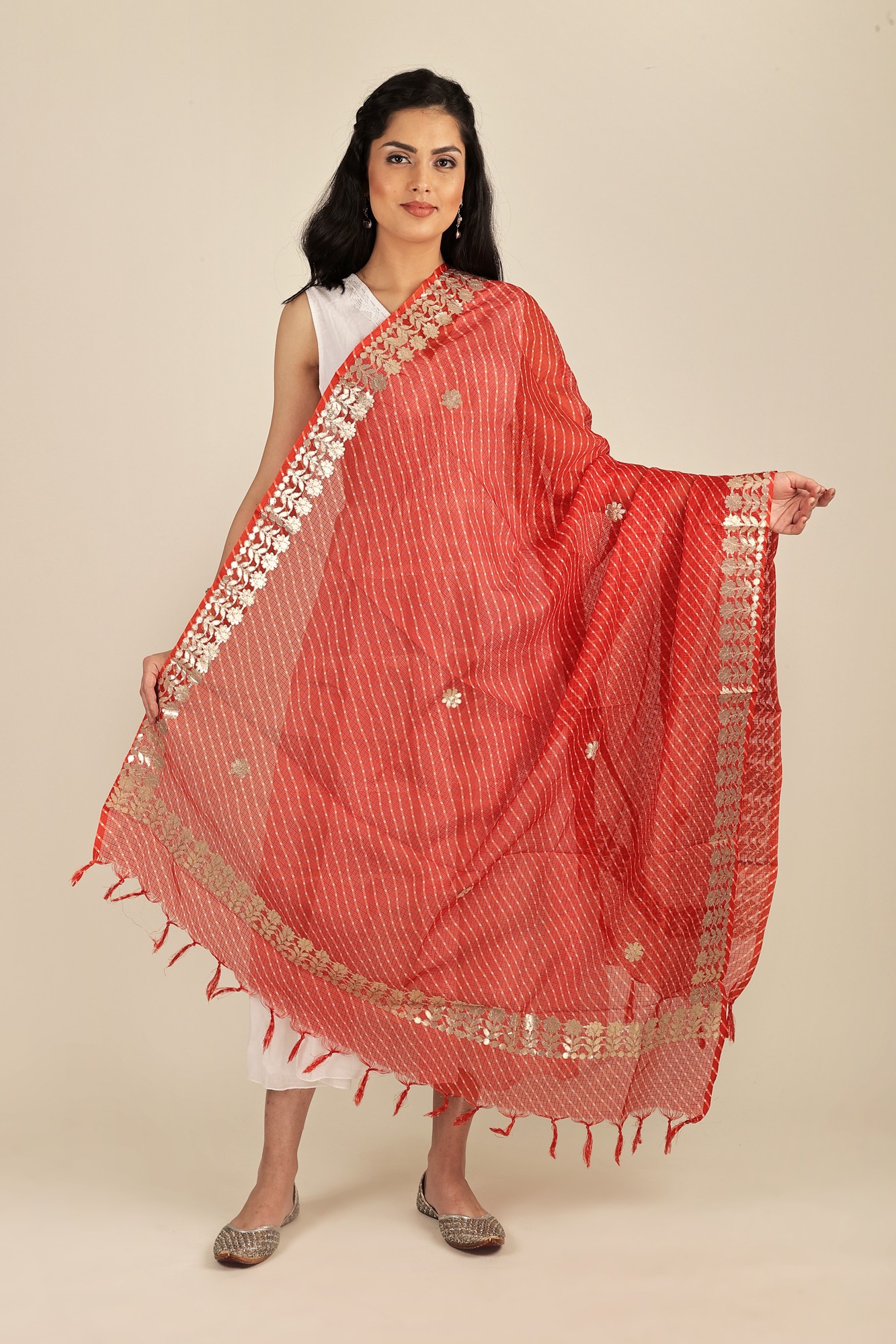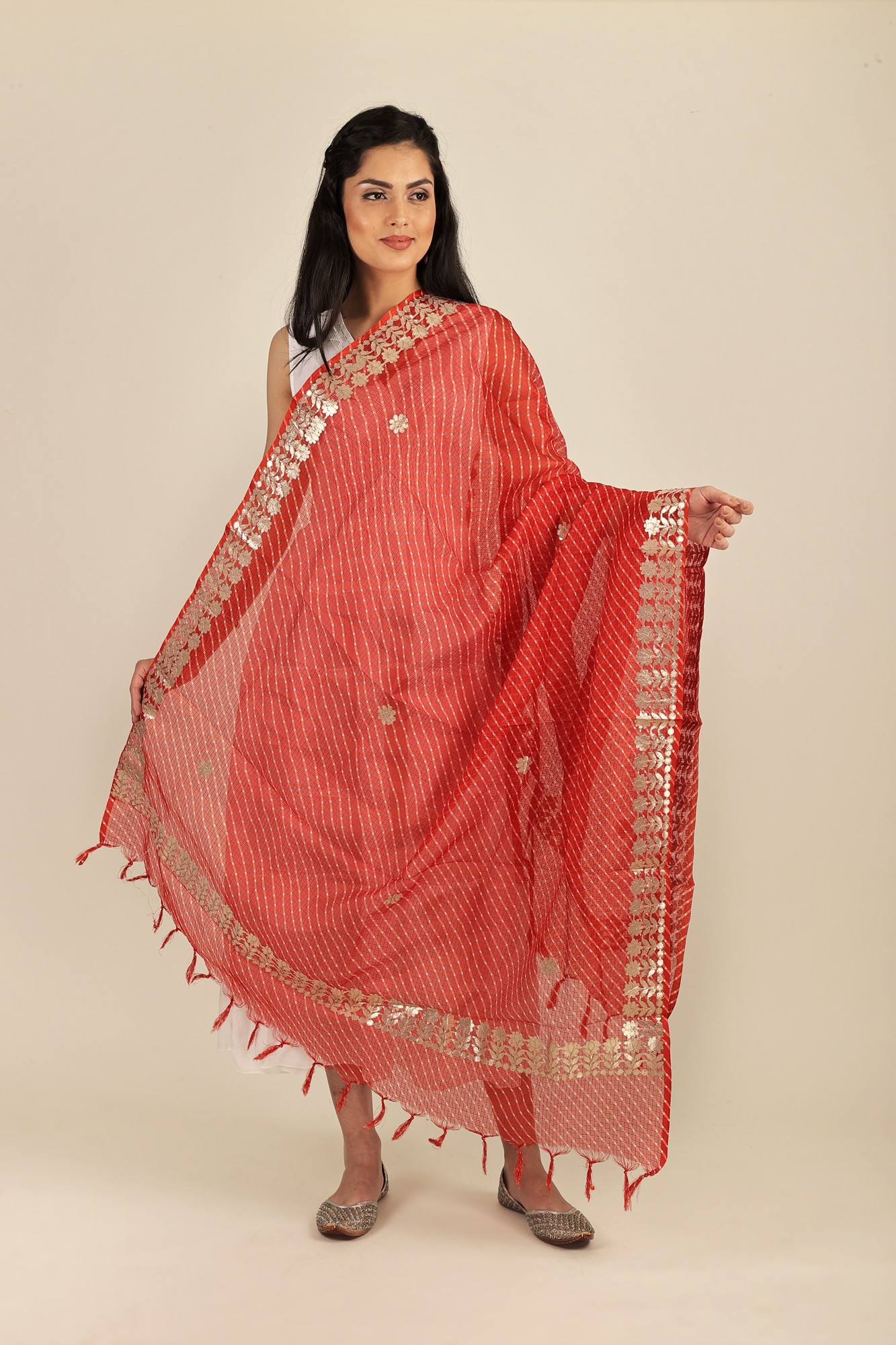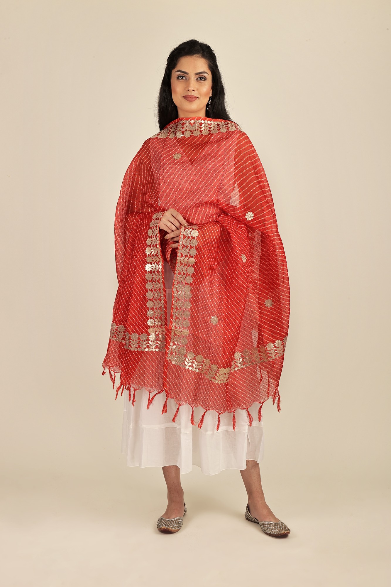 In these dupattas, using the tie-dye technique, simple white parallel lines cover the dupatta, creating a classic, symmetrical visual effect. On the border of this Kota-Doriya Leheriya tie-dye, dupatta flowers fashioned out of golden and silver Gota-Patti are stitched giving the unassuming dupatta an opulent impression. The elegant beauty of these dupattas is thus something on which you can rely to enhance your festive fashion and turn any outfit into a wonderful Indian costume.