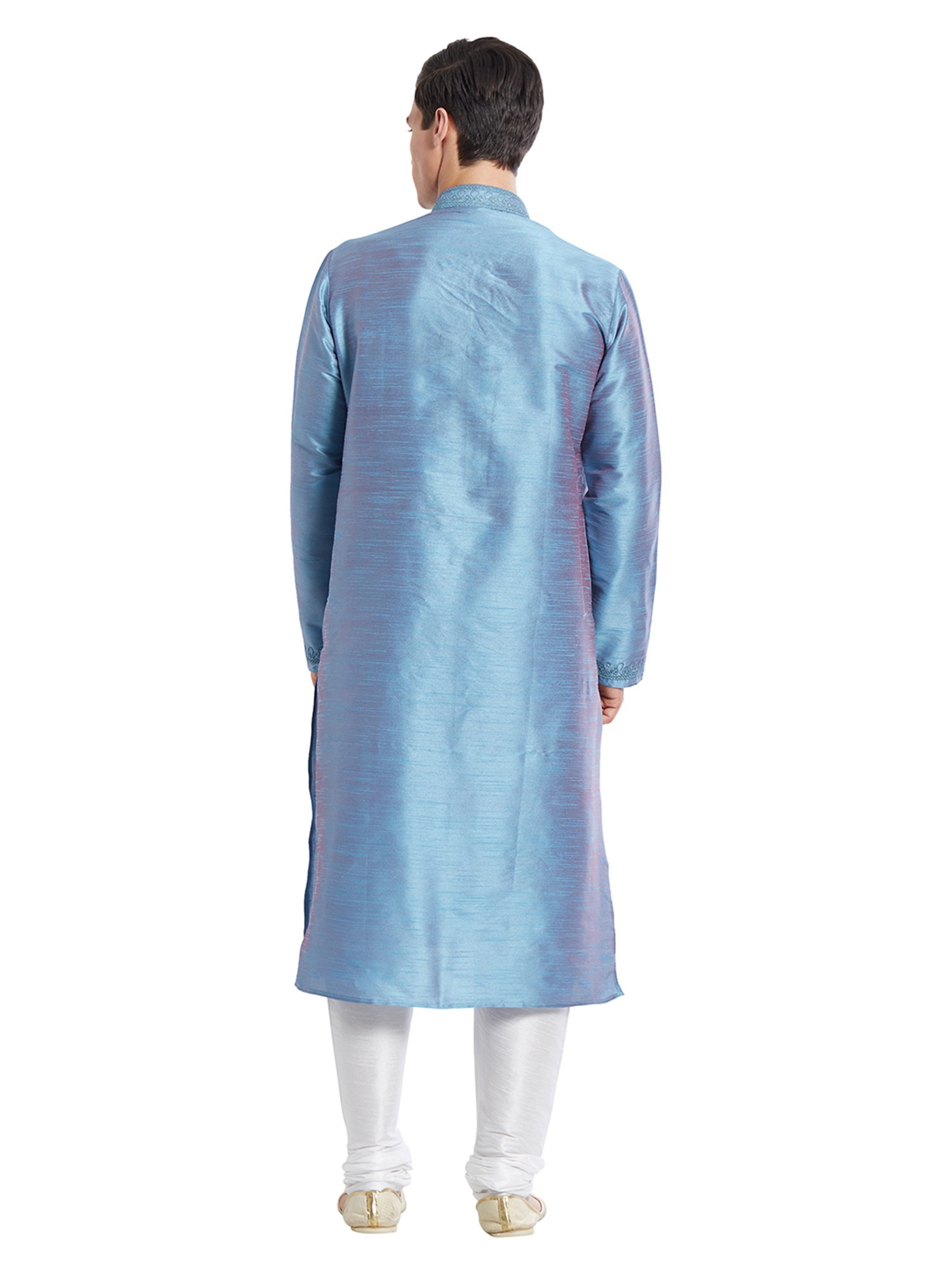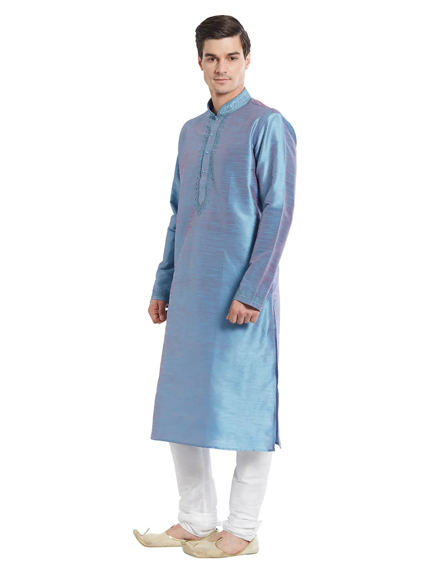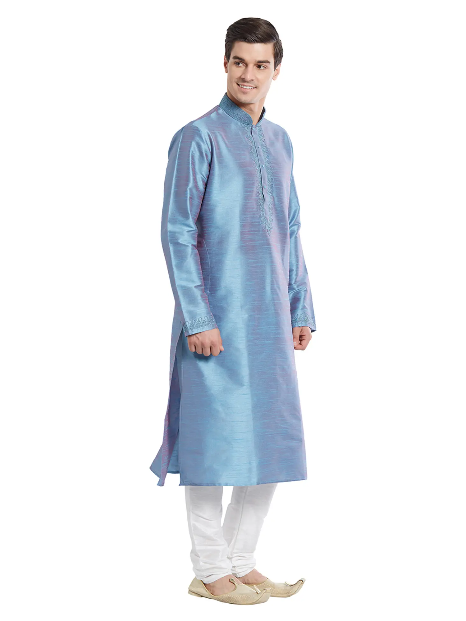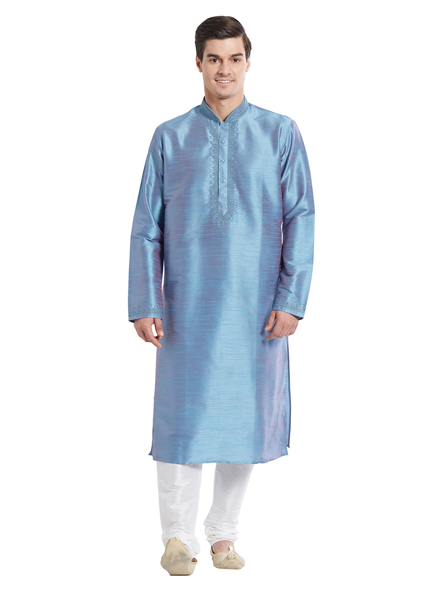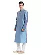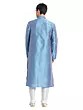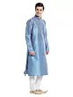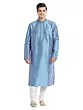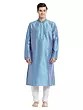 Features a striking blue art silk kurta with intricate tonal embroidery on the neckline and cuffs.