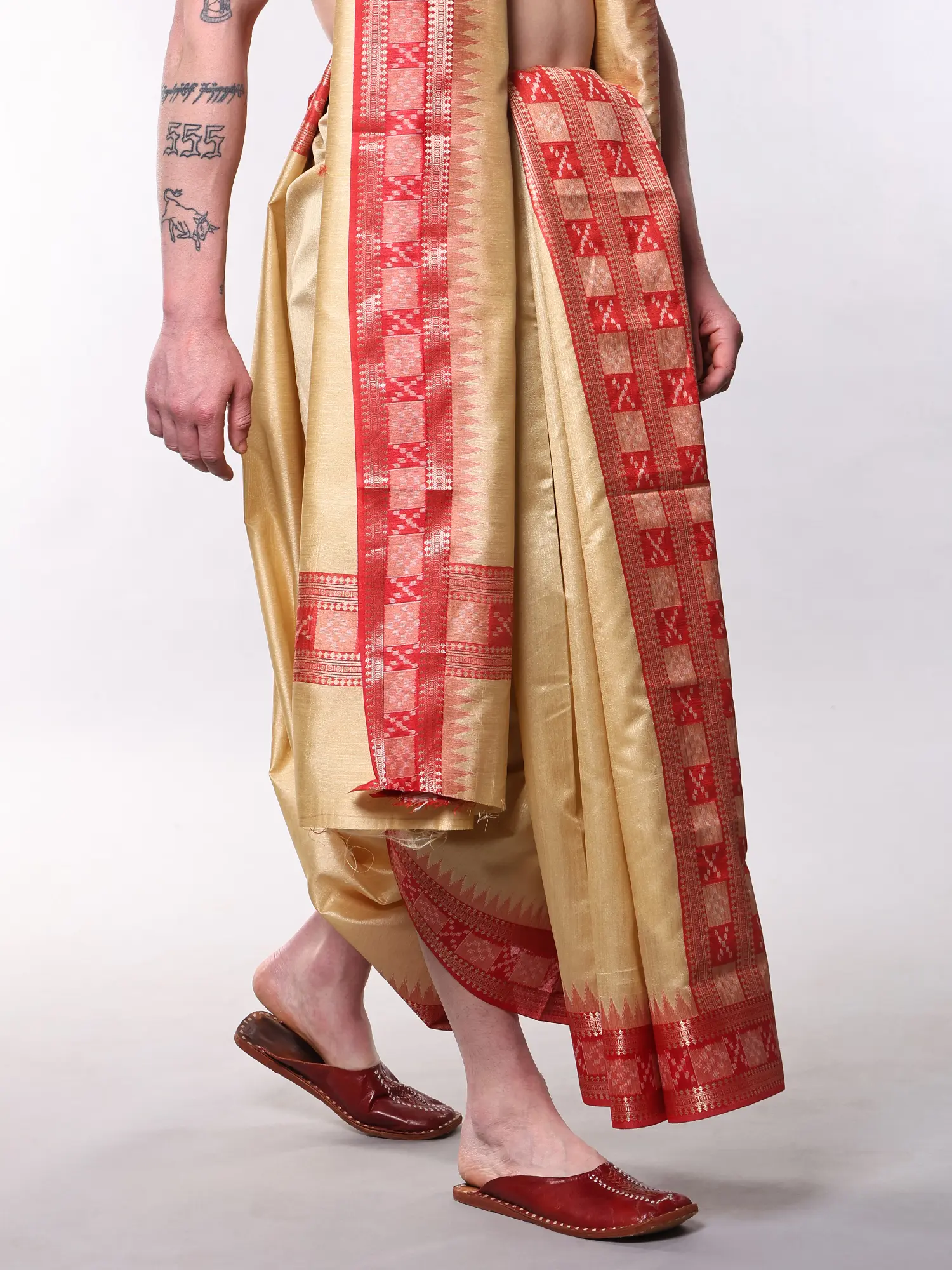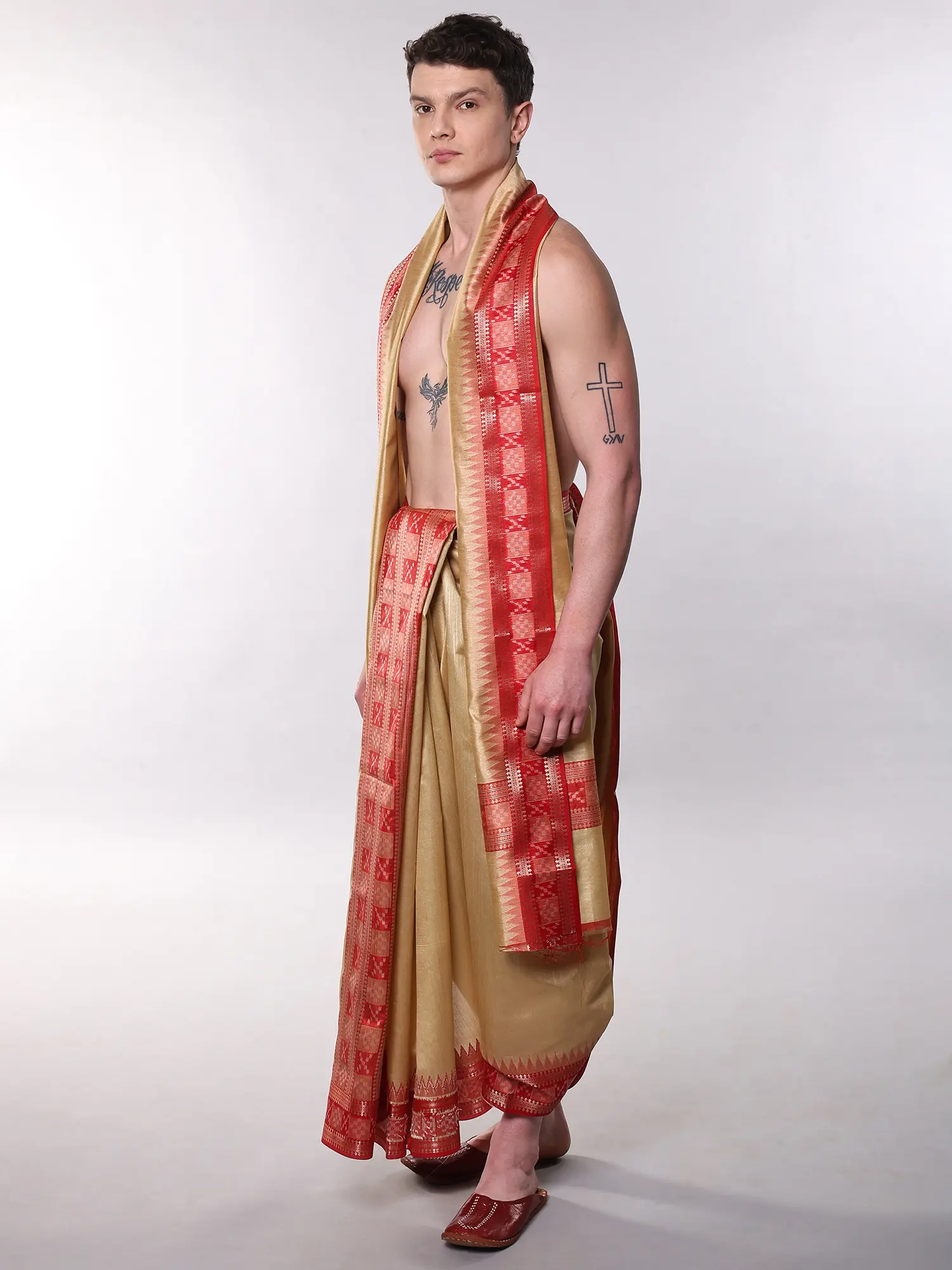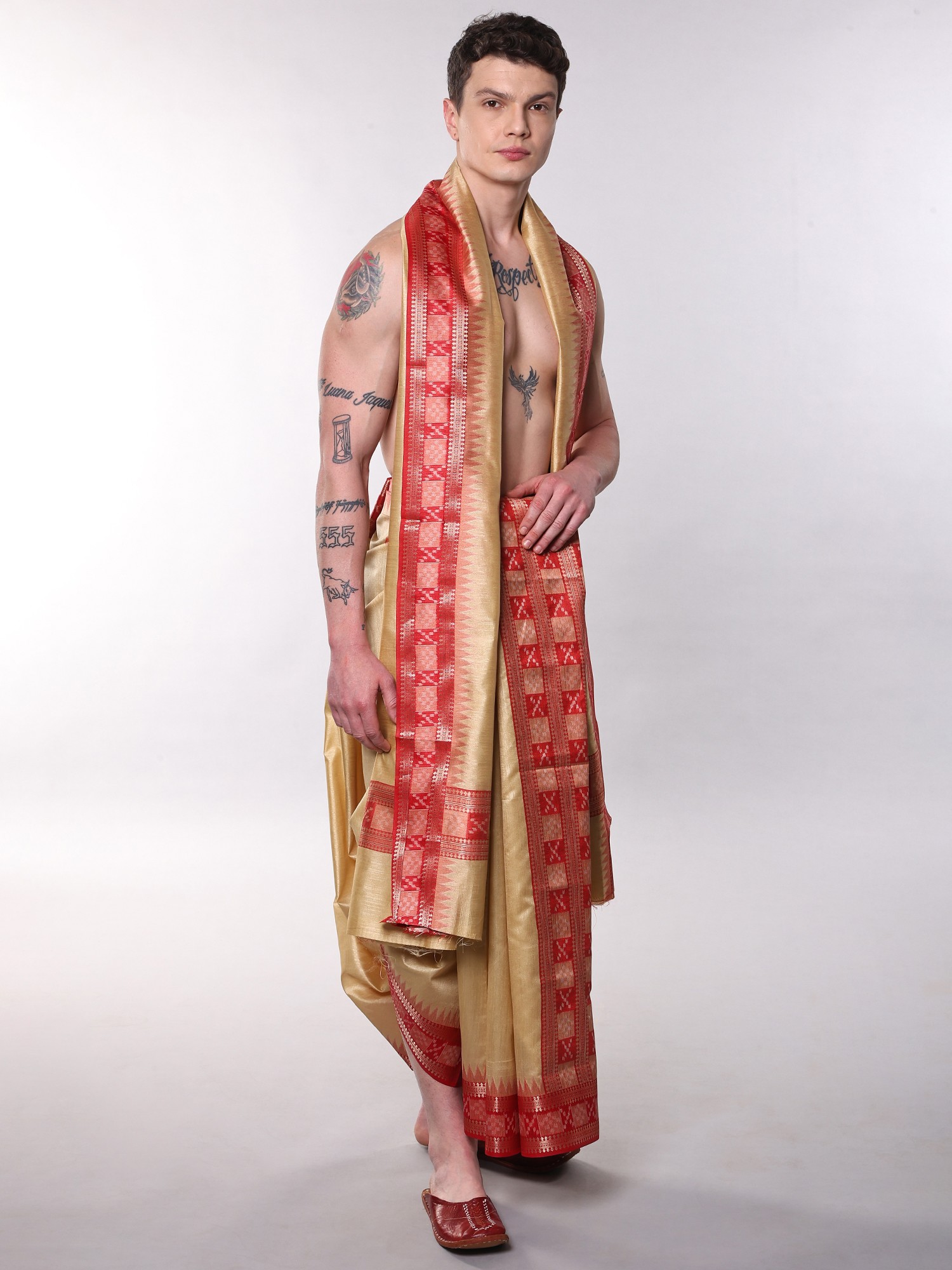 The dhoti, measuring a substantial 180 inches in length and 45 inches in width, offers ample fabric for elegant draping, ensuring a comfortable and flattering fit. Complementing this is the angavastram, a graceful shoulder cloth, which spans 104 inches in length and also measures 45 inches in width. The interplay of frosted almond hues with vibrant red and shimmering gold zari creates a visually captivating piece that speaks volumes of its quality and design.