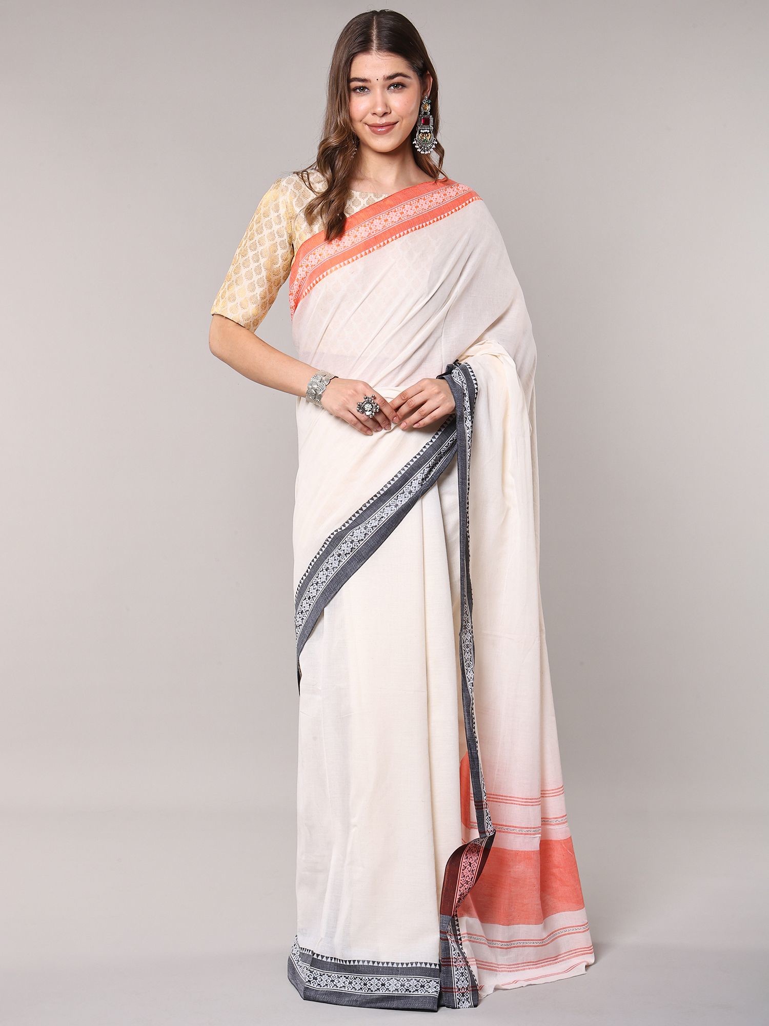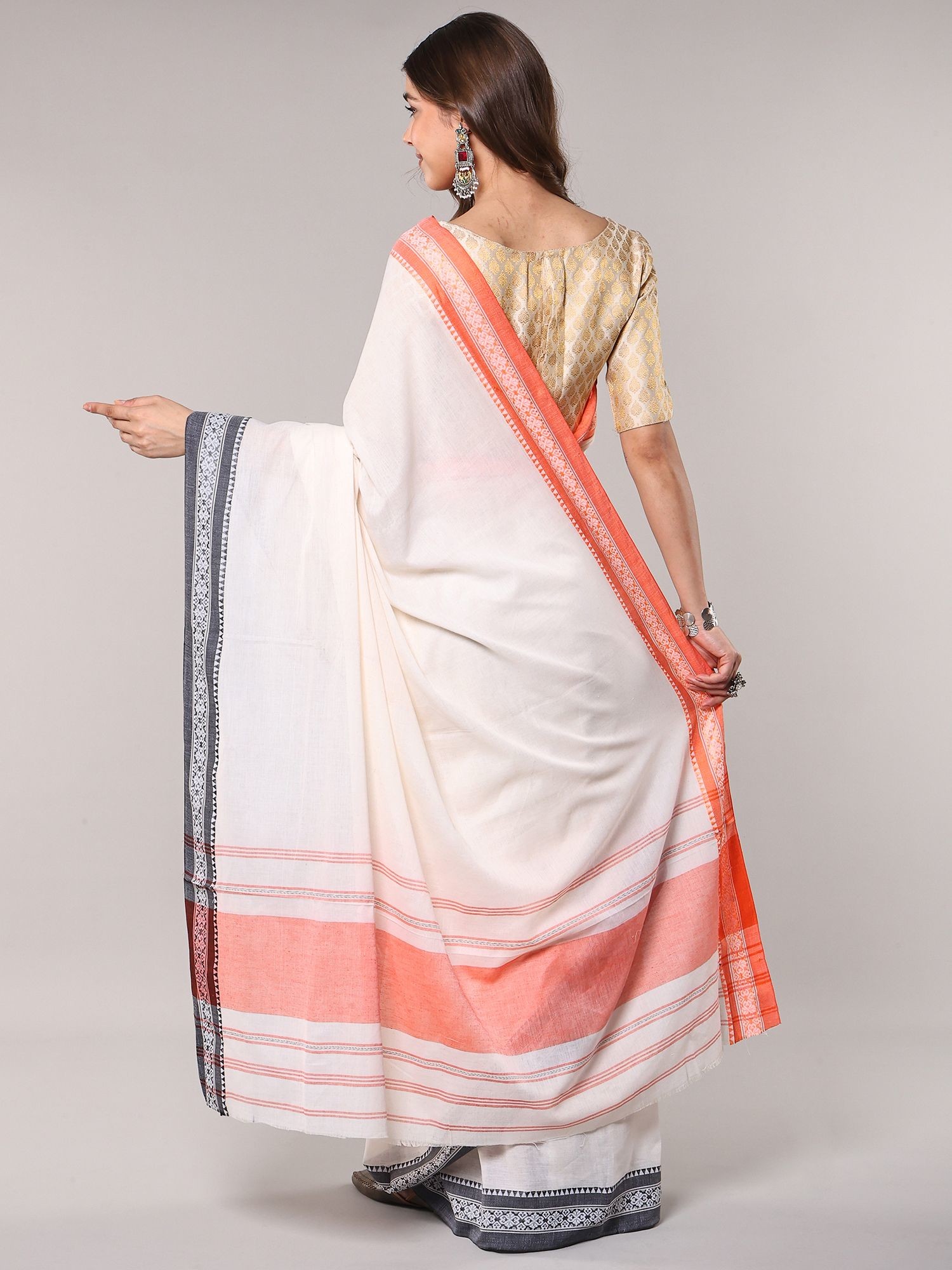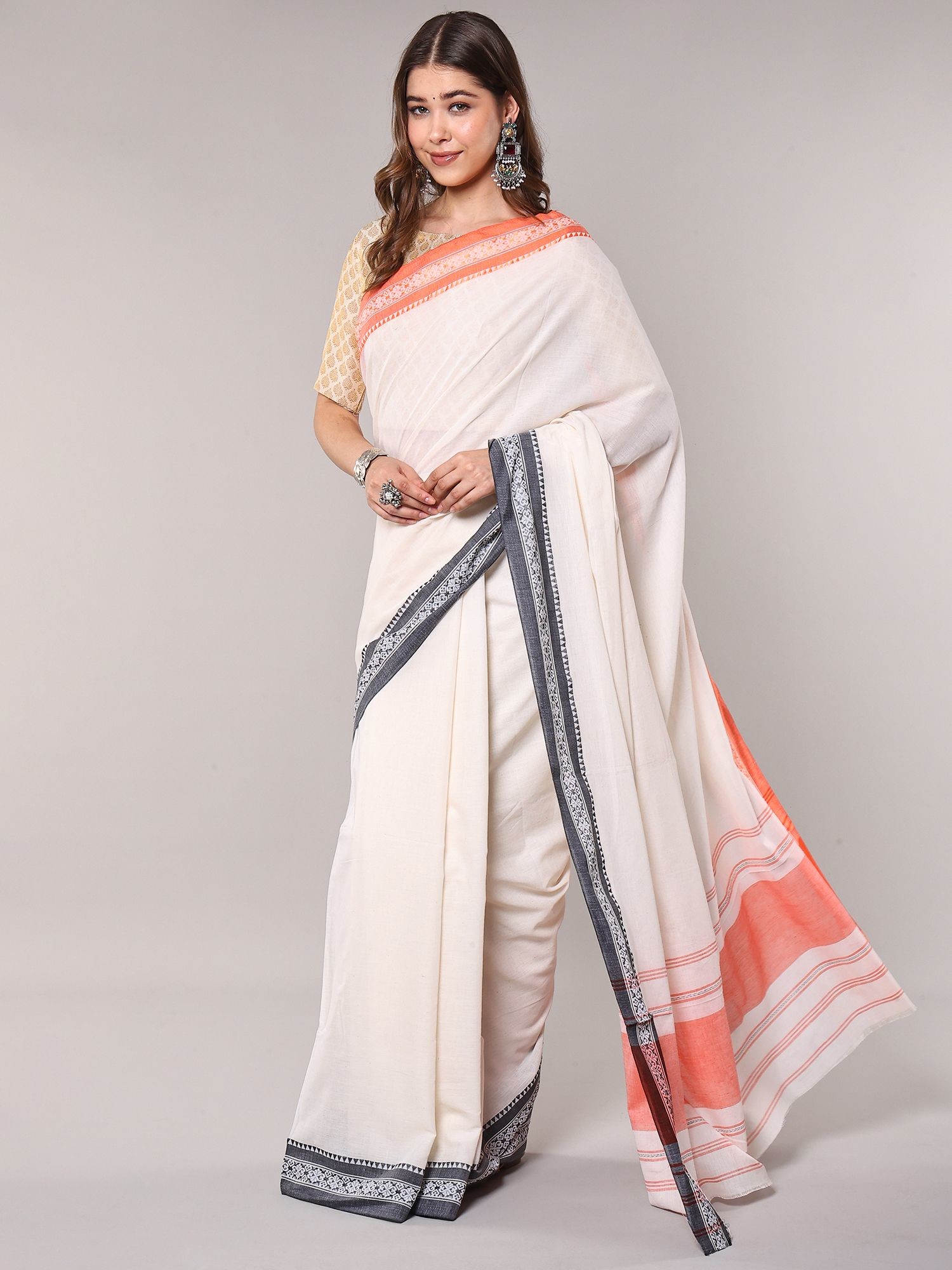 Traditional White Cotton Saree with Contrast Temple Border