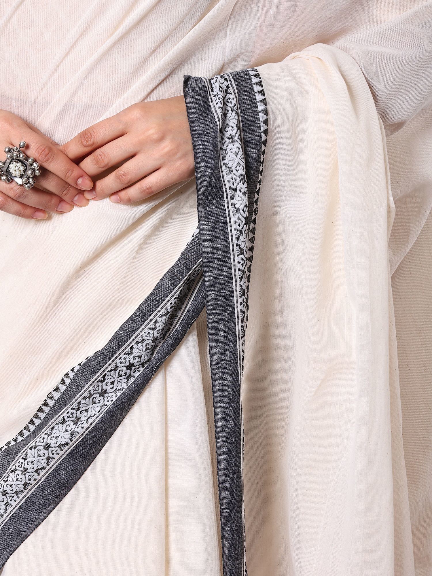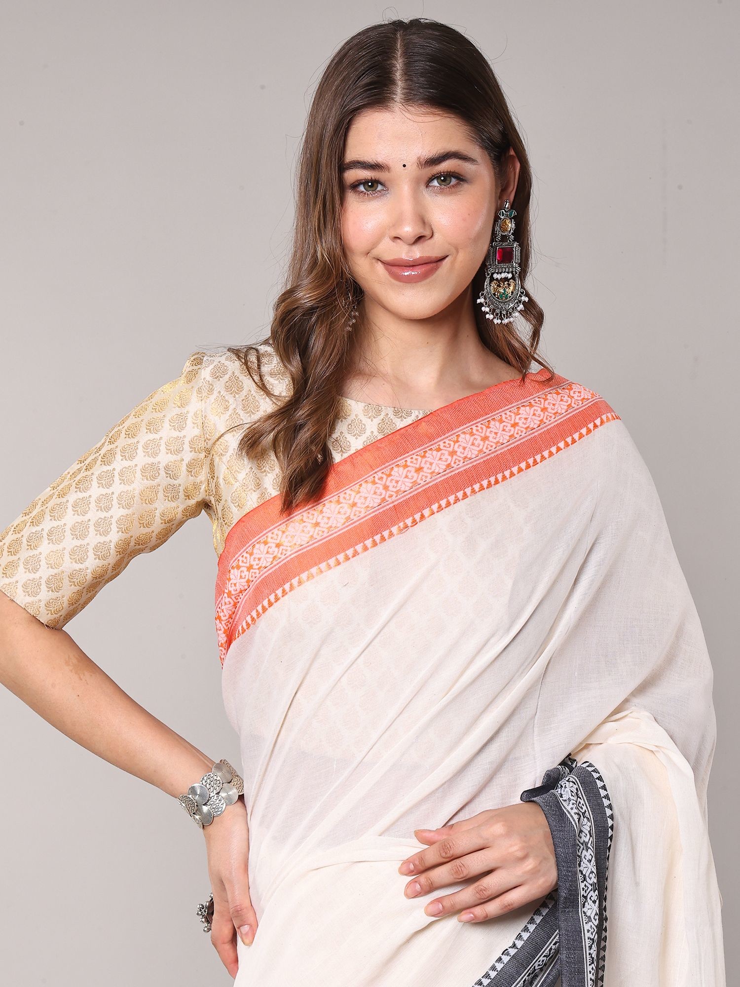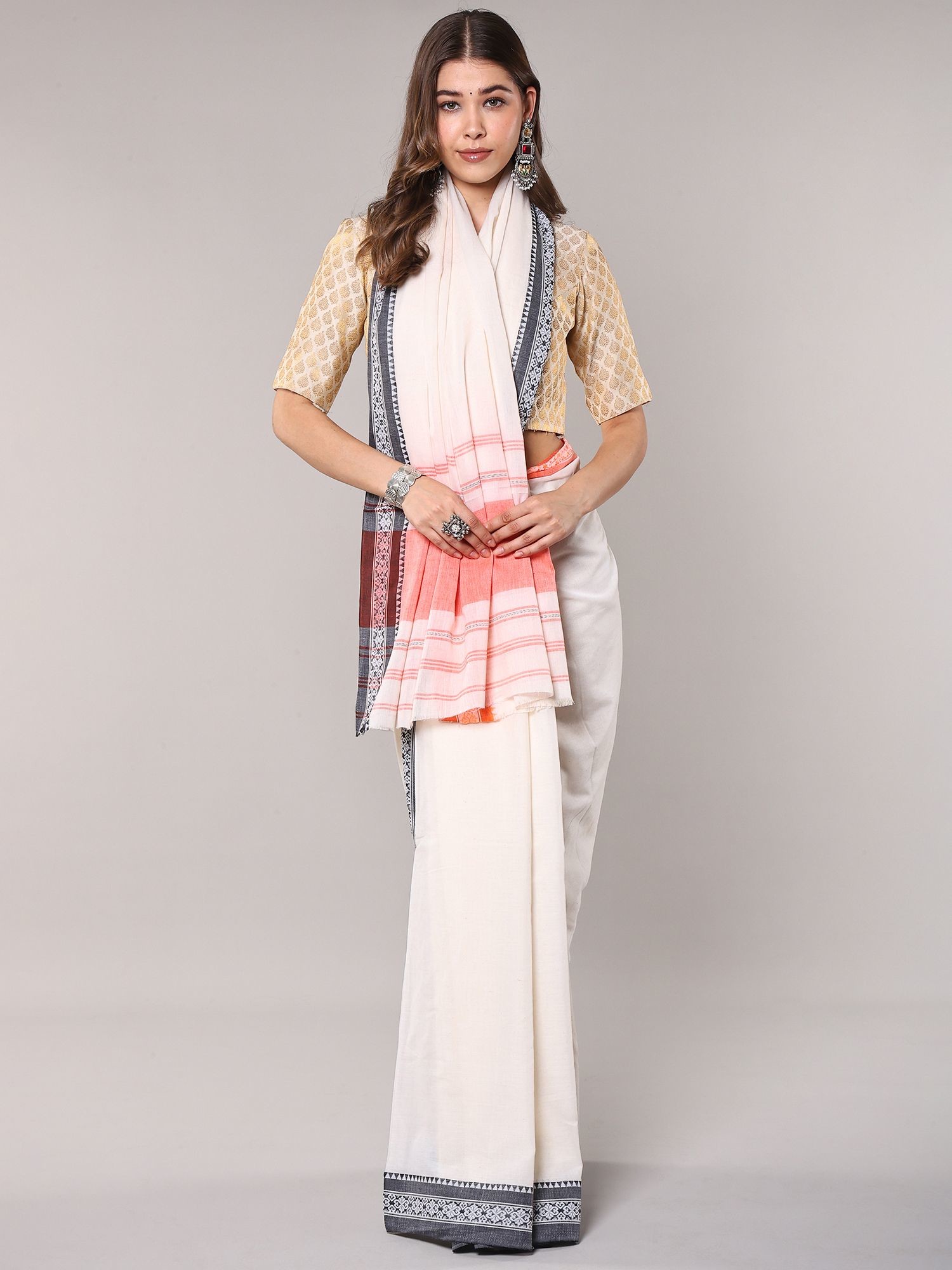 Traditional White Cotton Saree with Contrast Temple Border