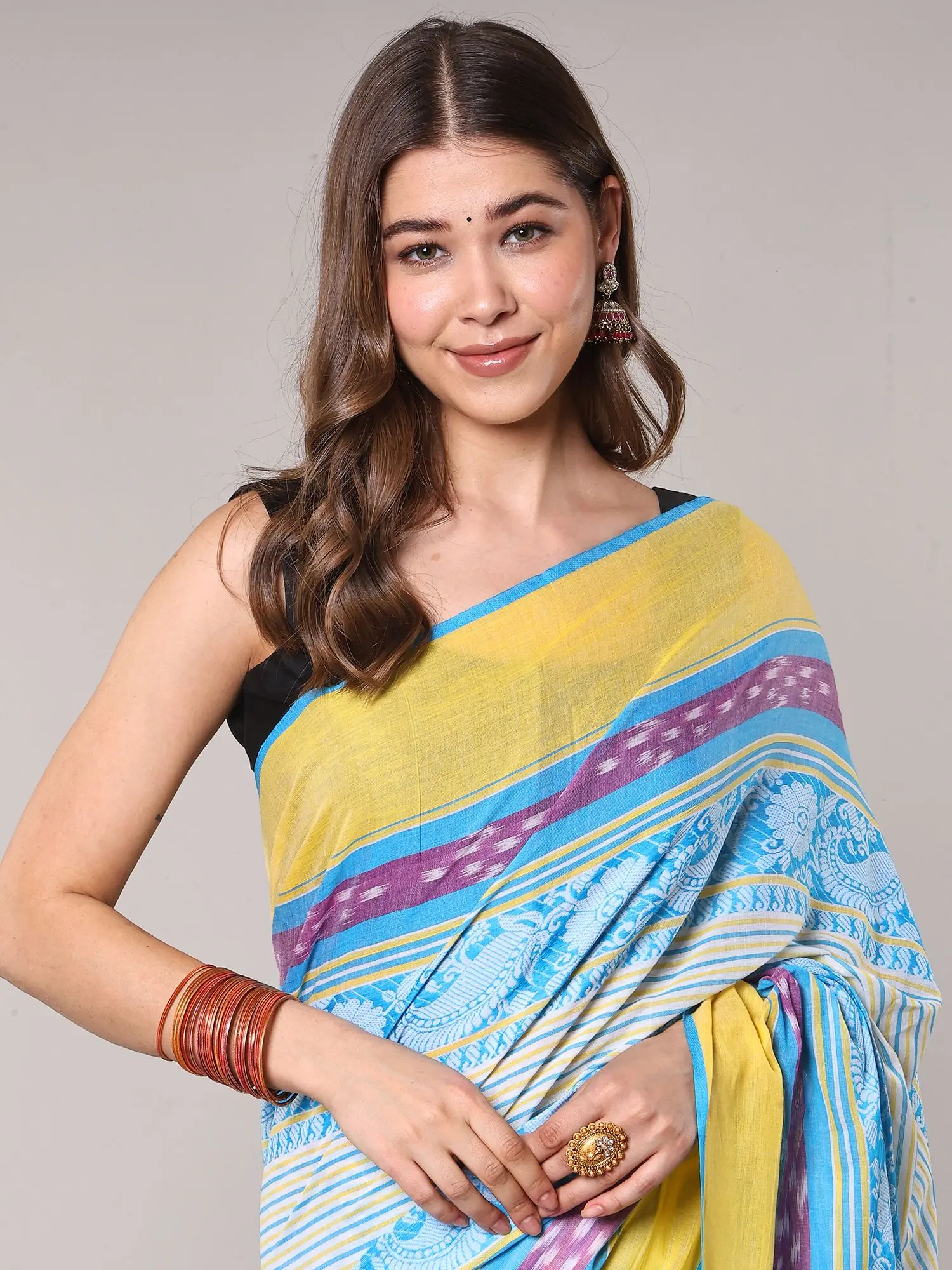 The interplay of striking yellow and refreshing blues, accented with delicate purple stripes, creates a visually captivating design. Bands of fine, linear patterns are elegantly framed by a richly woven border featuring charming floral motifs. This harmonious combination ensures you’ll capture attention with every graceful drape.