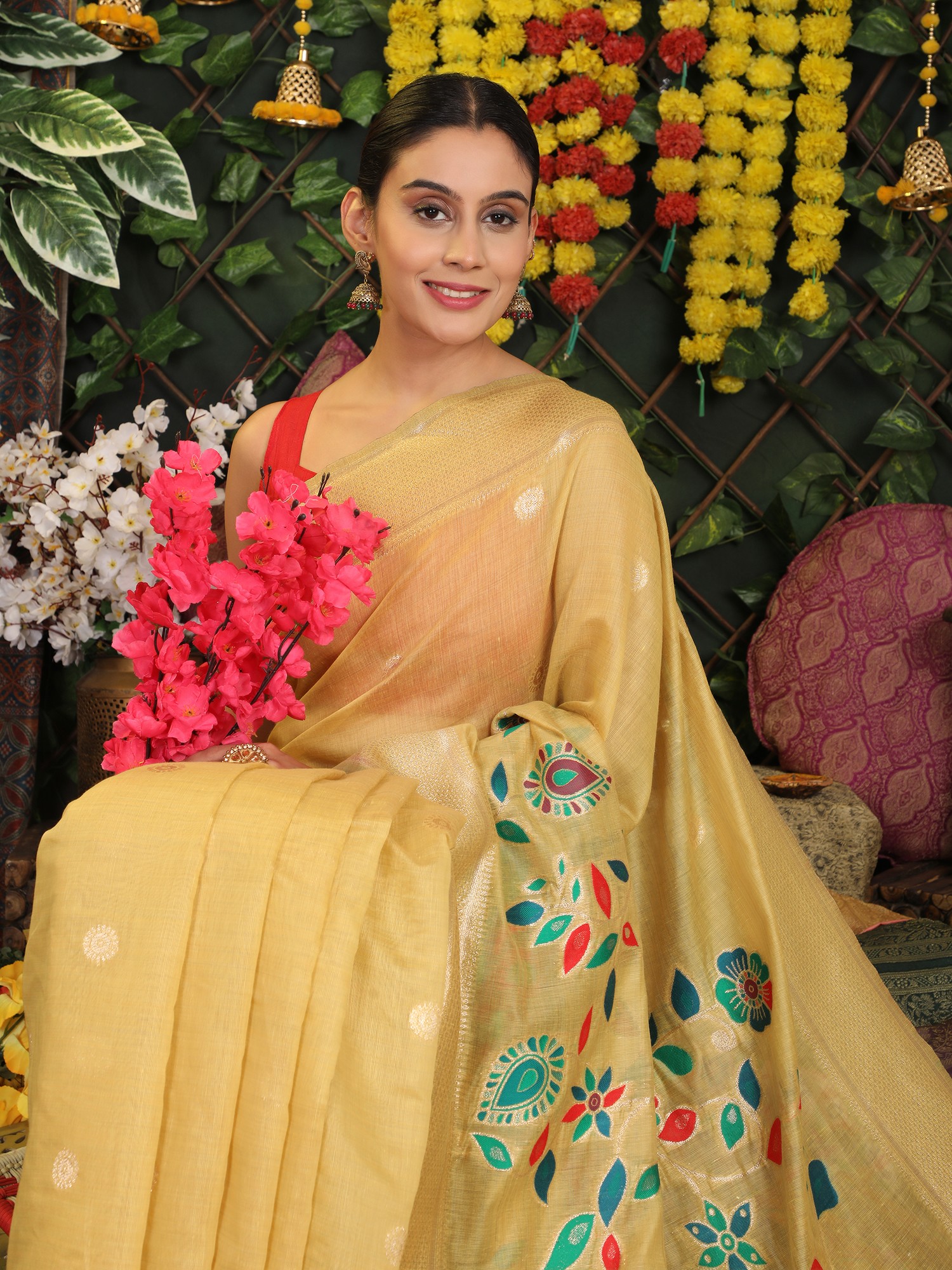 Radiant yellow linen cotton saree crafted for comfortable festive wear.