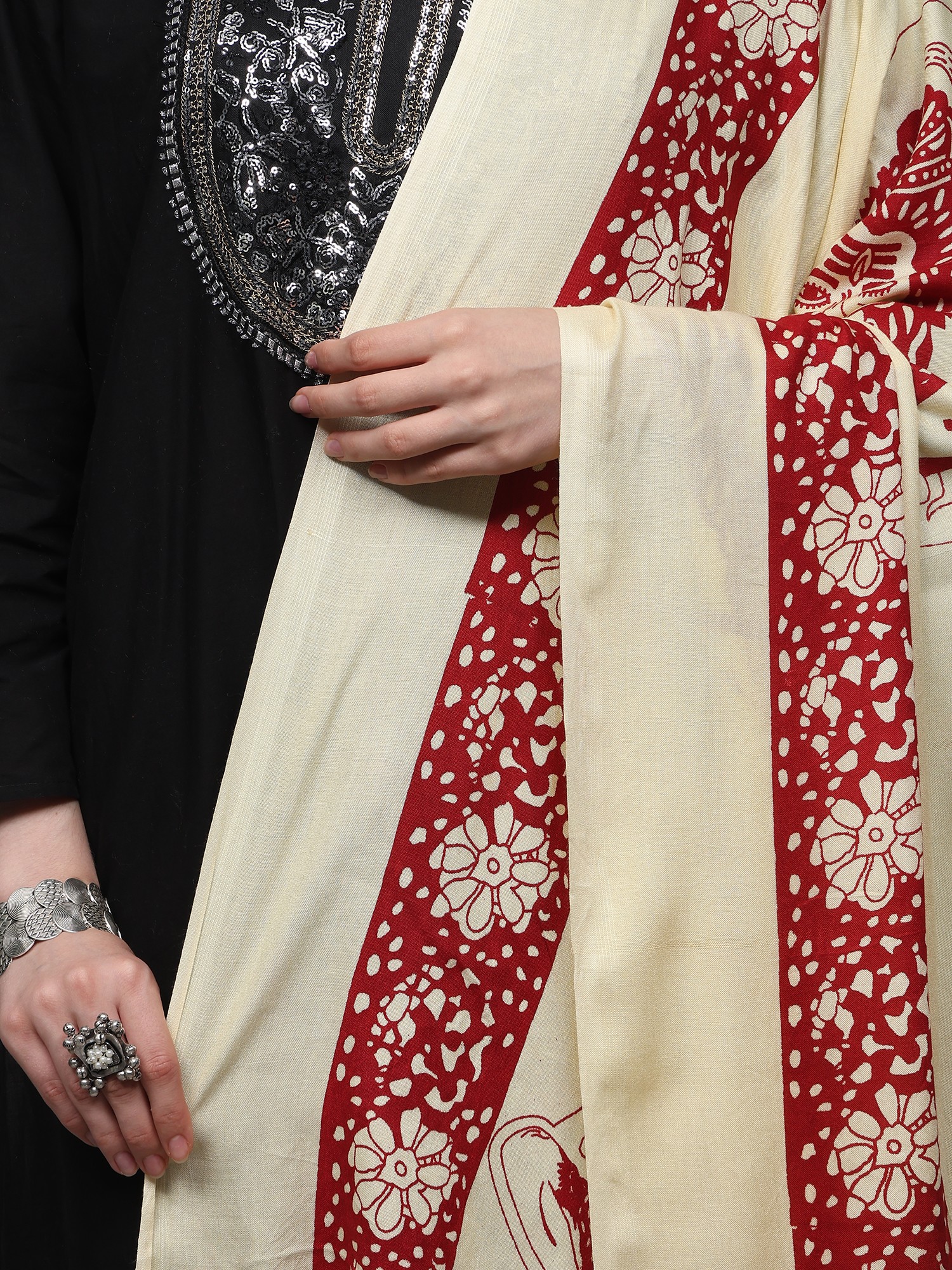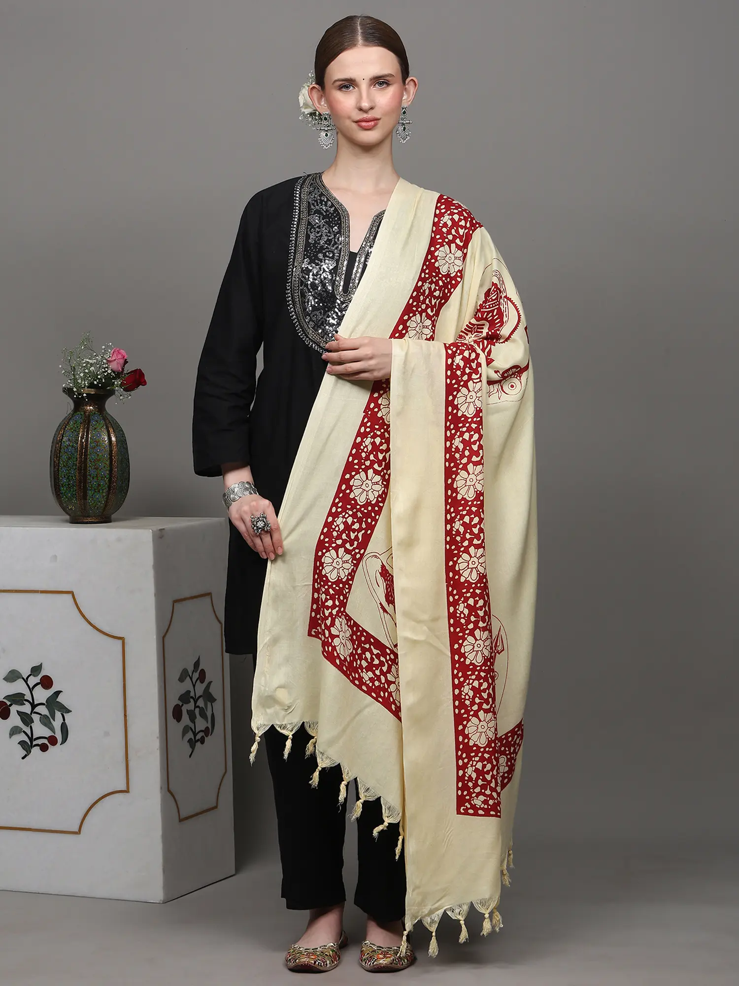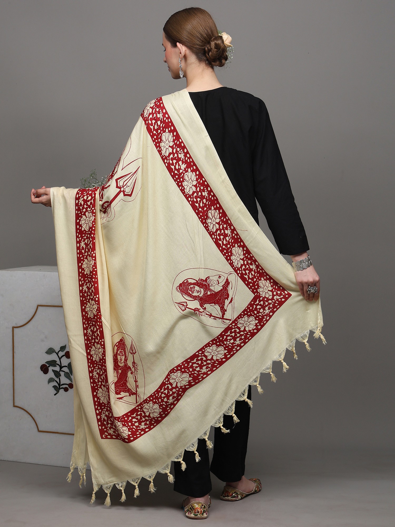 Wrap yourself in serenity and devotion with this beautifully crafted shawl. Designed with reverence in mind, this piece seamlessly blends faith and elegance, making it a perfect addition to your spiritual practices or everyday attire. The soft, flowing fabric drapes gracefully, providing comfort and a gentle reminder of inner peace. The light base color acts as a canvas for the meticulously placed designs. This shawl offers a visual representation of devotion, inviting contemplation and connection to the divine. Whether you are seeking solace in prayer, attending a religious gathering, or simply wish to carry a piece of spiritual art with you, this shawl will serve as a constant source of inspiration and tranquility. Its versatile style allows it to be worn in various ways, adding a touch of sacred grace to any outfit.