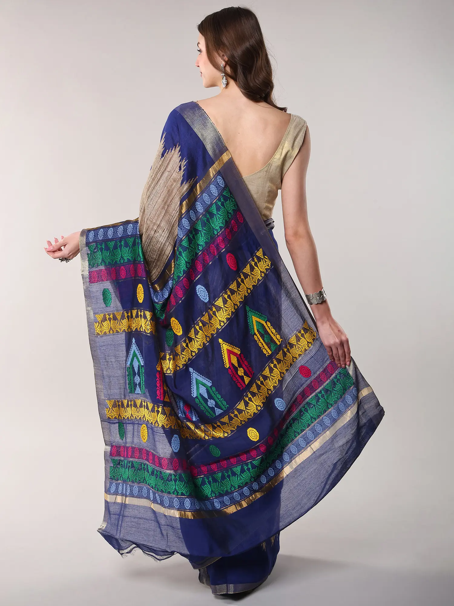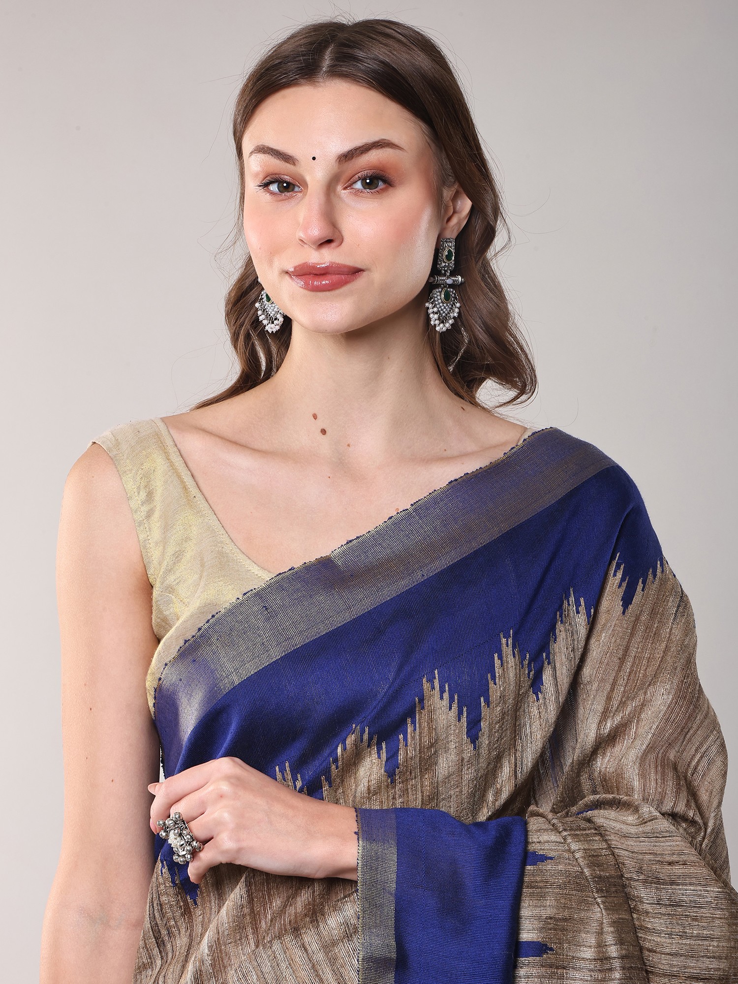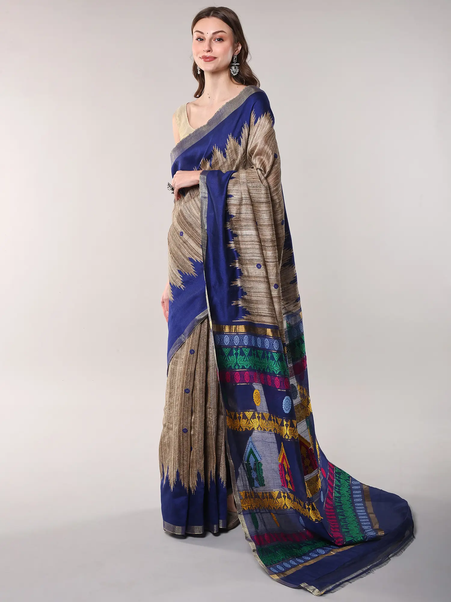 Trench-Coat Handloom Saree with Contrast Temple Border and woven Ethnic Motifs from Chhattisgarh