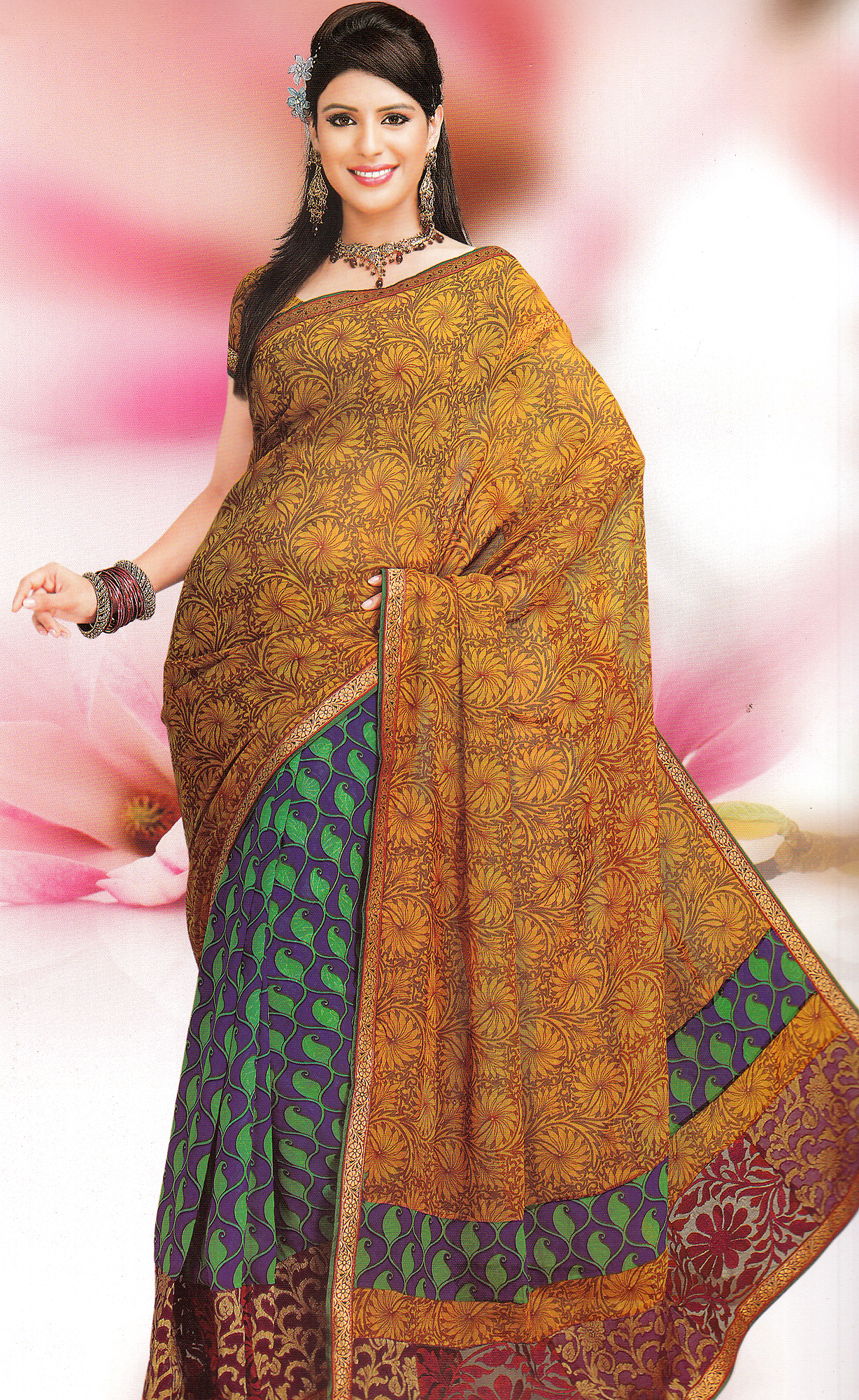 The saree features a mesmerizing tri-color palette, with the dominant color being a warm, inviting mustard yellow. This radiant hue is adorned with a detailed floral print in contrasting shades, creating a visually striking effect. The pattern is dense and intricate, lending an air of opulence and sophistication. As the saree unfolds, it reveals a captivating contrast with a bold section featuring a striking pattern of green paisley motifs against a deep purple background. This unique juxtaposition of prints and colors adds a contemporary twist to traditional Indian attire.