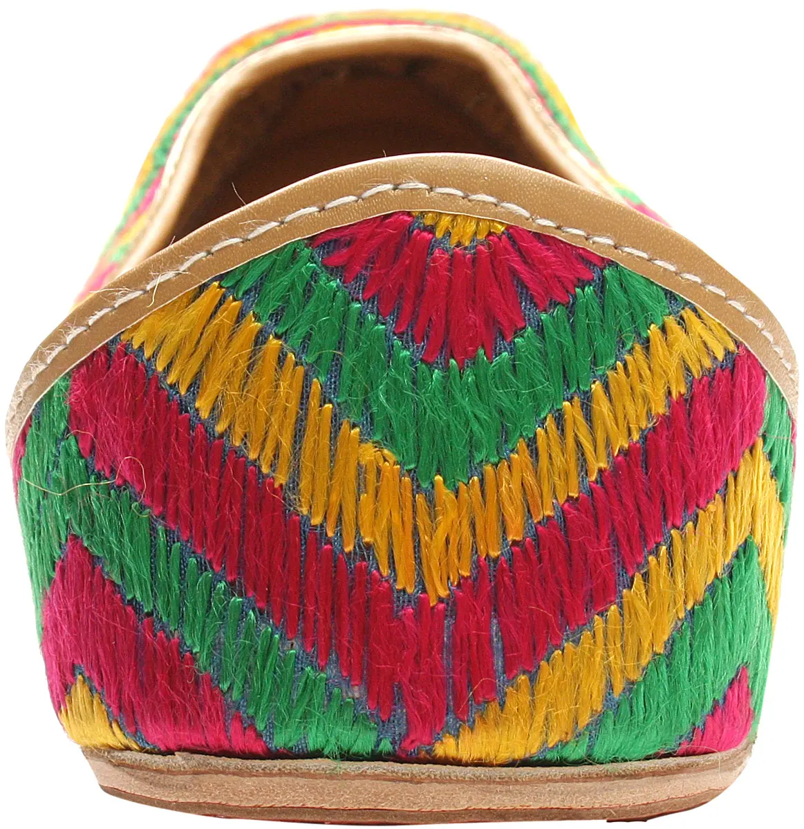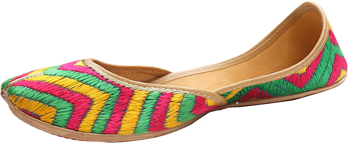 Celebrate the trinity of colors with our Tri-Color Phulkari Embroidered Jooti from Punjab. The vibrant combination of pink, green and yellow hues - embroidered in the phulkari tradition, creates a visual gift. Each color tells a story, blending seamlessly to form a cultural masterpiece. Slip into these jooties and let the tri-color embroidery become a statement of your appreciation for Punjab's artistic legacy, where every step is a brushstroke on the canvas of tradition.