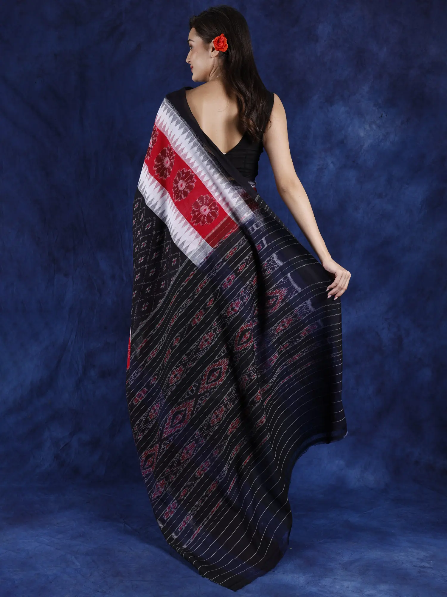 Meticulous weave continues on the pallu, where a majestic black overpowers while hints of red and white add the finishing touches to this sophisticated drape from Odisha.
