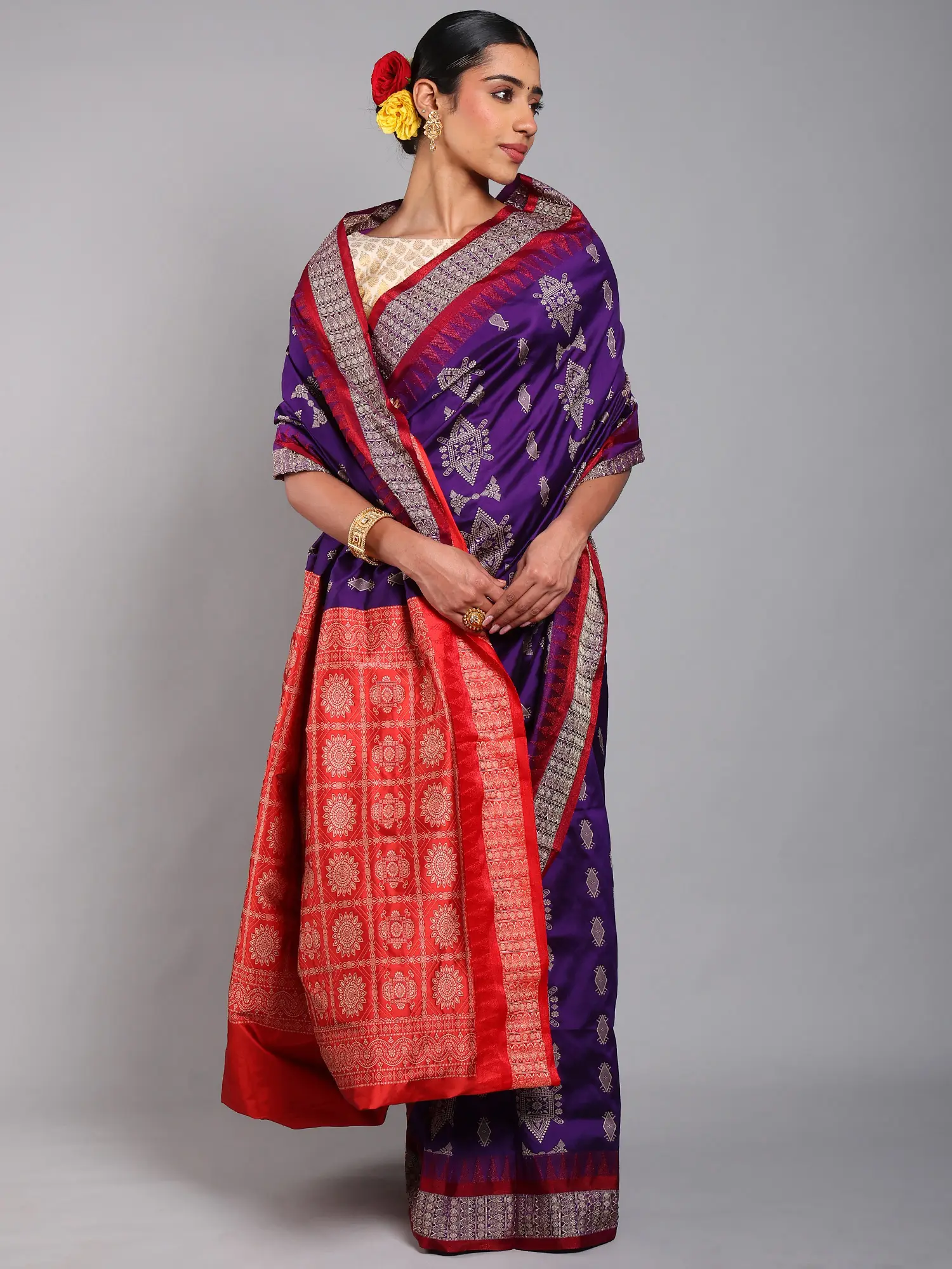Handpainted Pattachitra Art on Royal Blue Bomkai Silk Saree with Detailed Border
