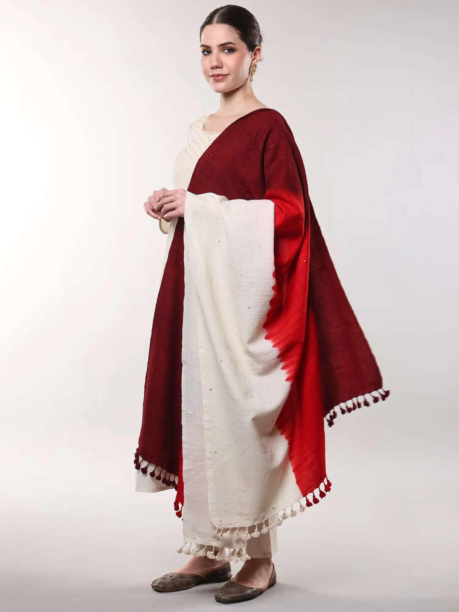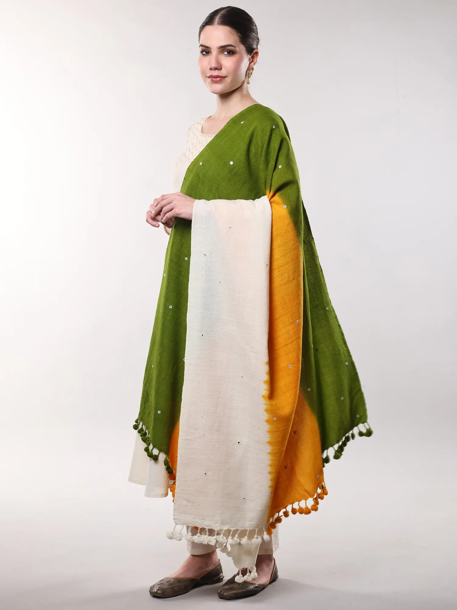 Triple Shaded Tie-Dye Shawl with Mirror Work and Pom-Poms Border from Gujarat