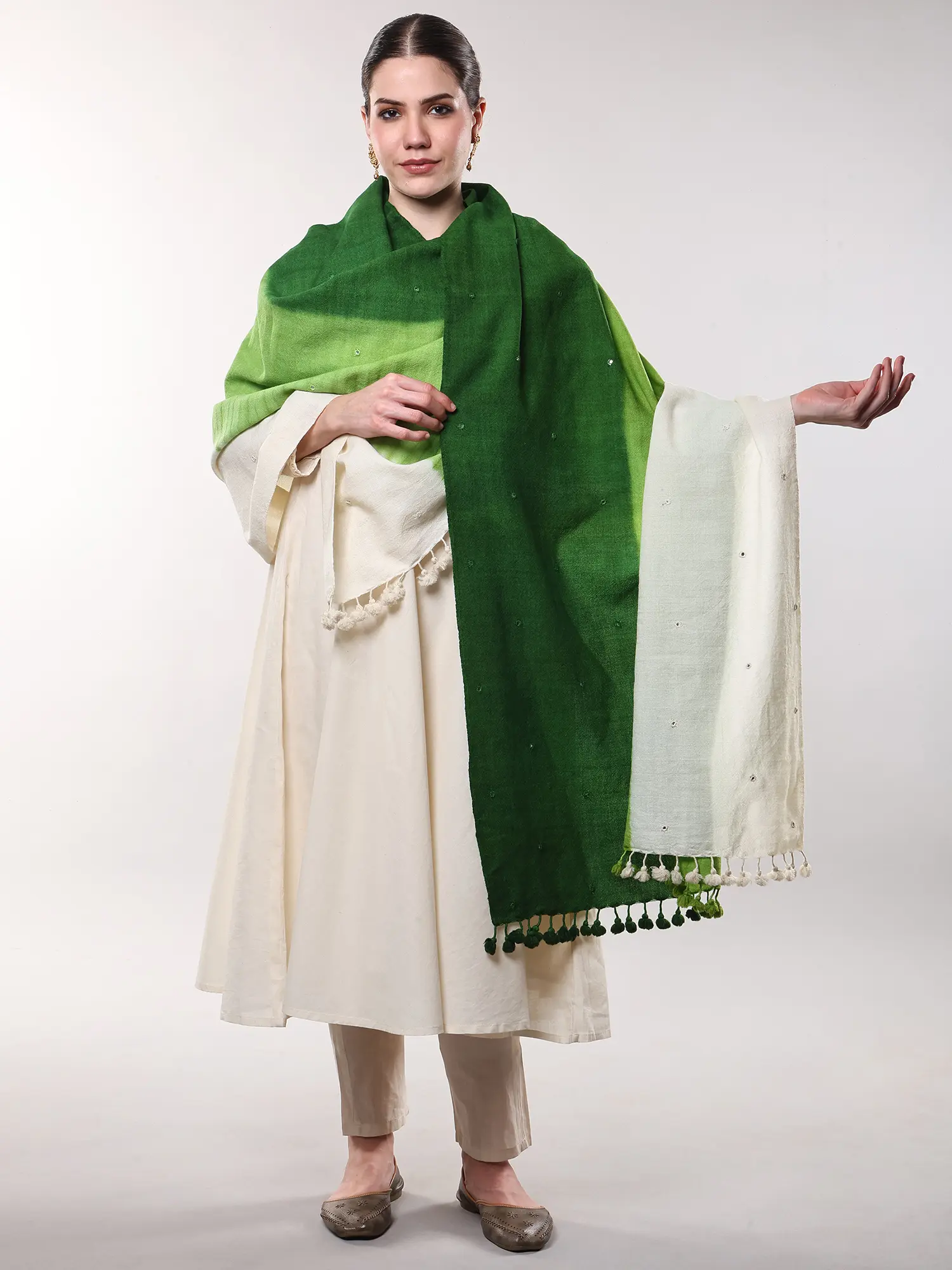 Observe the delicate shimmer as small, carefully placed mirrors catch the light, adding a subtle gleam to the rich wool. The border is adorned with playful, hand-tied pom-poms, a delightful flourish that speaks of a joyful artisan spirit. With a generous length of 82 inches and a width of 38 inches, it offers an expansive canvas for its artistry.