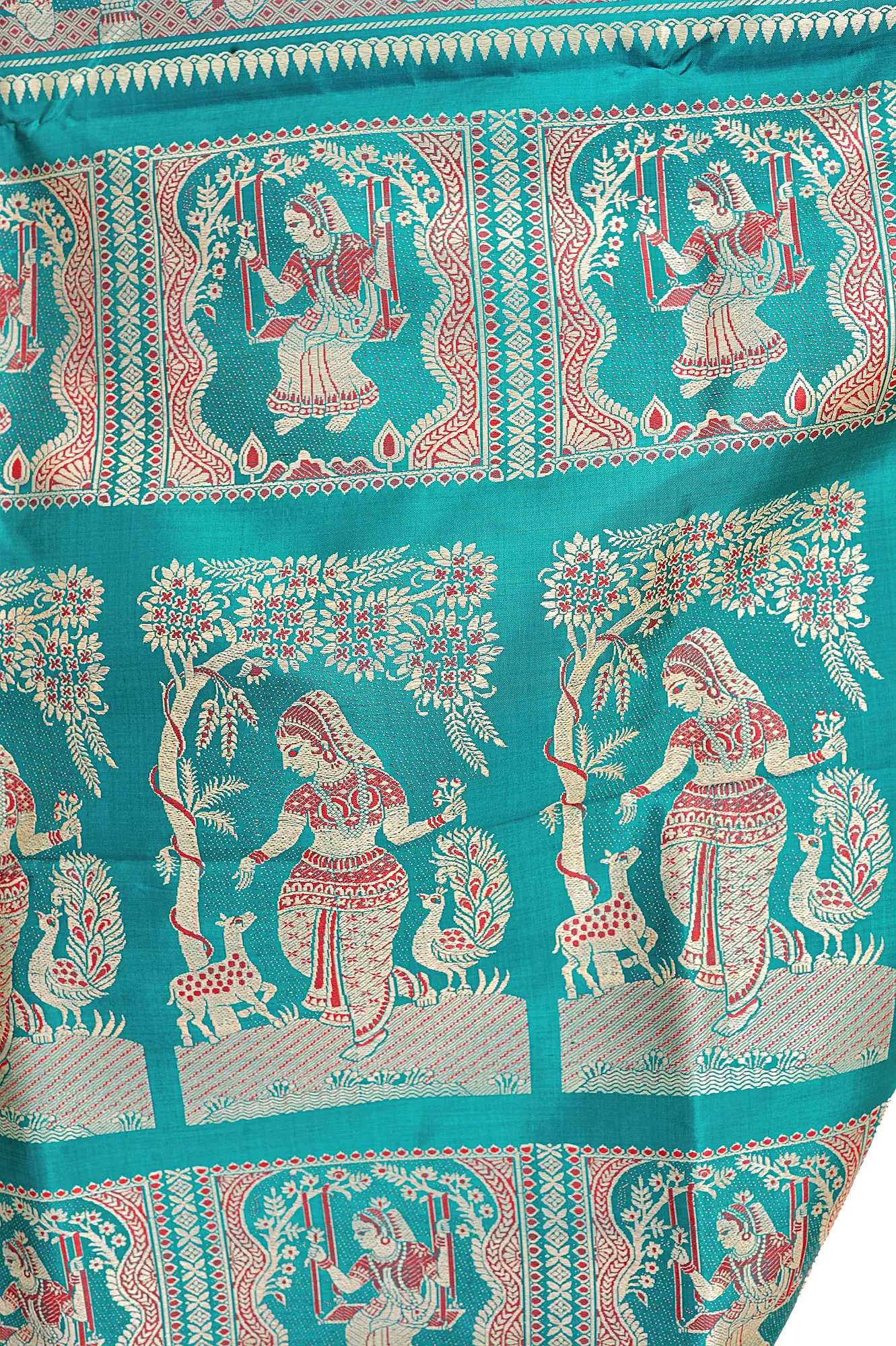 Bright Aqua-Green Baluchari Sari from Bengal with Hand Woven Dancing Apsaras on Aanchal