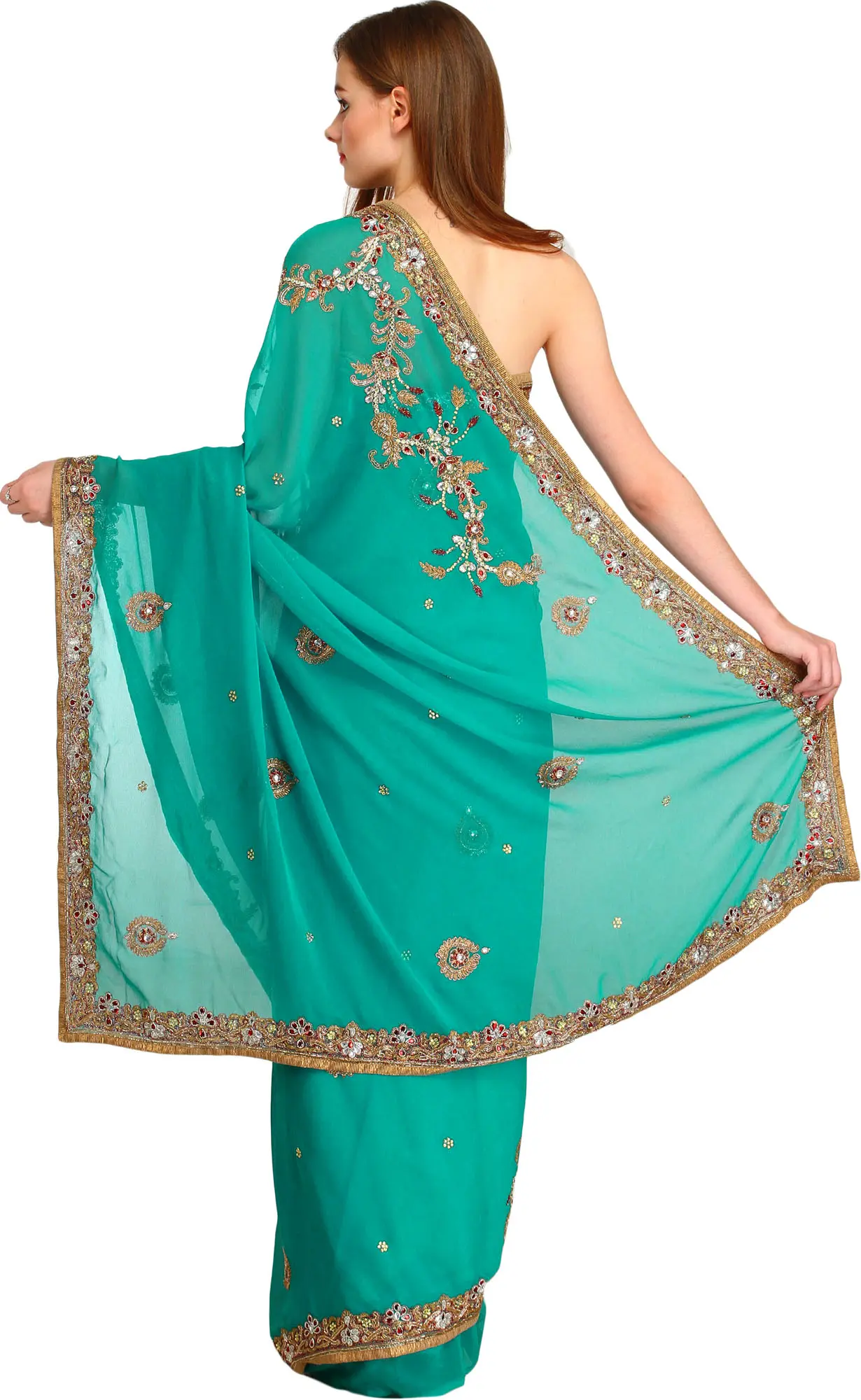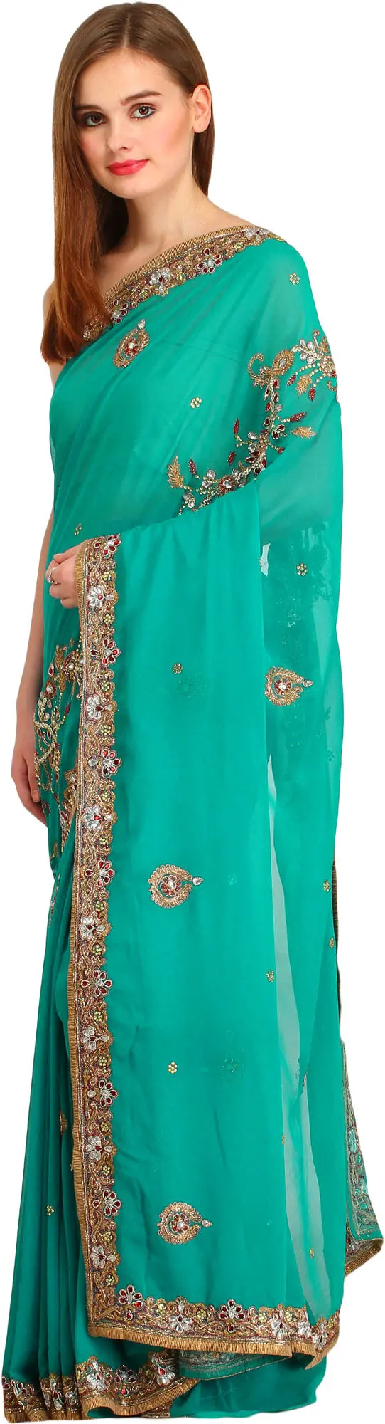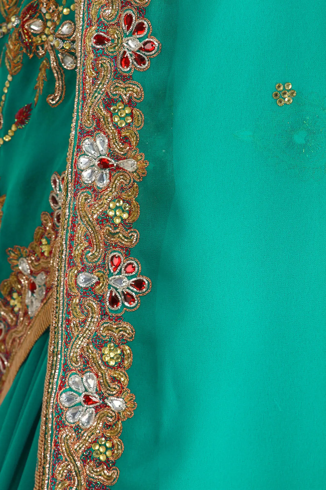 Crafted from premium georgette fabric, this sari offers a luxurious feel and a graceful drape. Georgette is renowned for its lightweight, airy texture and subtle sheen, which allows the fabric to flow beautifully, enhancing the wearer's silhouette. The material is comfortable to wear, ensuring you can celebrate and dance the night away with ease. The way the georgette drapes and moves complements the intricate embroidery, creating a harmonious blend of texture and sparkle.
