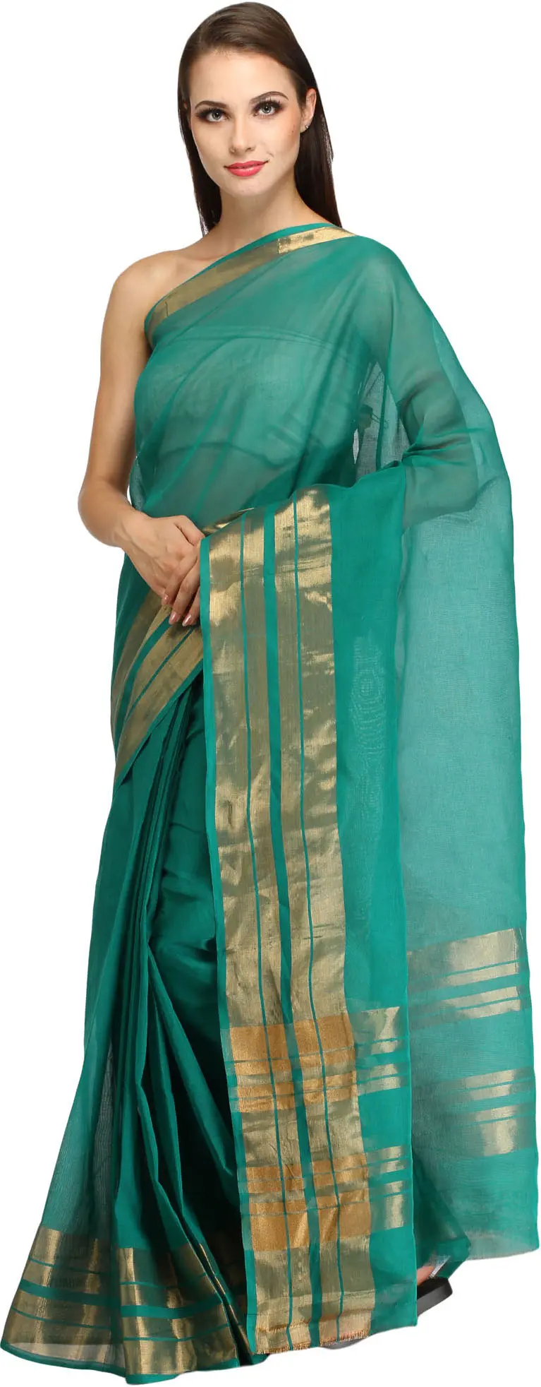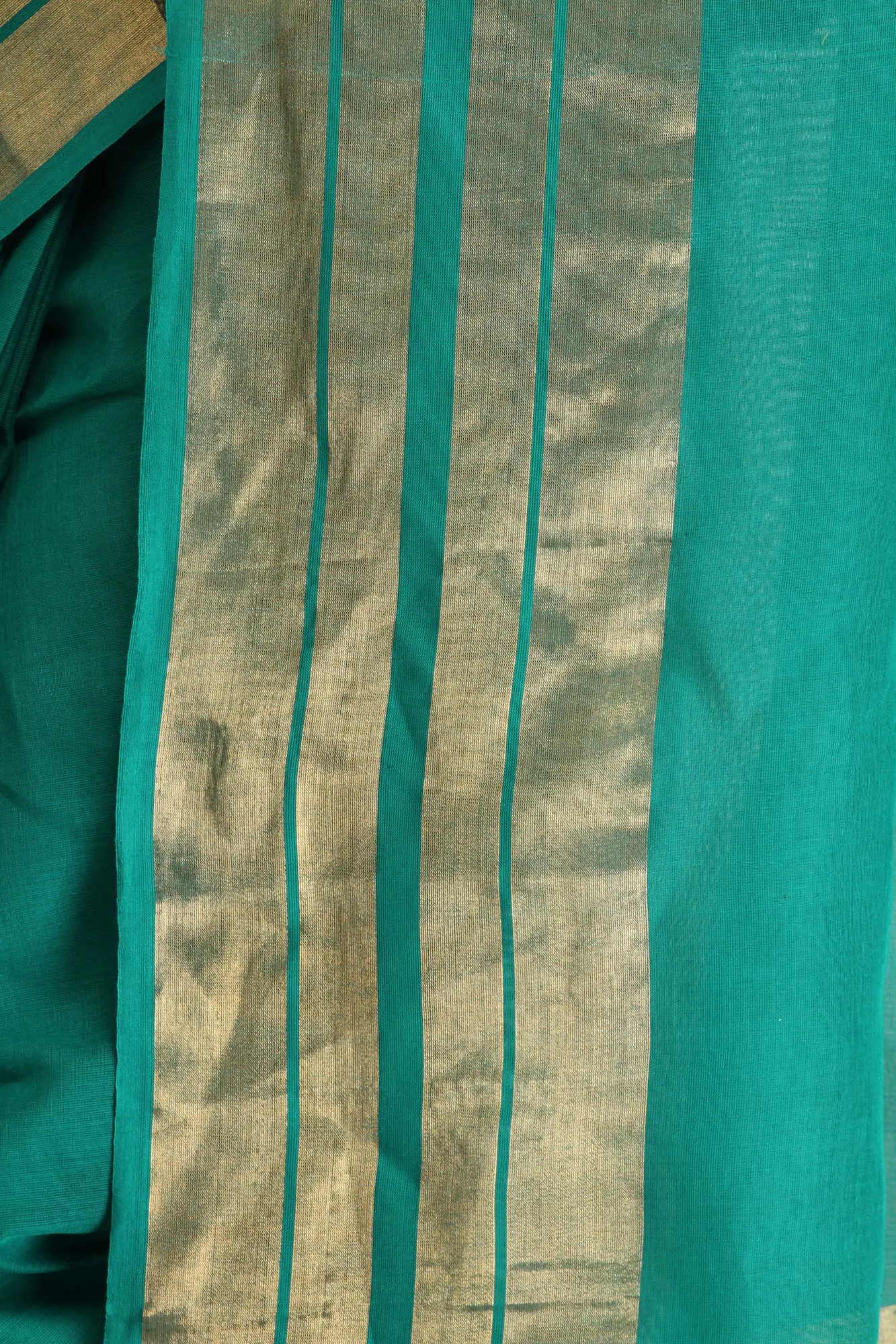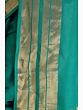 What truly elevates this saree is the captivating Zari weave adorning its border. The intricate gold threads are woven with precision, creating a striking contrast against the serene green backdrop. This traditional Zari work, a hallmark of Indian craftsmanship, adds a touch of opulence and celebratory spirit. The border features a delicate pattern of horizontal bands, interspersed with subtle square motifs, reflecting the rich heritage of Indian textile artistry. The sheen of the Zari catches the light beautifully, lending a subtle glamour to the overall design.