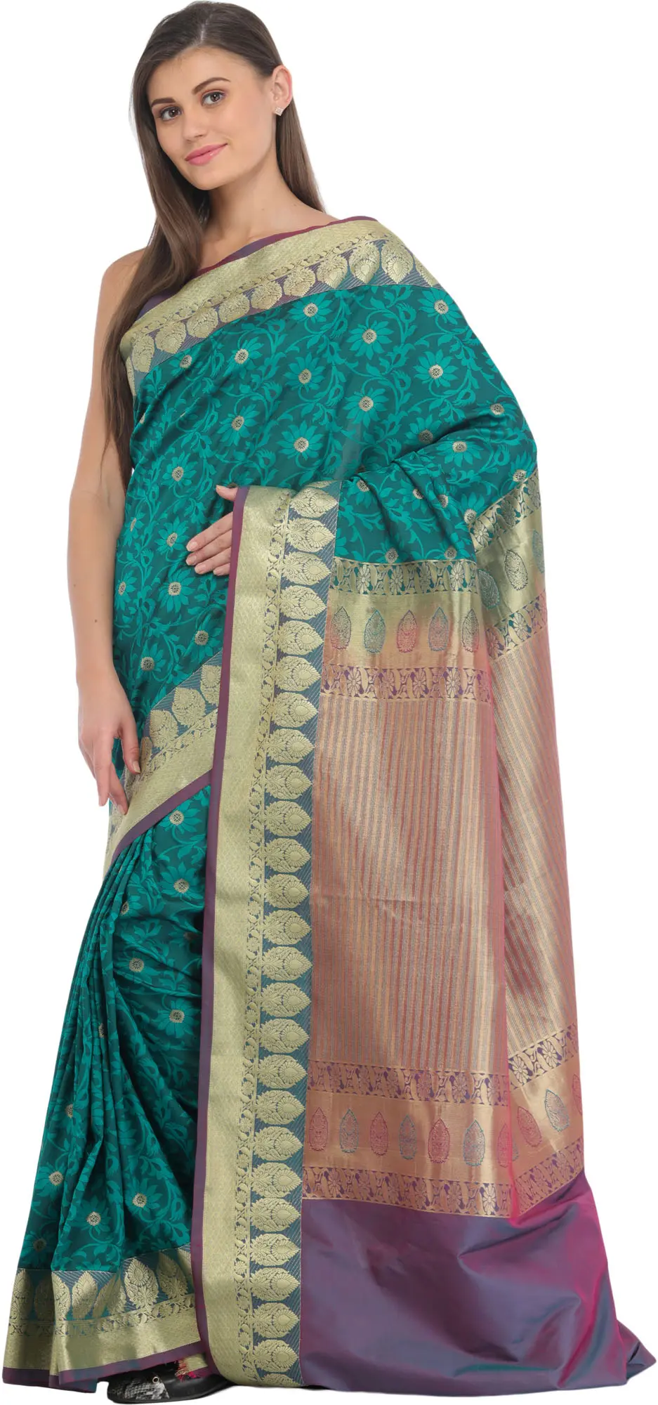Step into a world of refined beauty and traditional craftsmanship with this exquisite sari, a testament to the rich textile heritage of Bangalore. Crafted from the finest silk, this garment offers an unparalleled drape and a lustrous sheen that speaks volumes of its quality. The captivating tropical green hue evokes the vibrancy of nature, creating a stunning canvas for the intricate woven floral motifs that adorn the entire fabric. Each tiny bloom is meticulously rendered, lending a delicate yet dynamic texture to the sari, ensuring you'll catch every eye. ––––––––––––––––––––