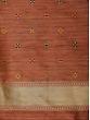 The soft hue of tropical peach appears exquisite due to the soft sheen of the linen, which is decorated with vibrant Mughal motifs spread all over the field of the saree.