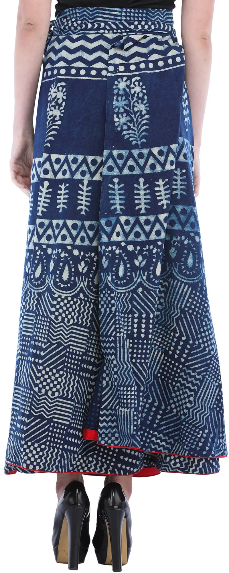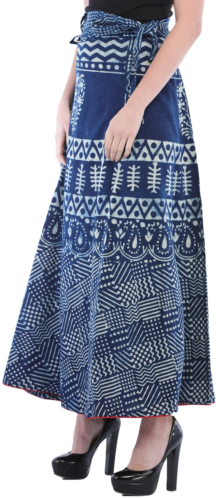 The design of this skirt is a testament to traditional textile artistry. Bands of geometric shapes, including zigzags and diamond patterns, create a dynamic visual rhythm. Interspersed among these are stylized representations of leaves and trees, hinting at natural elements. The central focus is a beautiful, hand-printed floral design, rendered in a contrasting off-white against the deep blue. This combination of motifs evokes a sense of bohemian chic and heritage, offering a unique aesthetic that stands out from mass-produced fashion. The wrap-around style allows for an adjustable and flattering fit for a wide range of body types, ensuring both comfort and a graceful drape.