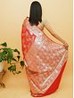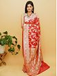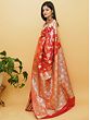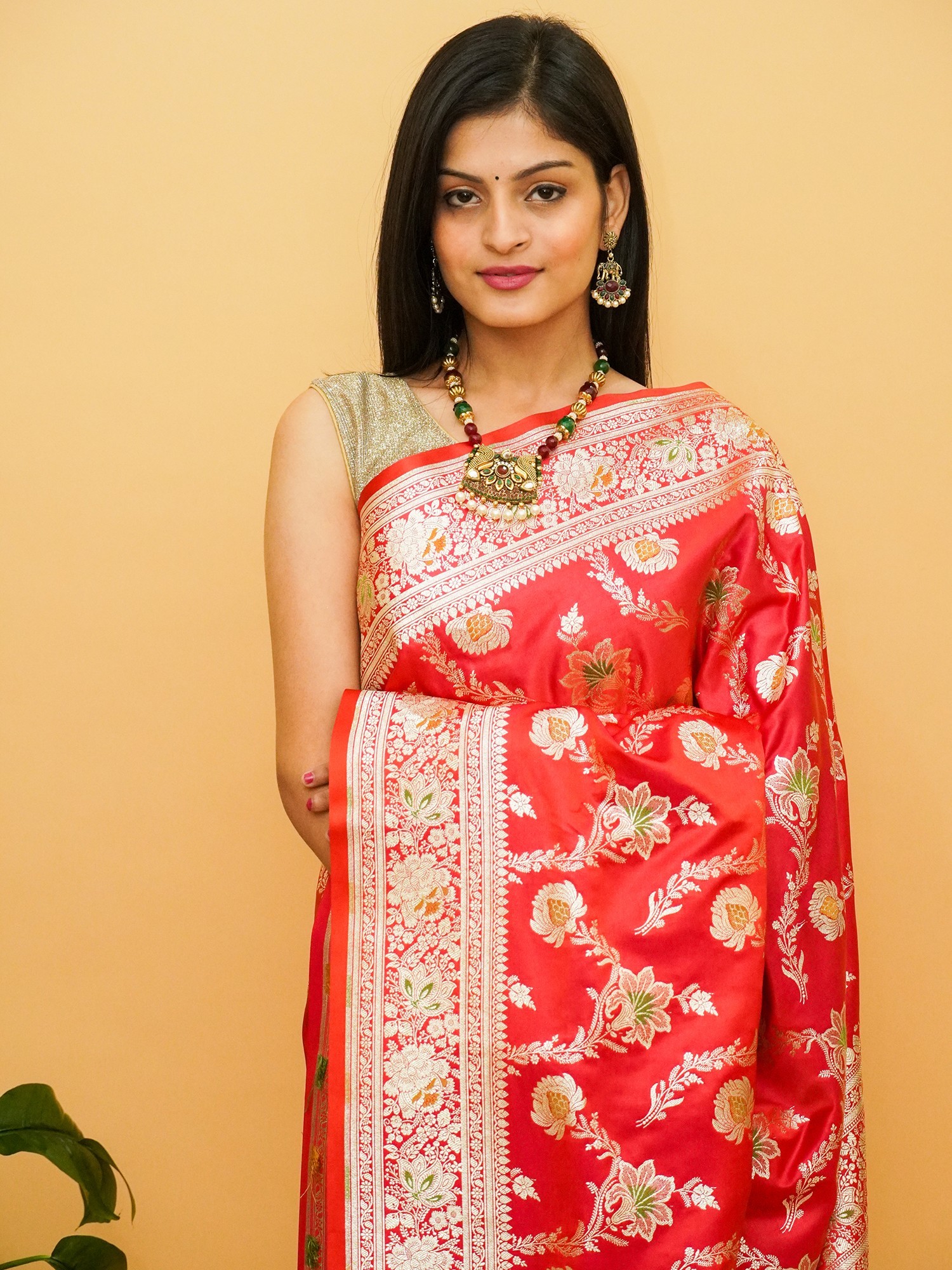 This true-red Satin silk saree is the solution for the ladies who seek an elegant yet exquisite Banarasi saree for a wedding. The field of the saree is ornamented with blossomed hibiscus flowers, which symbolize beauty and abundance. These blossoms, also known as Japakusum are often offered to goddess Durga, the great Hindu mother goddess who is believed to love a red saree. An intricately crafted floral vine flower on the border and a floral Jaal or network of creepers embellishes the field. The motifs on the saree are tinged with green and orange hues with the use of Resham or silk threads, which adds a soft loveliness to the drape.