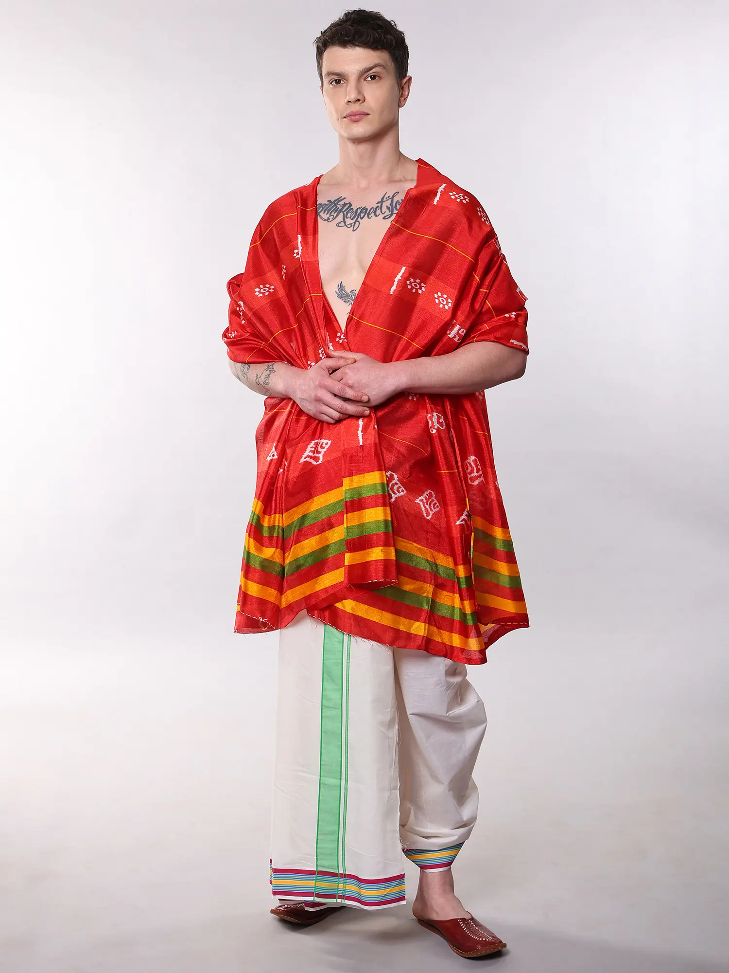 Traditional Temple Border Dhoti & Shoulder Cloth Set - Art Silk Ikat