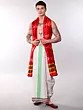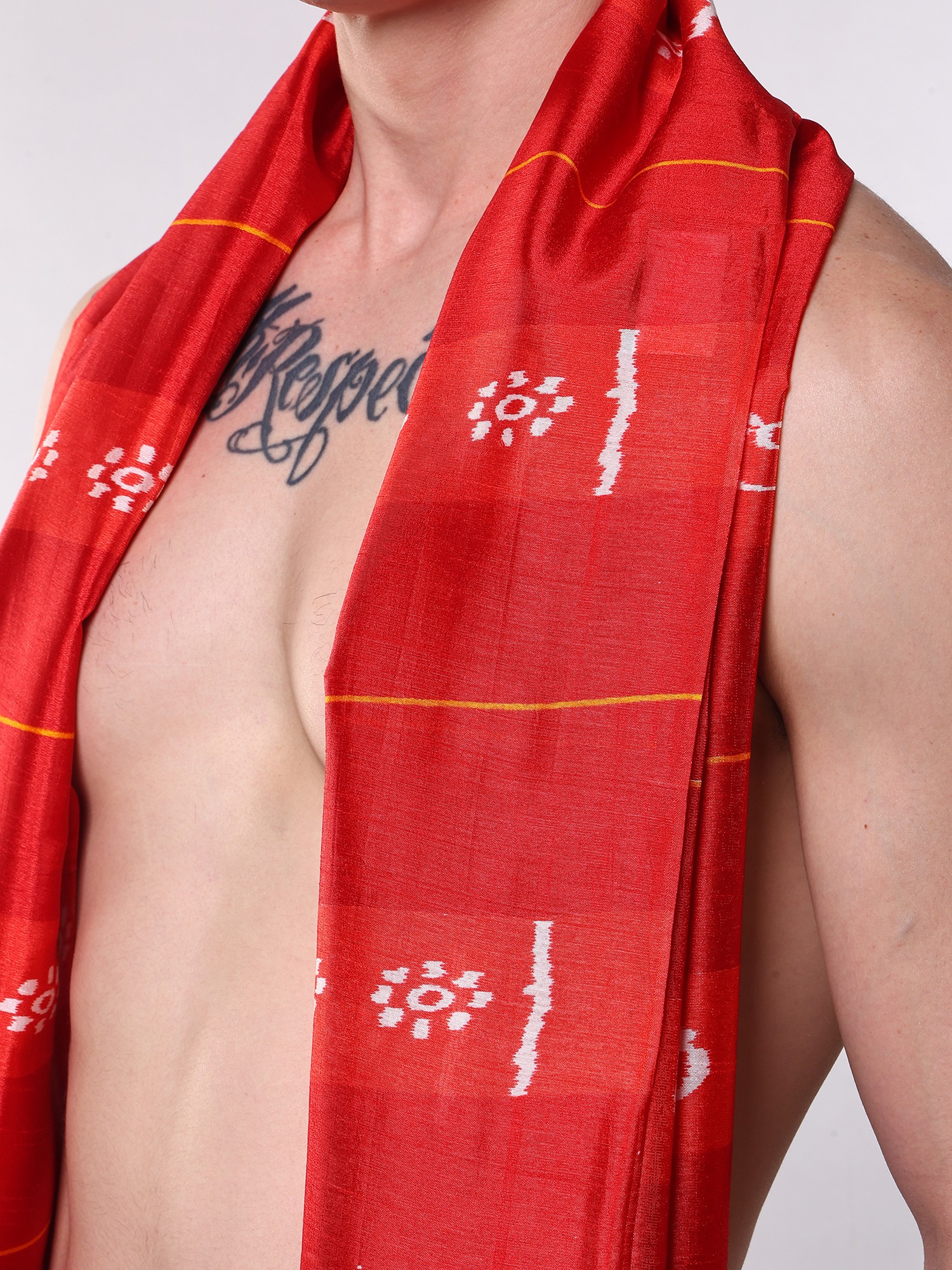 True-Red Tussar Silk Angavastram with Printed Religious Symbols and Multicolor Border