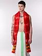 The vibrant true-red hue forms a captivating base, complemented by a striking multicolor border featuring bands of yellow, green, and red. This generous expanse, measuring 92 inches in length and 45 inches in width, allows for versatile draping and a commanding presence. The subtle interplay of printed motifs and the contrasting border adds depth and visual interest, making it a true work of textile art.