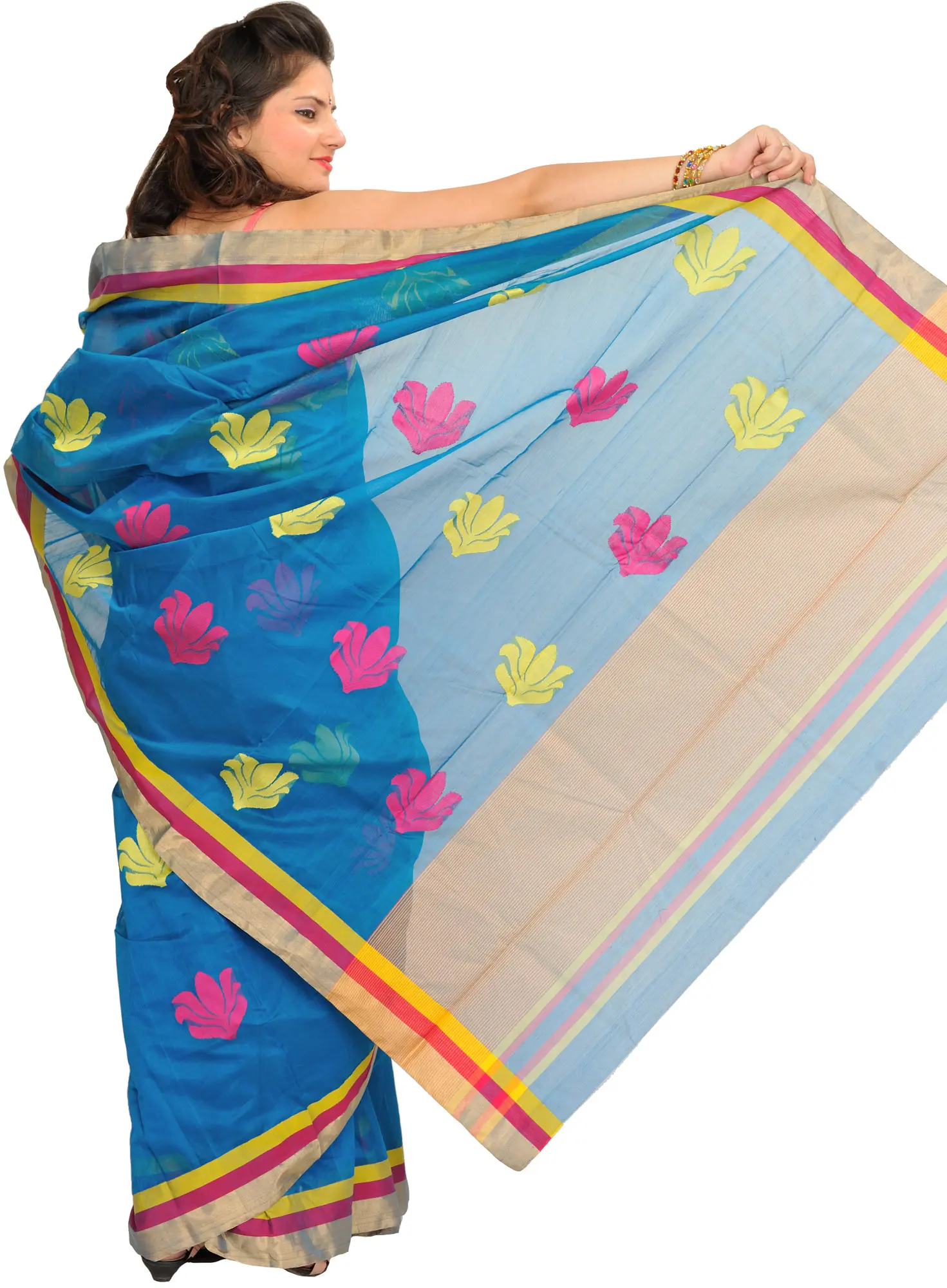 The bliss of draping a Chanderi saree can be experienced with this splendid blue cotton silk saree, with an enchanting and bold lotus pattern added to its field and a broad border in pink, yellow, and golden stripes bringing a timeless charm to the drape. The color scheme and fabric of the saree make it a lovely attire, giving you the comfort and appeal you seek for the special occasion.