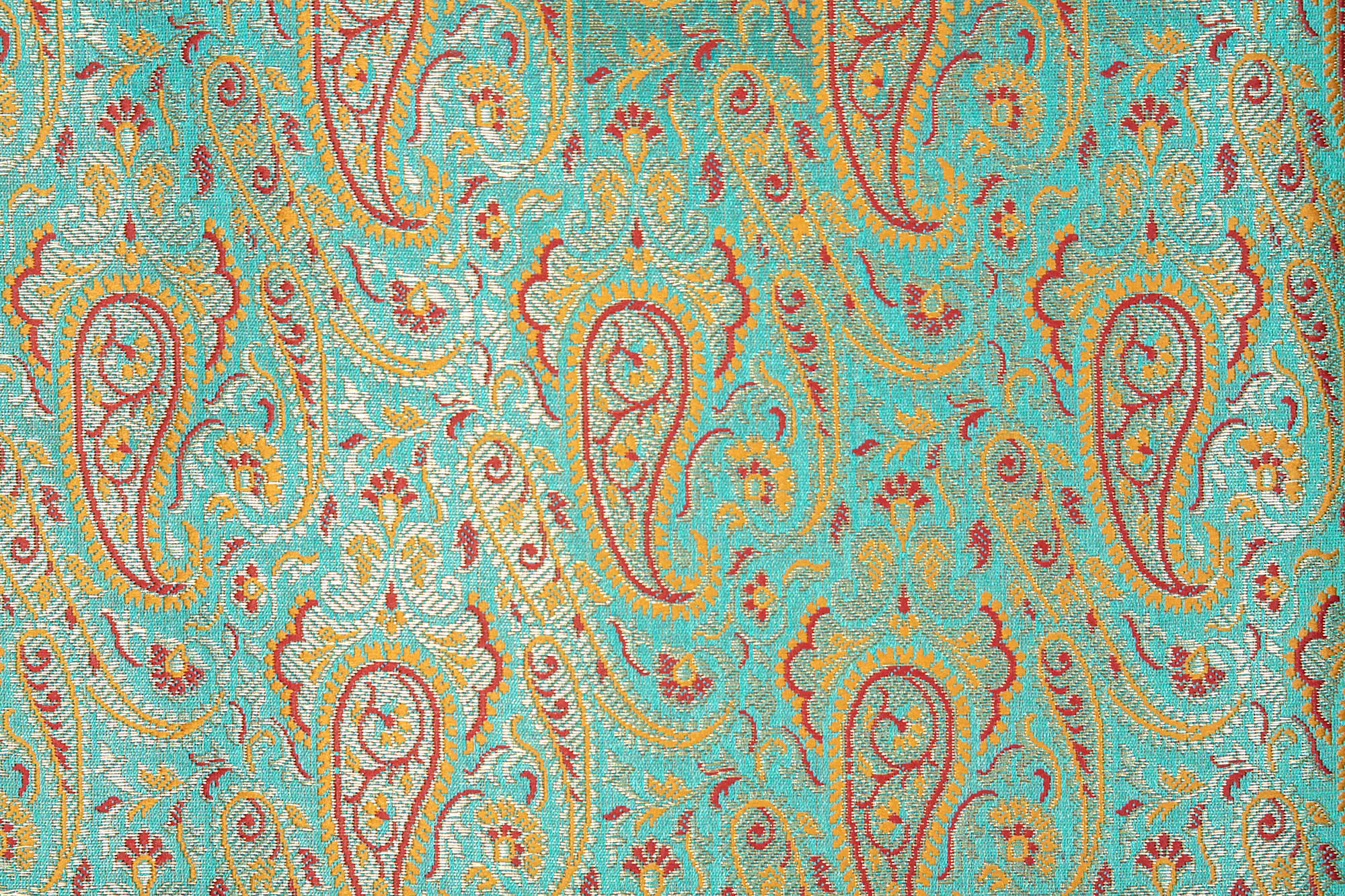 Dive into the depths of elegance with the Turquoise-Blue Fabric from Banaras, adorned with paisleys woven in resplendent golden thread. This textile is a manifestation of the age-old Banarasi tradition, where every thread is an ode to the artistic legacy passed down through generations. The tranquil turquoise-blue hue, reminiscent of serene waters, serves as a canvas for the intricate golden paisleys that dance across the fabric. As you caress the fabric, you can feel the essence of Banaras, a city where craftsmanship meets poetry.