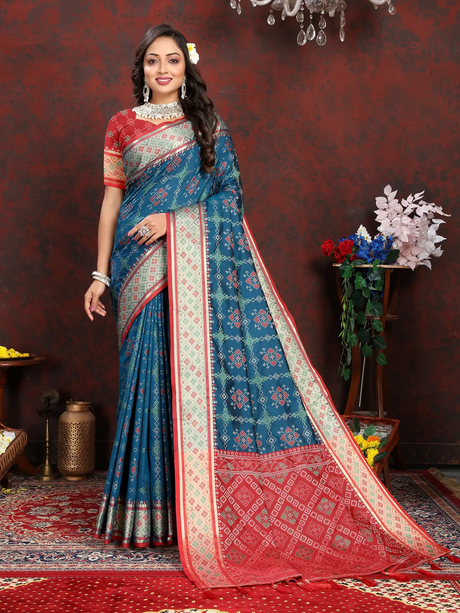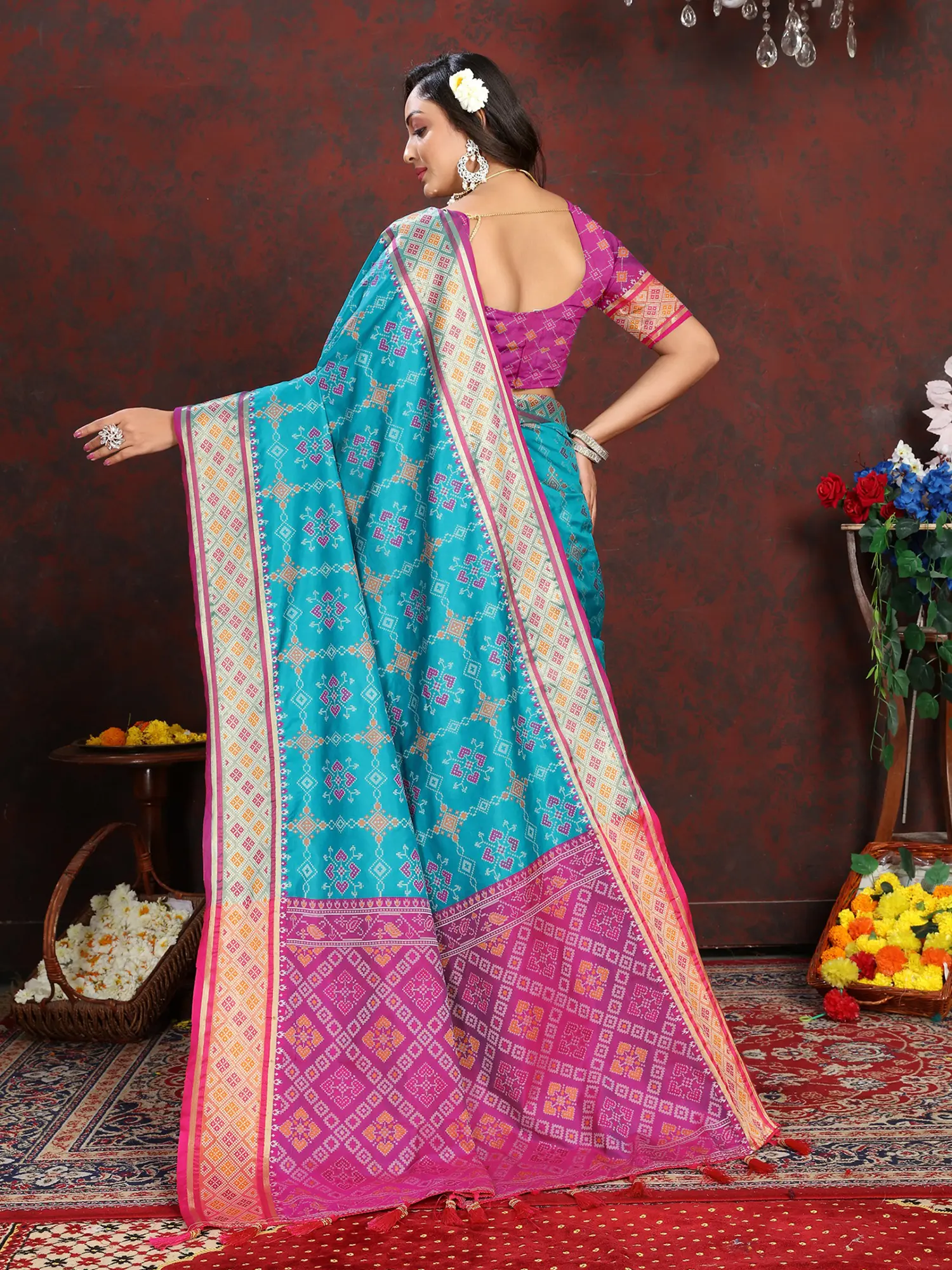 The true artistry of this saree lies in its detailed weaving. Each motif is rendered with precision, showcasing a remarkable interplay of colors and geometric designs that add depth and dimension to the fabric. The pallu, a significant element of the saree, is adorned with charming tassels, lending a playful yet refined finish. These delicate additions not only enhance the aesthetic appeal but also add a graceful sway with every movement, making you the center of attention at any event. The contrasting border further accentuates the richness of the silk, framing the elaborate patterns with a touch of opulence.
